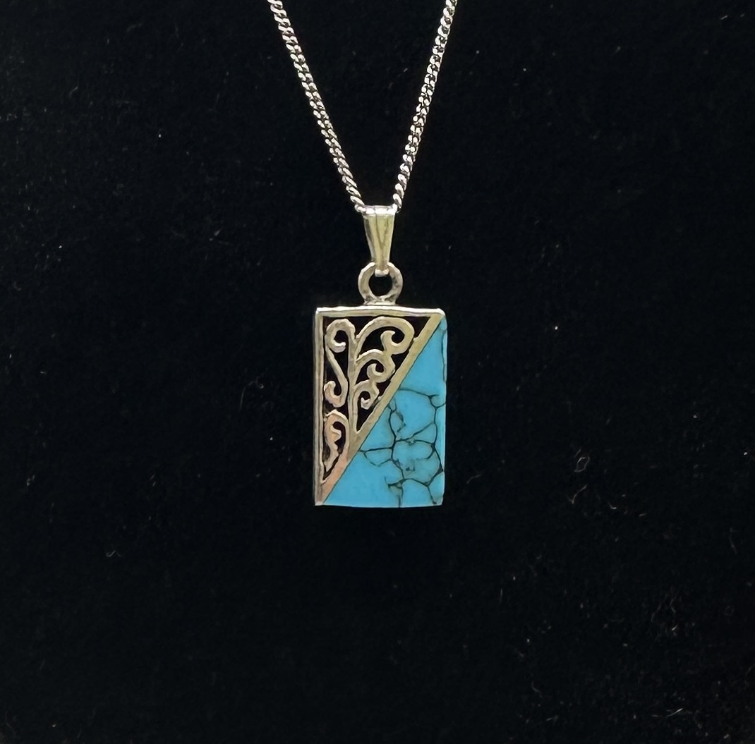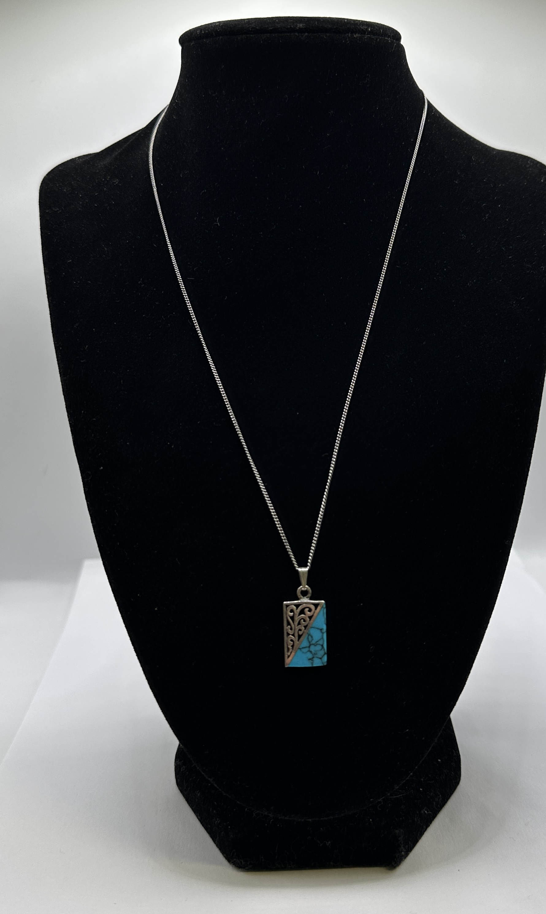 A necklace featuring a rectangular pendant suspended from a fine link chain, both constructed from 925 silver. The pendant is designed with a diagonal division; one section features openwork scrollwork filigree, while the opposing section contains a turquoise inlay. The turquoise exhibits a blue-green hue with visible dark, web-like matrix patterns. The pendant is attached to the chain via a polished tapered bale. No hallmarks or maker’s marks are visible on the piece.
