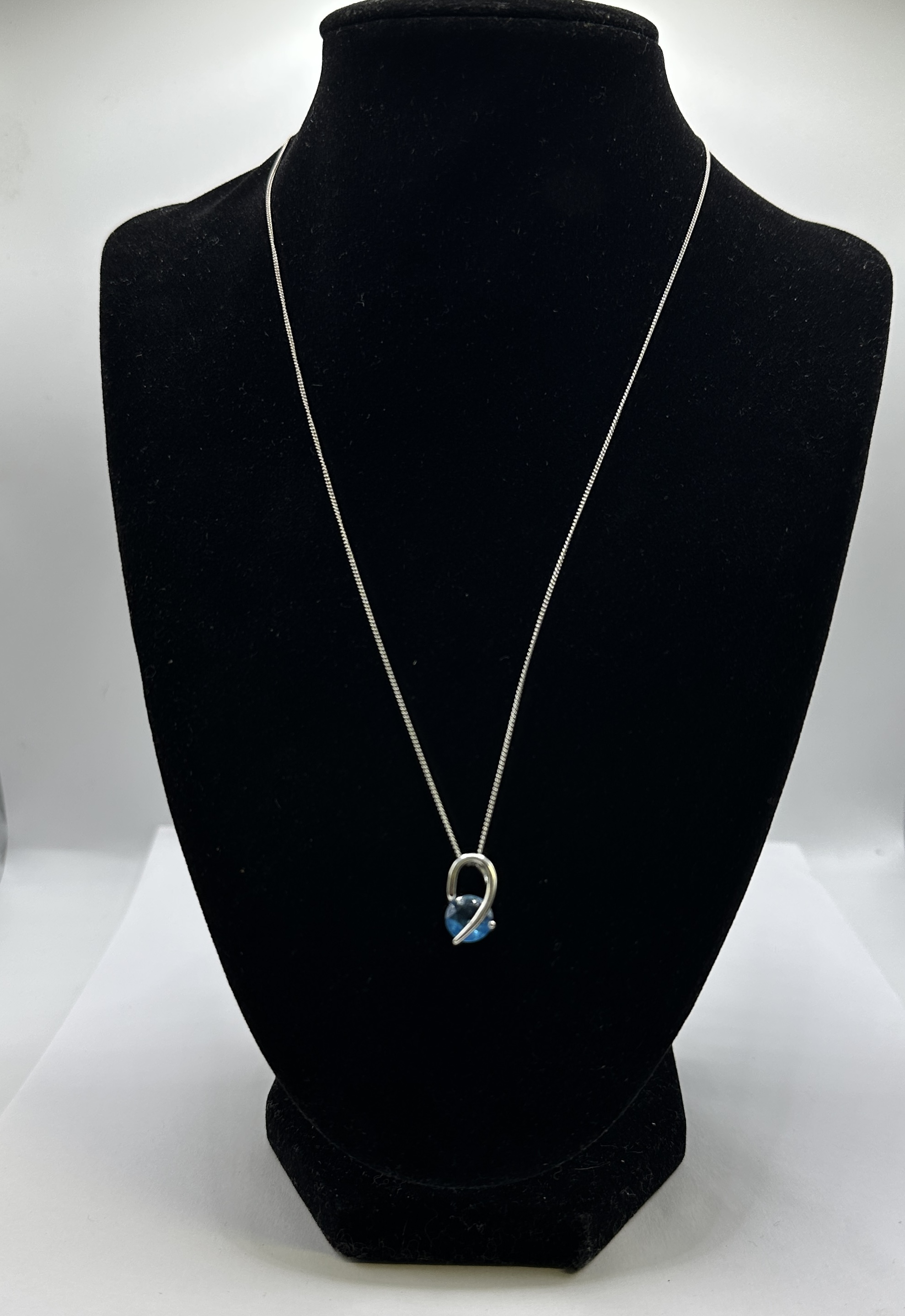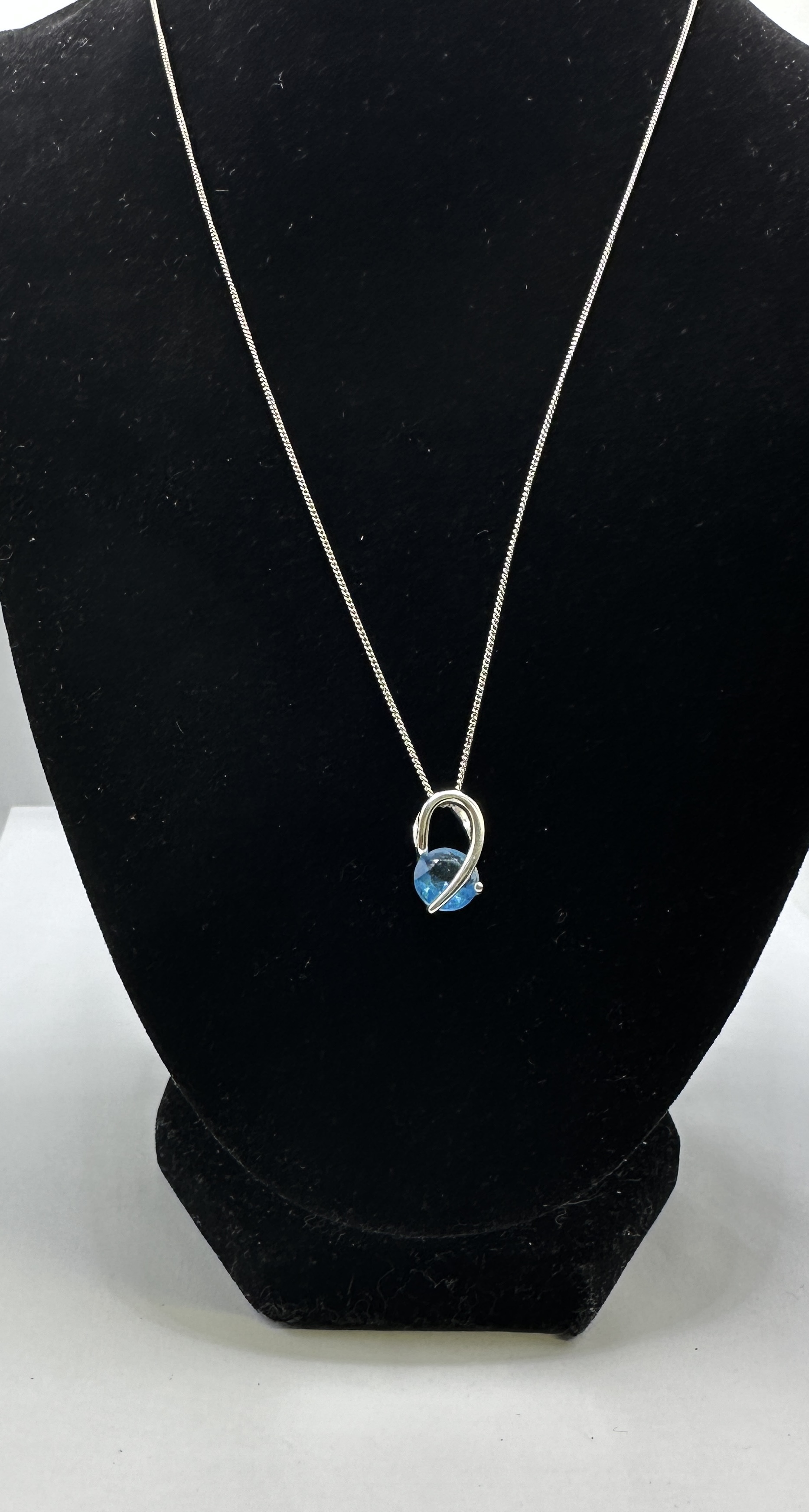A contemporary pendant necklace featuring a single round faceted blue stone. The pendant is constructed from 925 silver in a minimalist design, featuring a polished swirling ribbon of metal that partially encircles and secures the gemstone. The pendant is suspended from a matching 925 silver fine-link chain. No hallmarks or inscriptions are visible.