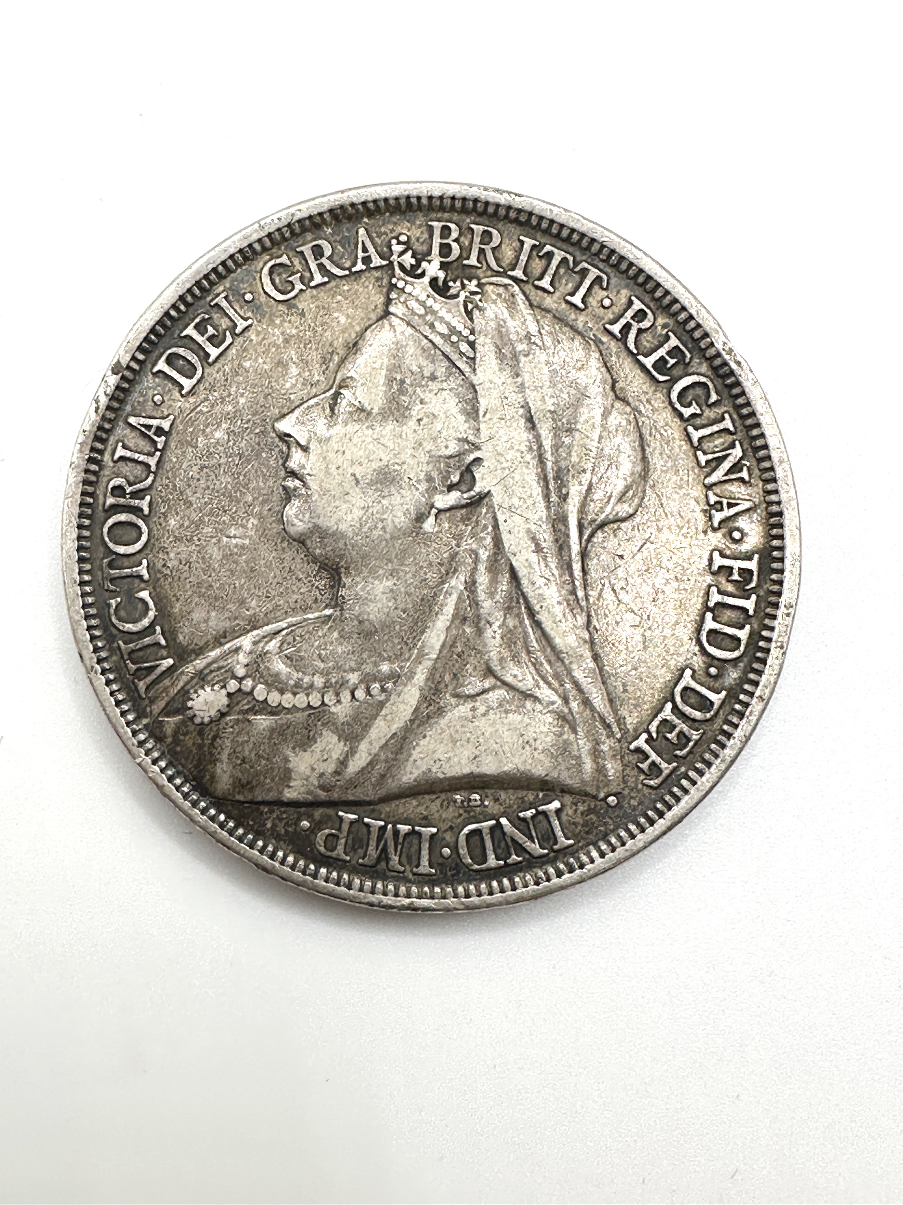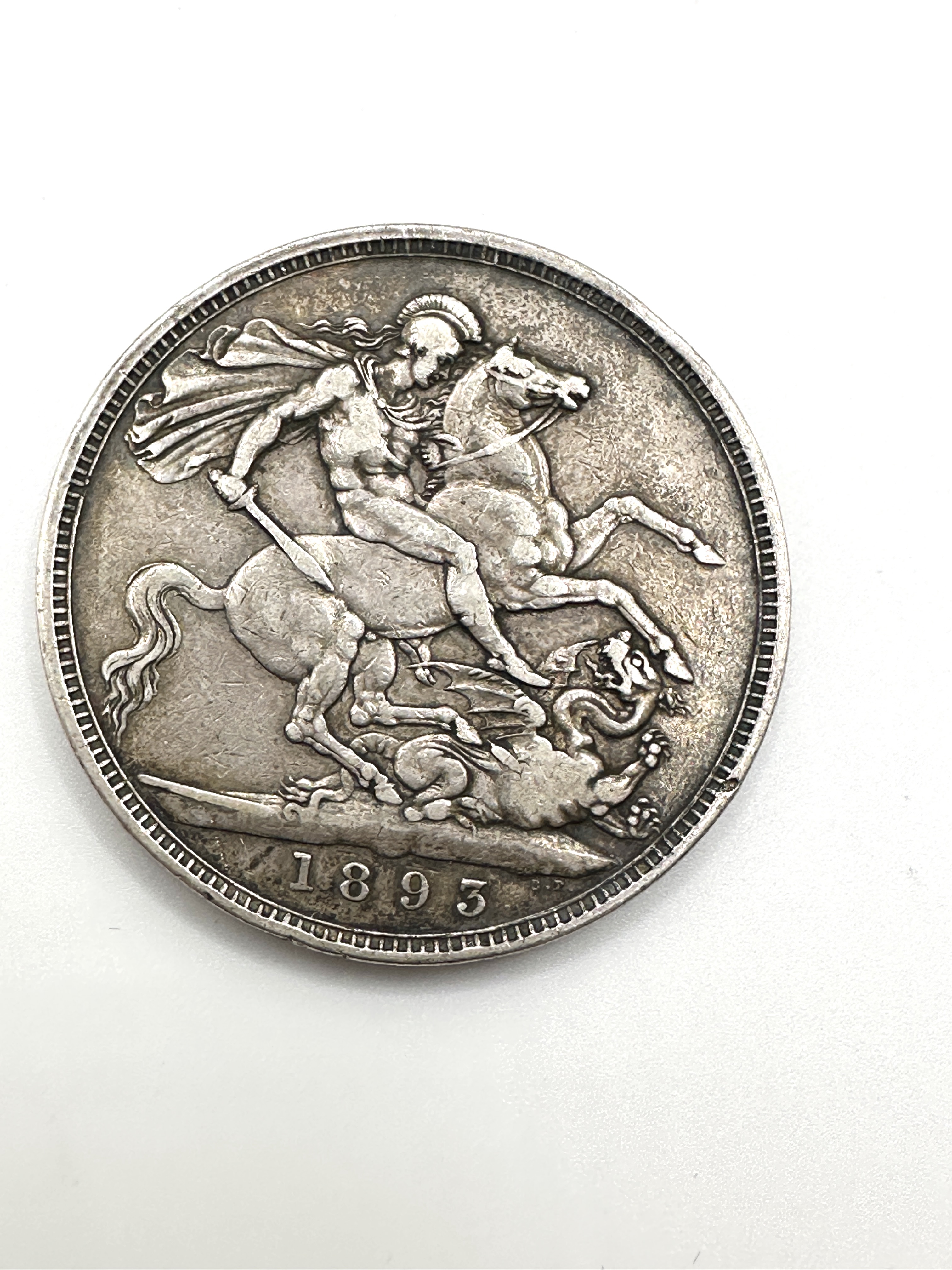 A single late-Victorian era British Crown coin, dated 1893. Struck in silver, the obverse features the Jubilee Head portrait of Queen Victoria, veiled and diademed, encircled by the Latin legend VICTORIA DEI GRA* BRITT REGINA FID DEF IND IMP (Victoria, by the Grace of God, Queen of the Britons, Defender of the Faith, Empress of India). The reverse displays Benedetto Pistrucci’s iconic design of St. George on horseback slaying the Dragon, with the date 1893 centred below the exergue line. The coin has a standard milled edge.