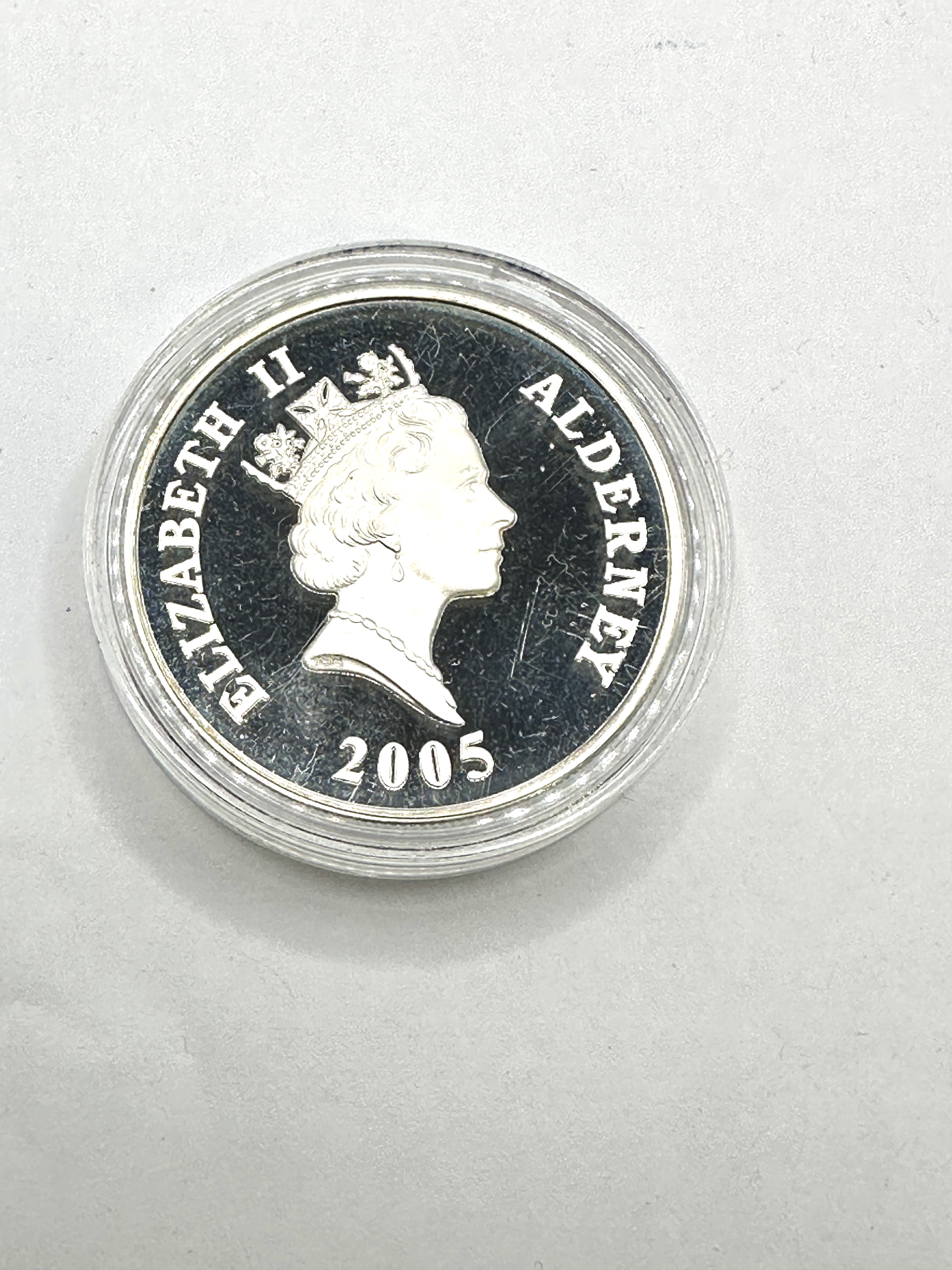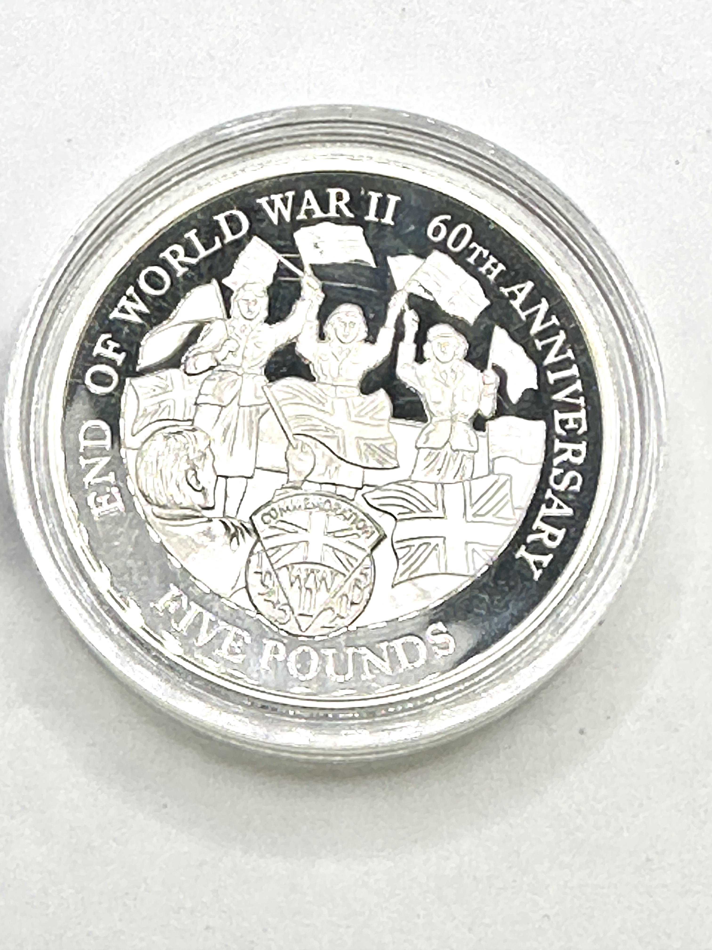 An Alderney five pound commemorative coin struck in 925 silver to mark the 60th anniversary of the end of World War II. The obverse features the right-facing portrait of Queen Elizabeth II with the inscriptions ELIZABETH II, ALDERNEY, and the year 2005. The reverse depicts several figures celebrating with flags and a shield marked COMMEMORATION, surrounded by the text END OF WORLD WAR II 60th ANNIVERSARY and the denomination FIVE POUNDS. The coin is struck with a proof finish, exhibiting mirror-like fields and frosted relief. It is presented within a clear plastic protective capsule.