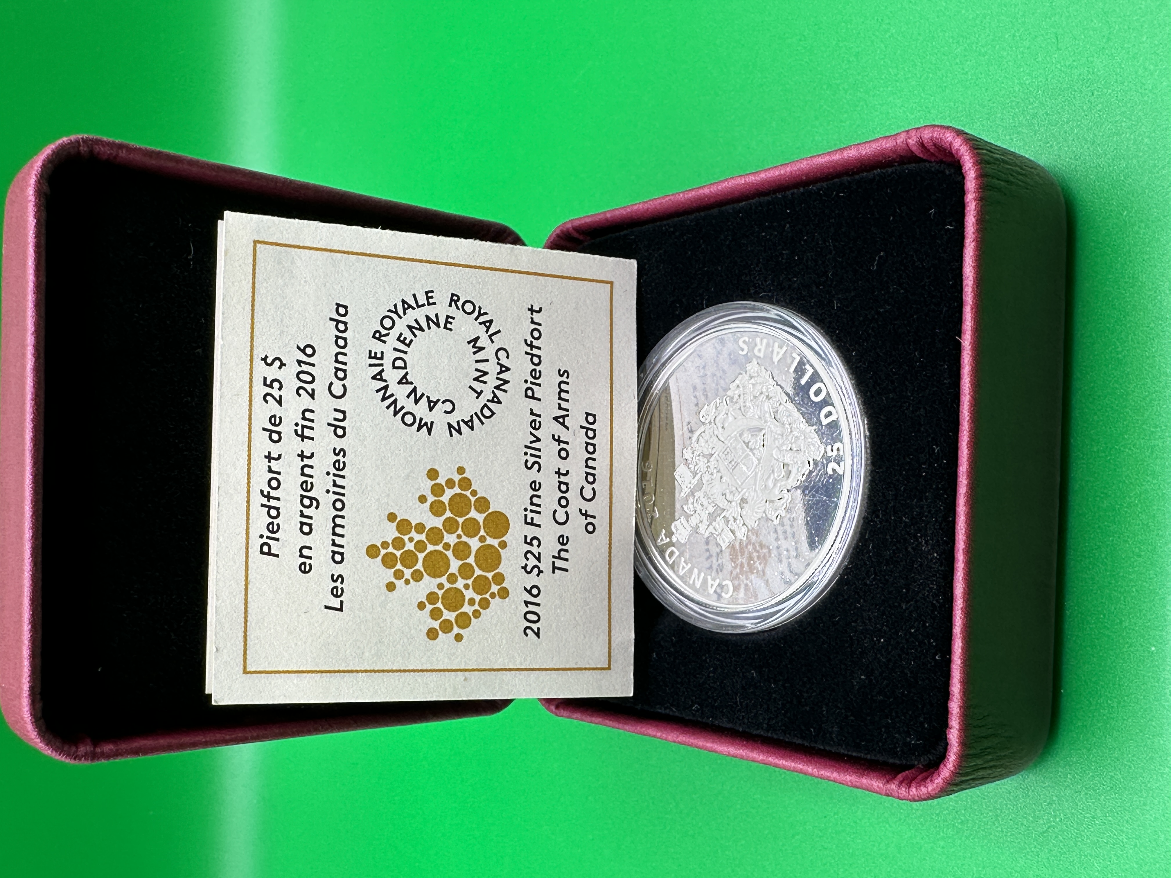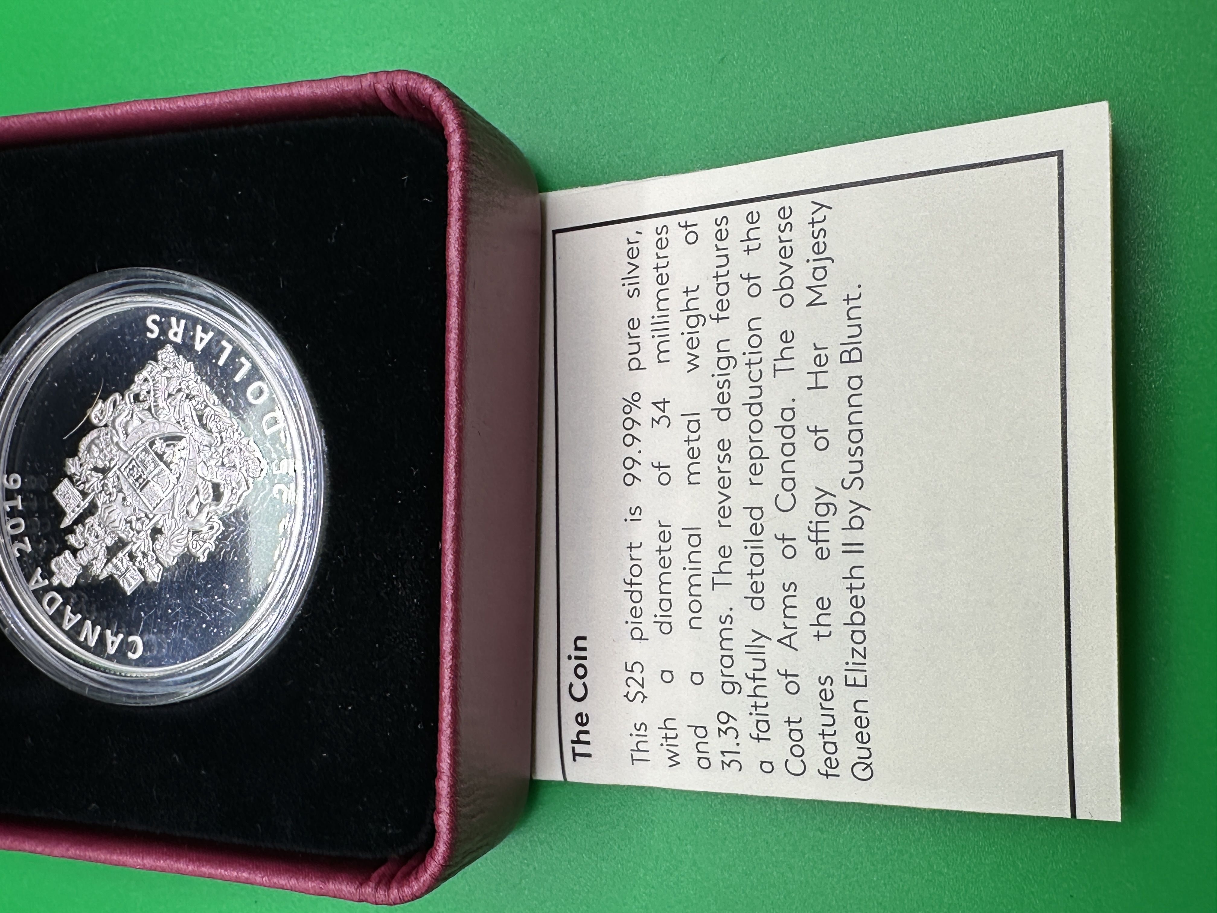 A 2016 Royal Canadian Mint 25 dollar silver piedfort coin featuring the Coat of Arms of Canada. The coin is struck from 925 silver. The reverse design depicts the Canadian Coat of Arms, while the obverse displays the effigy of Queen Elizabeth II by Susanna Blunt. The item is presented in its original burgundy-toned, hinged presentation case with a black velvet interior and is accompanied by a bilingual certificate of authenticity in English and French. The coin is housed within a clear protective plastic capsule.