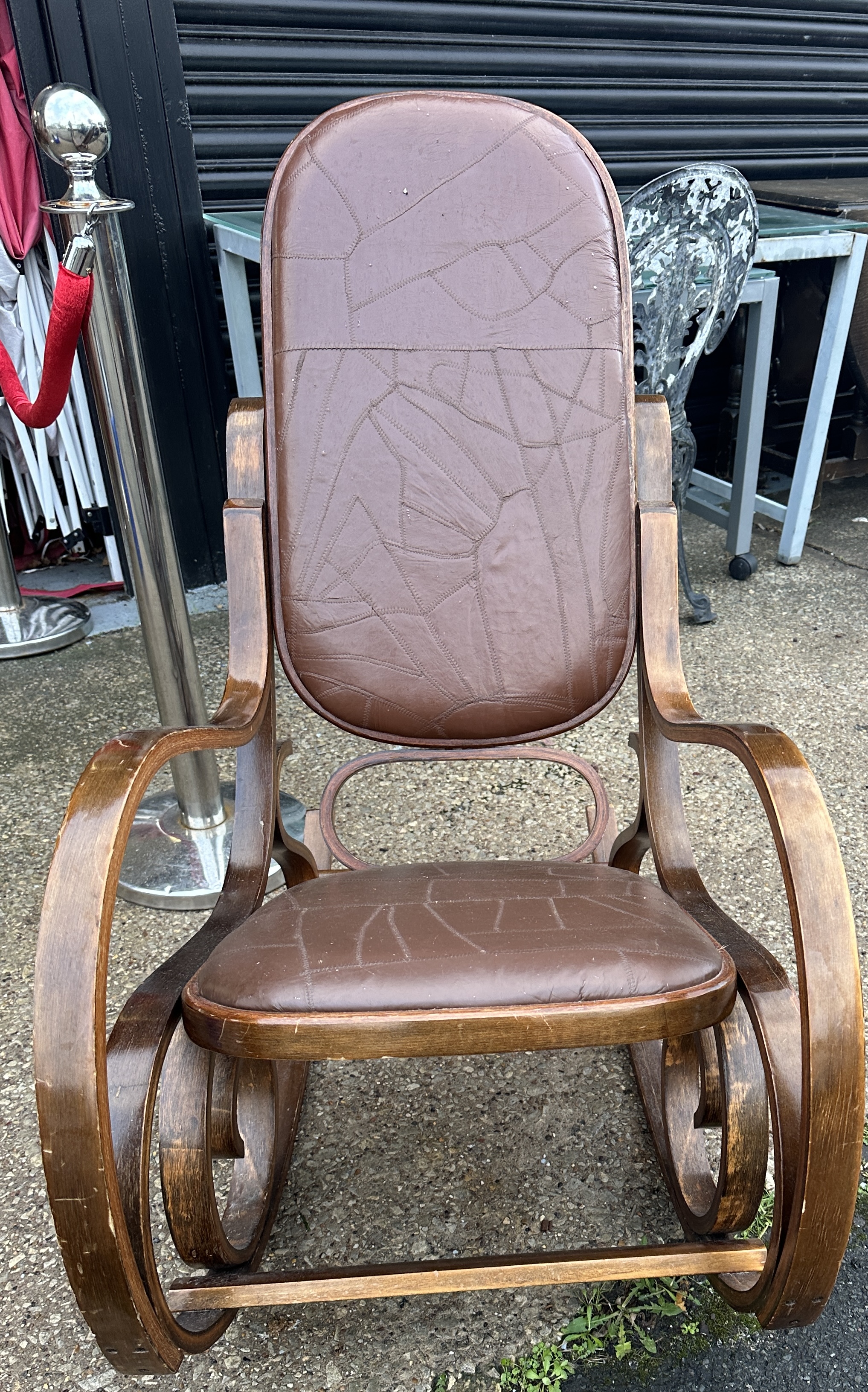 A 1970s rocking chair designed in the bentwood style attributed to Michael Thonet. The frame is constructed dark-stained wood, featuring characteristic steam-bent scrolling curves that form the integrated armrests and runners. The high, rounded back and seat are upholstered in a brown patchwork vinyl material featuring decorative zig-zag stitching. The construction includes a central oval-shaped support beneath the backrest.