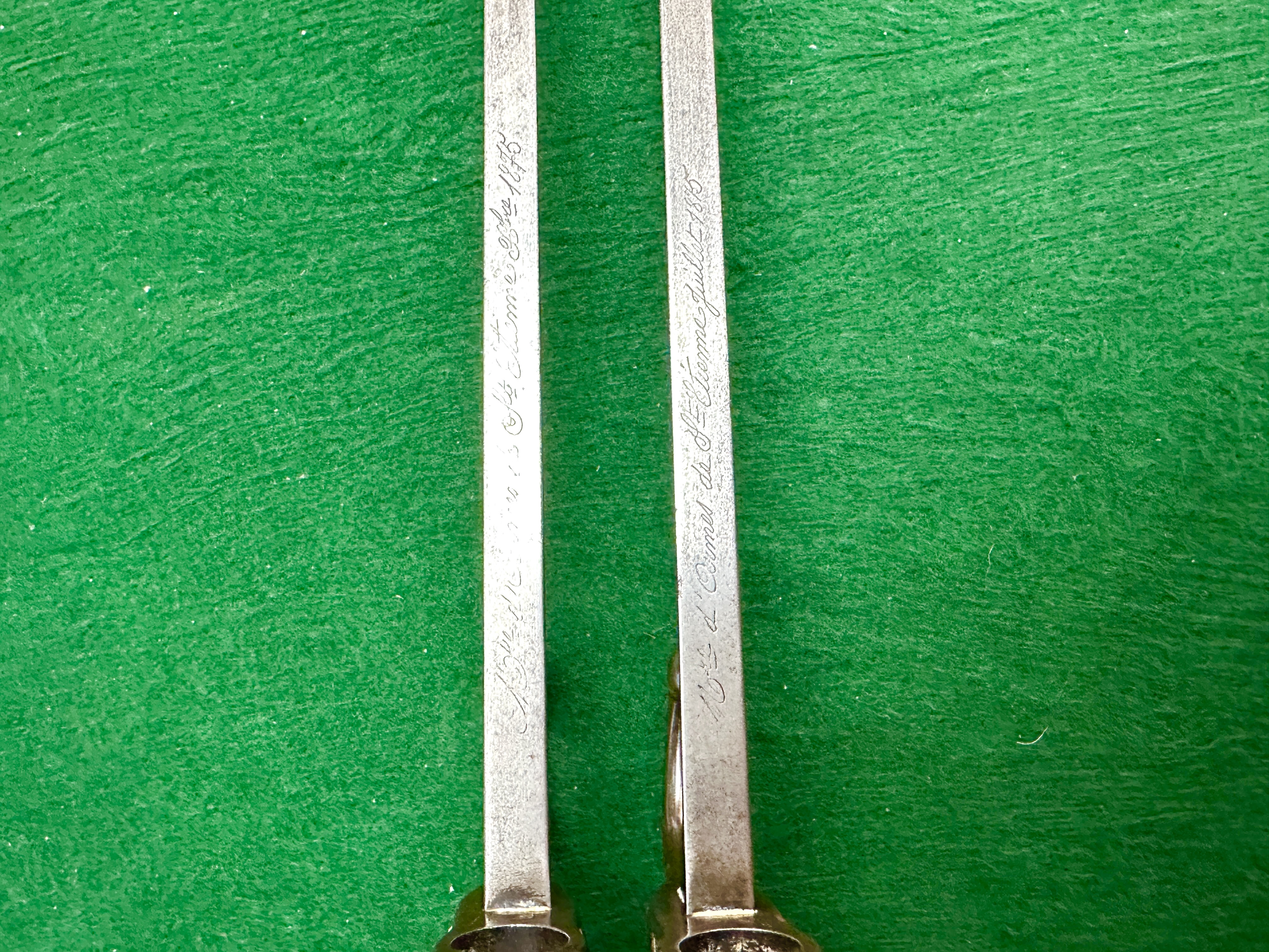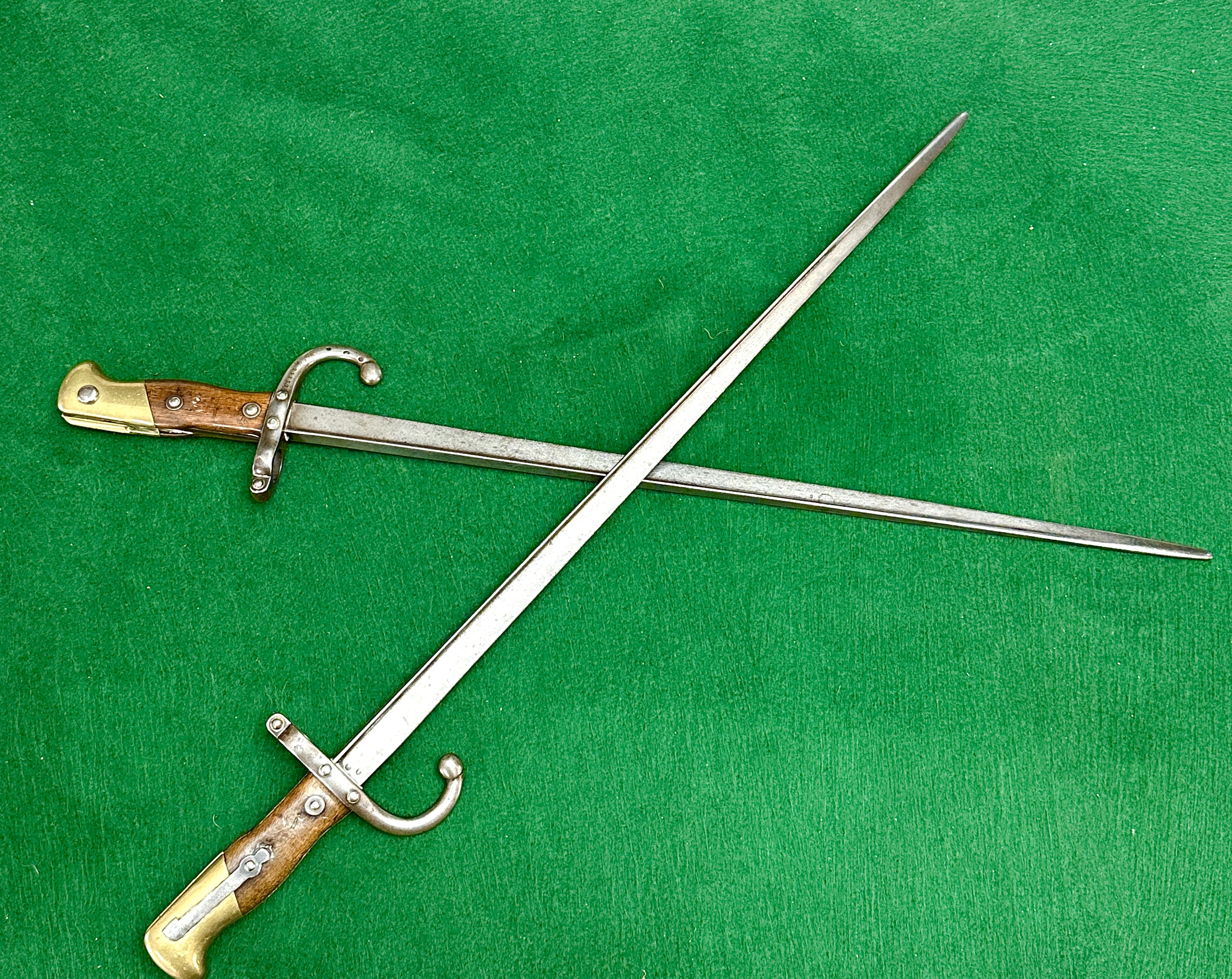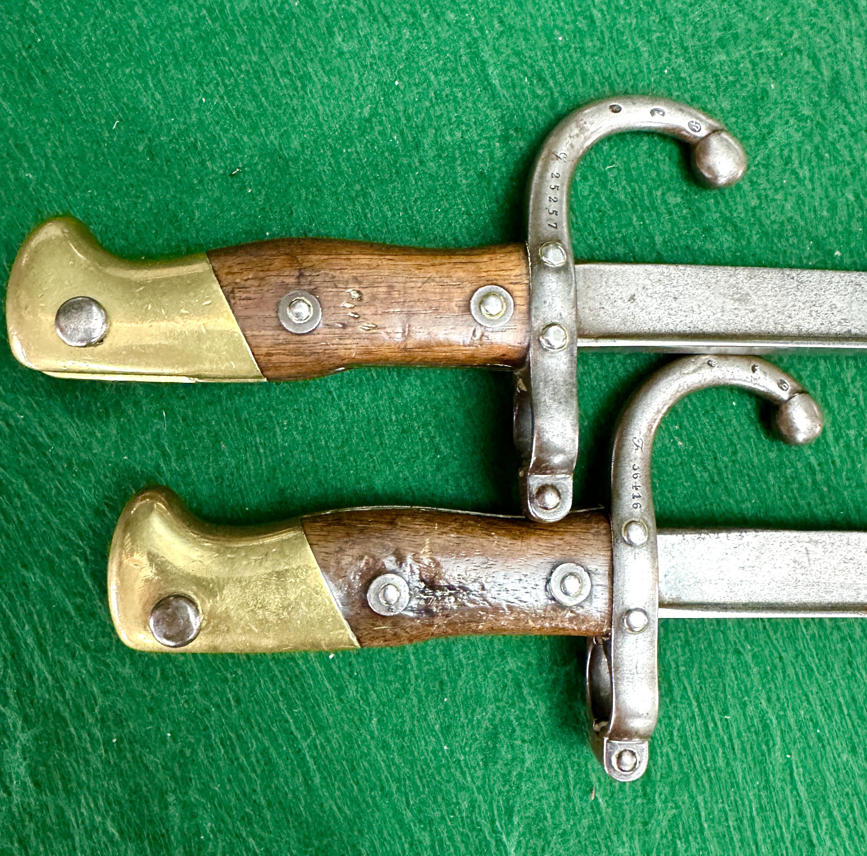 A pair of French Model 1874 Gras sword bayonets, produced at the St. Etienne arms factory. Each example features the characteristic T-shaped steel blade and a hilt comprised of wooden grips secured by two steel rivets. The hilts are finished with brass pommels and steel crossguards featuring hooked quillons and muzzle rings. One crossguard is stamped with the serial number G 25257 and the other with F 36416, both displaying various small circular proof marks. The spines of the blades are hand-engraved in French cursive script; one reads Mre d’Armes de St. Étienne Juillet 1875 and the other Mre d’Armes de St. Étienne Octobre 1883.