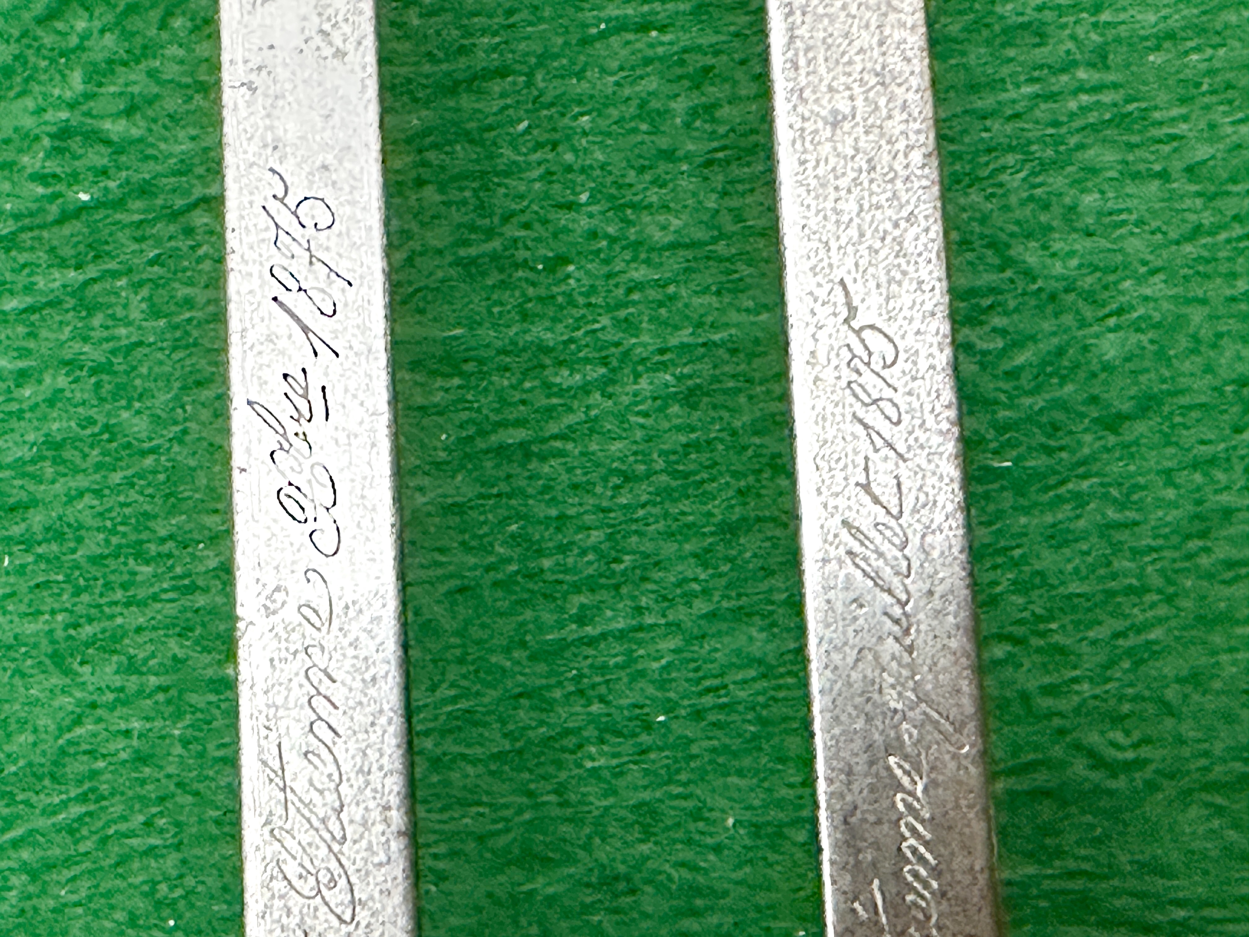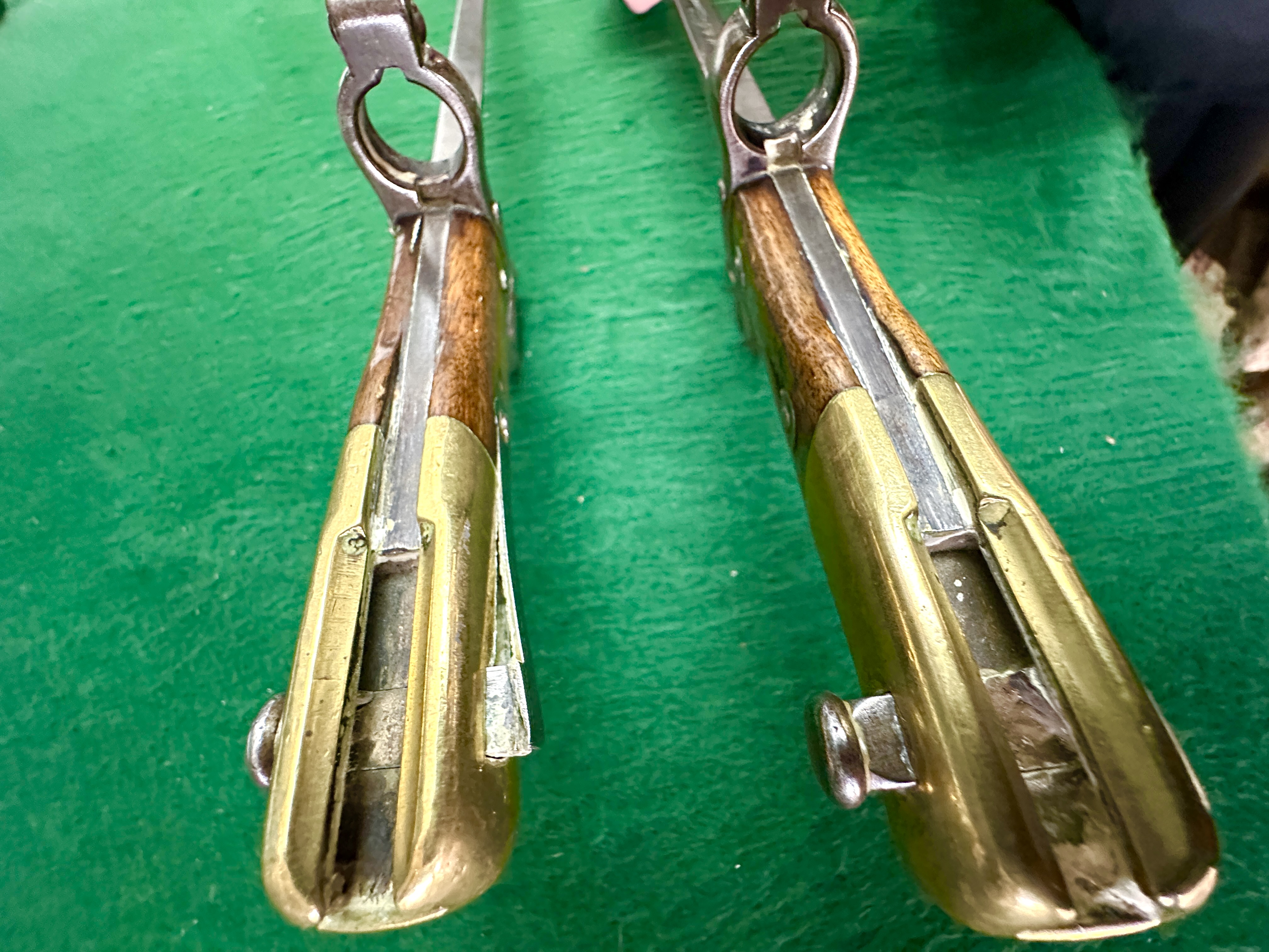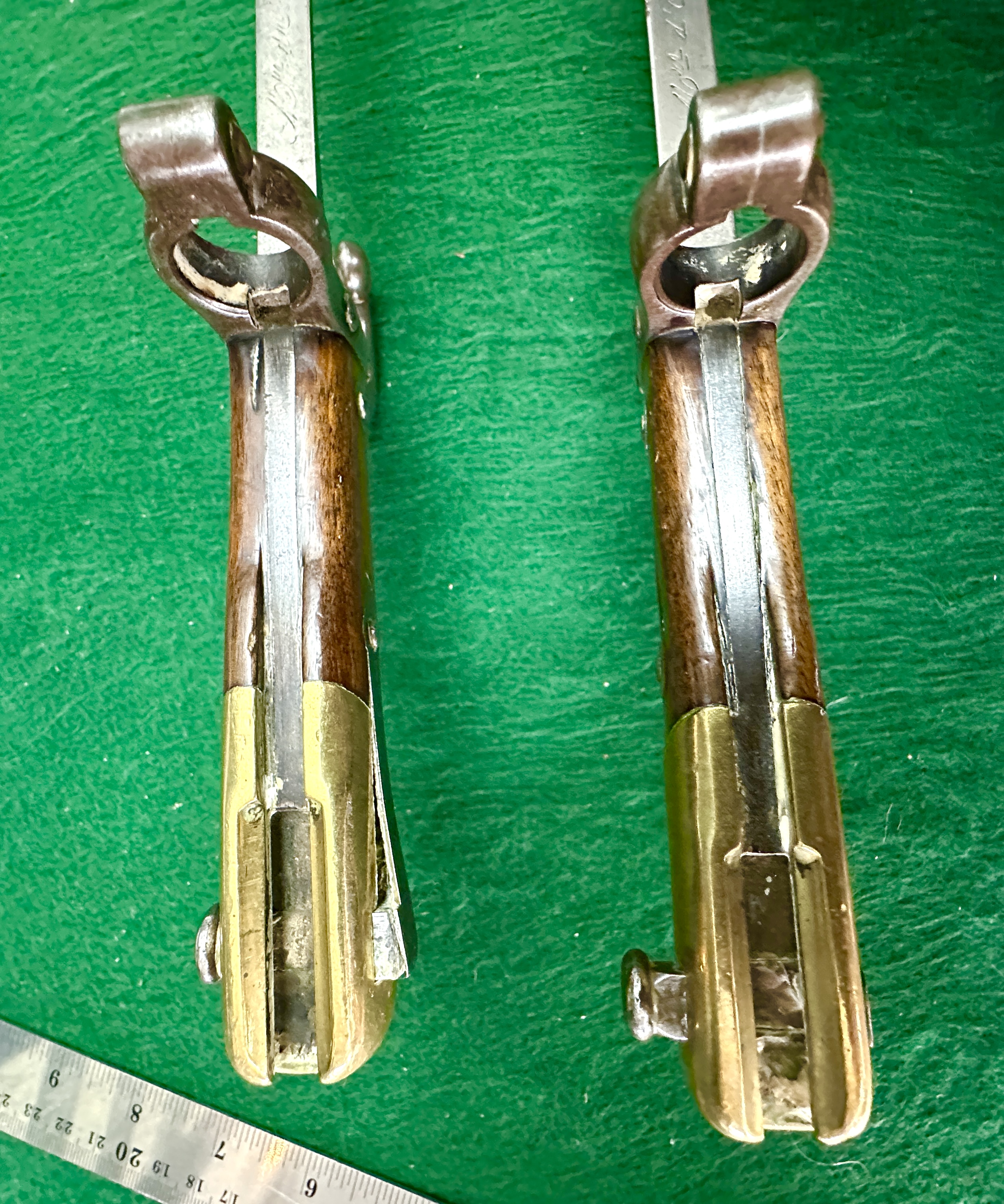 A pair of French Model 1874 Gras sword bayonets, produced at the St. Etienne arms factory. Each example features the characteristic T-shaped steel blade and a hilt comprised of wooden grips secured by two steel rivets. The hilts are finished with brass pommels and steel crossguards featuring hooked quillons and muzzle rings. One crossguard is stamped with the serial number G 25257 and the other with F 36416, both displaying various small circular proof marks. The spines of the blades are hand-engraved in French cursive script; one reads Mre d’Armes de St. Étienne Juillet 1875 and the other Mre d’Armes de St. Étienne Octobre 1883.