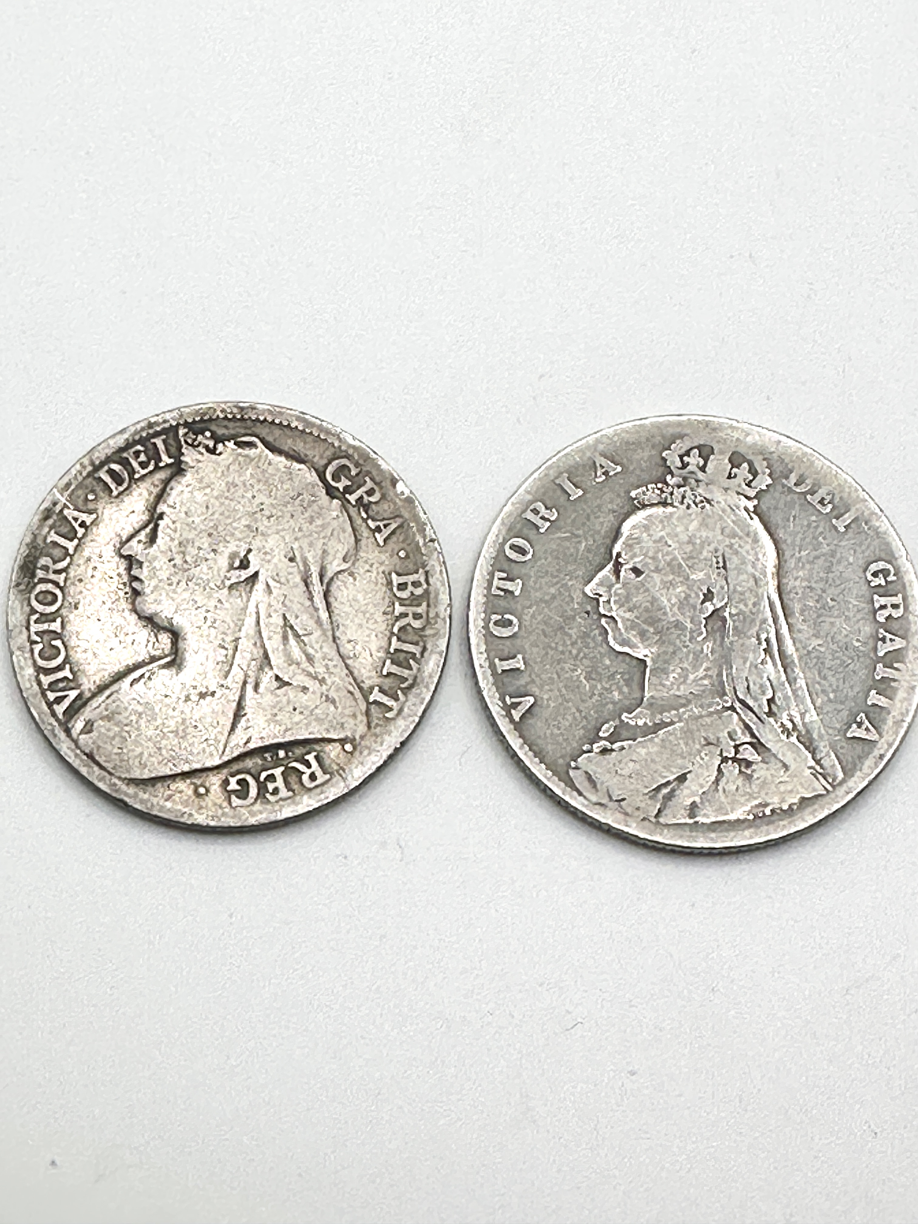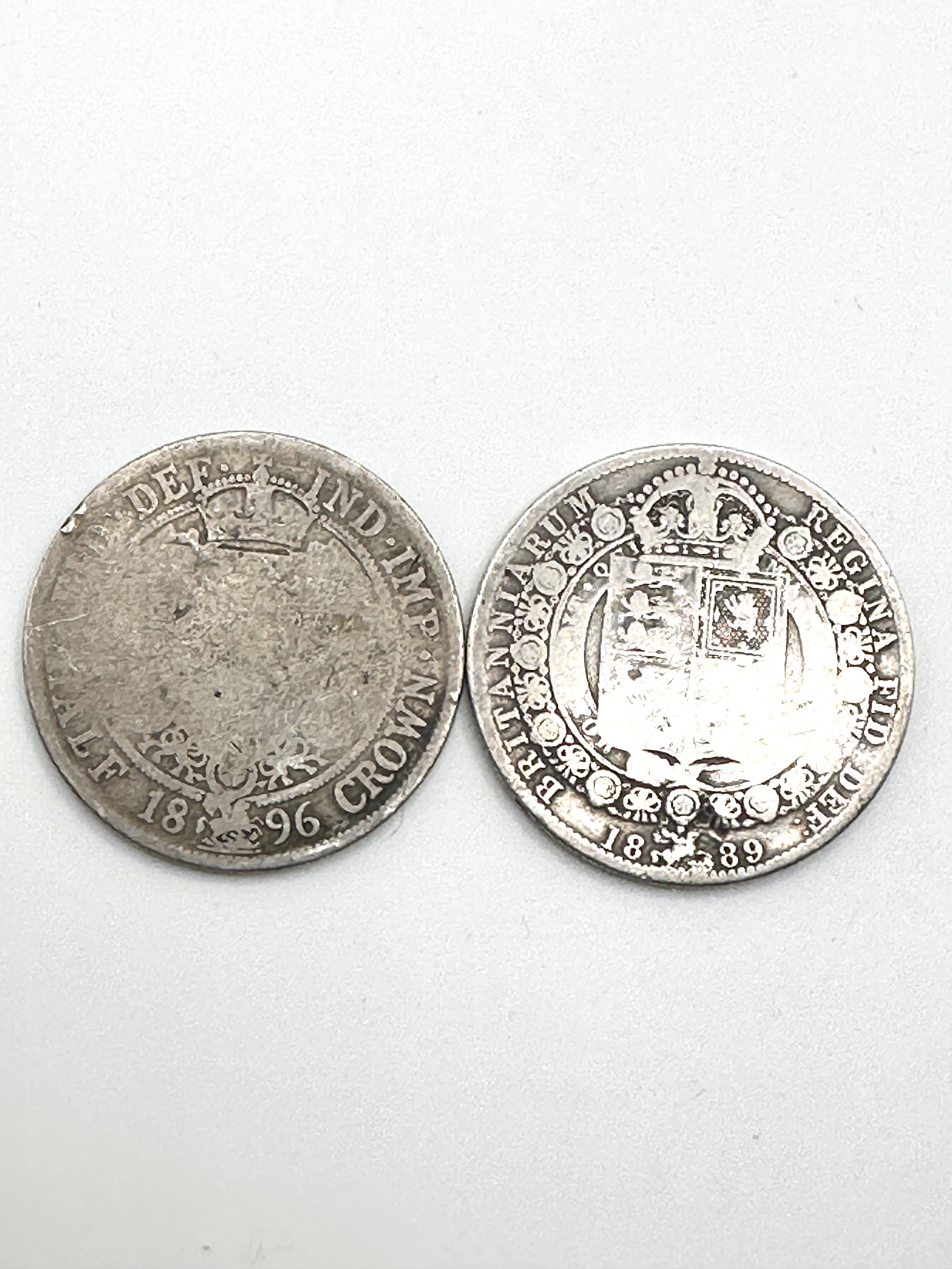 A pair of United Kingdom silver half crown coins. The first example, dated 1889, features the Jubilee Head portrait of Queen Victoria on the obverse with the legend VICTORIA DEI GRATIA. The reverse depicts a crowned shield of arms within the Garter, surrounded by the legend BRITANNIARUM REGINA FID DEF. The second example, dated 1896, features the Old Head portrait of Queen Victoria with the legend VICTORIA DEI GRA BRITT REGINA FID DEF IND IMP. The reverse displays a crowned shield within a collar, inscribed HALF CROWN 1896. Both coins are struck in sterling silver.