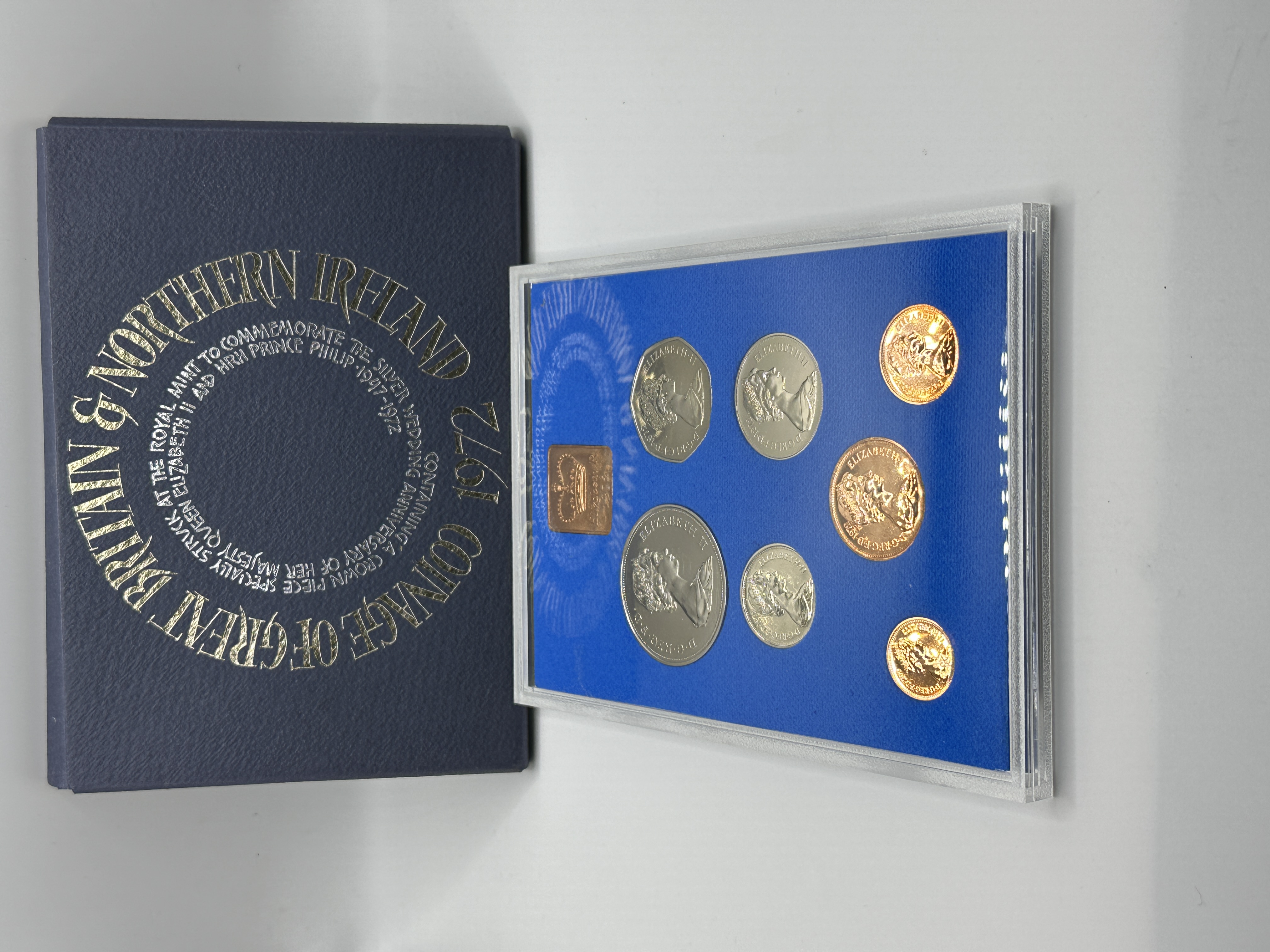 A set of proof coins issued by the Royal Mint to commemorate the silver wedding anniversary of Queen Elizabeth II and HRH Prince Philip (1947-1972). The collection includes coins in silver-toned and gold-toned metals, each featuring the profile of Queen Elizabeth II on the obverse. The coins are housed within a clear acrylic display case against a bright blue insert. The set is presented in its original blue textured folder with gold-embossed lettering reading COINAGE OF GREAT BRITAIN & NORTHERN IRELAND 1972. The folder includes an inscription stating the set was specially struck at the Royal Mint to commemorate the royal anniversary.