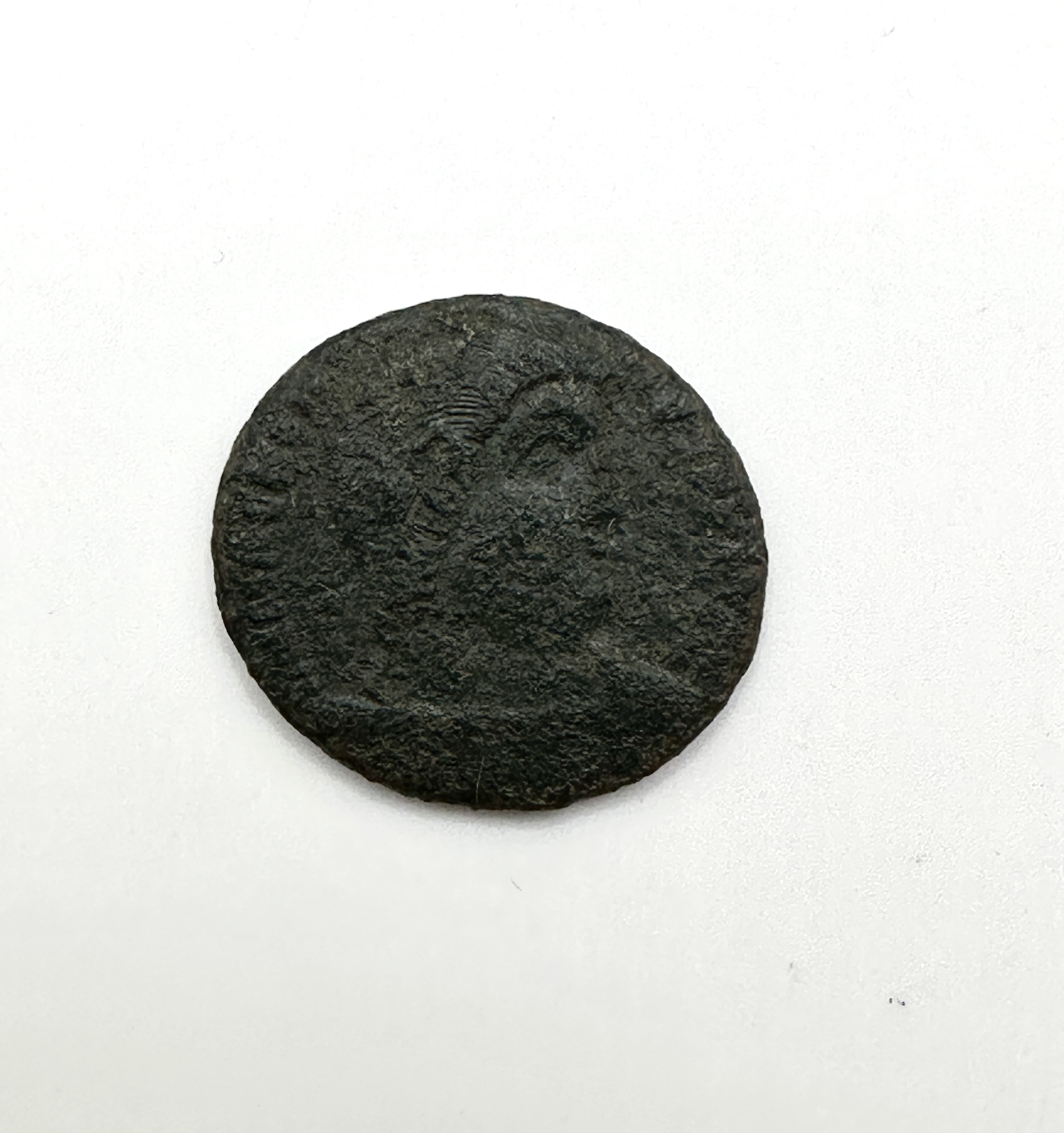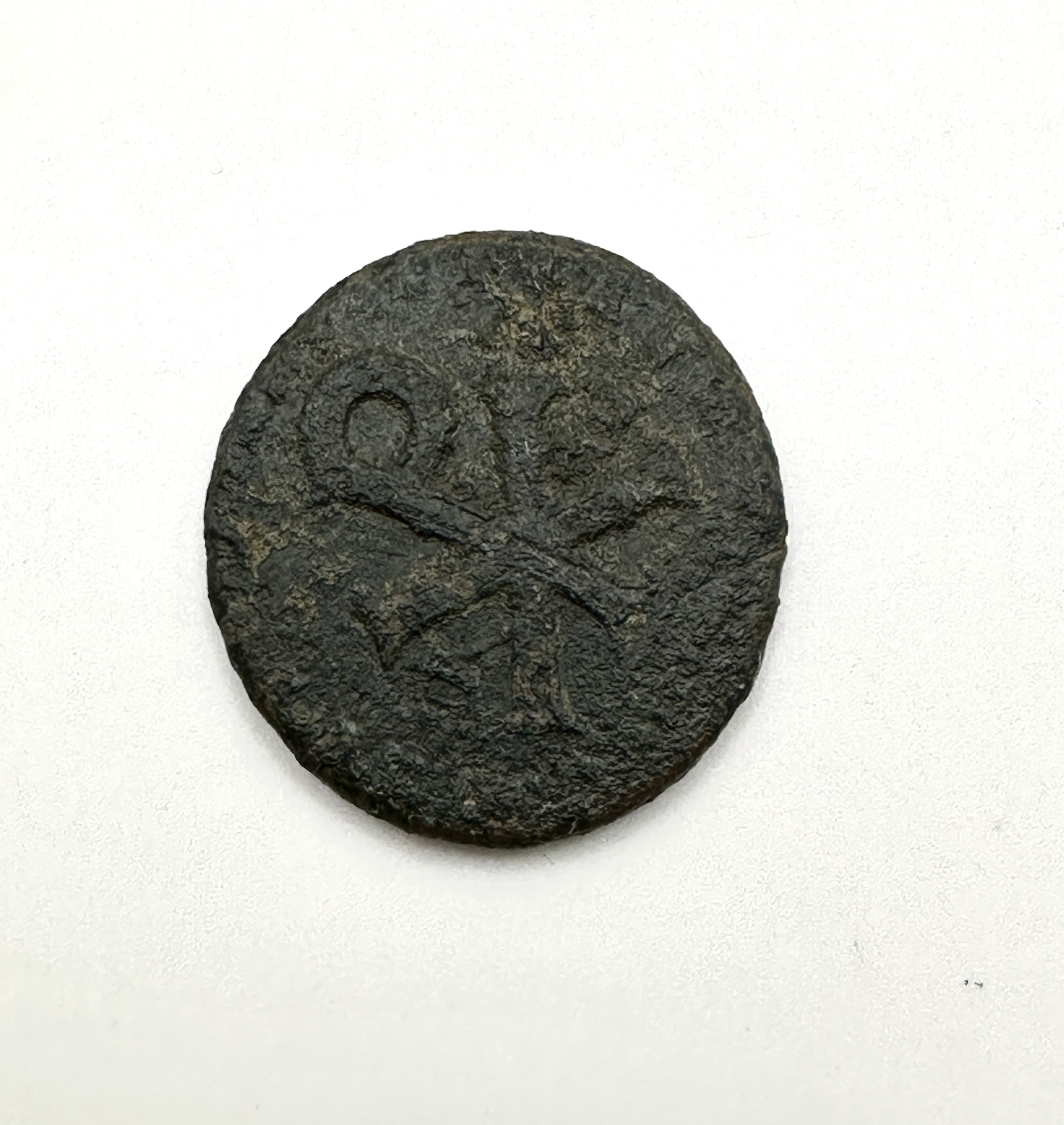 An ancient bronze coin, likely a late Roman or Byzantine nummus, struck in a copper alloy with a dark patina. The obverse depicts a right-facing profile bust, which is heavily worn and lacks discernible features. The reverse displays a prominent Chi-Rho christogram. The object is of an irregular circular form with worn, rounded edges. Extensive environmental oxidation, pitting, and corrosion are present across both surfaces, obscuring any potential inscriptions or mint marks.