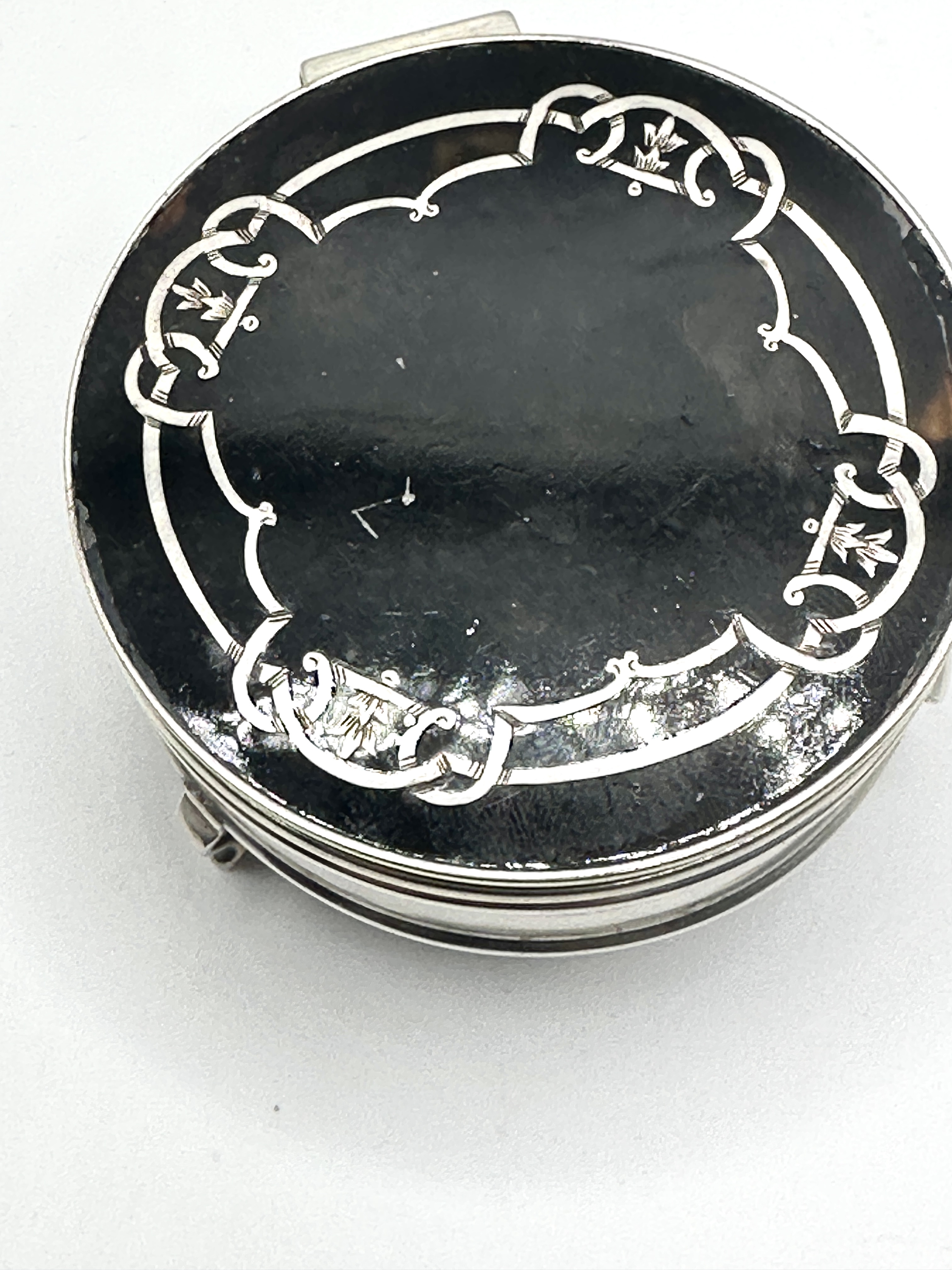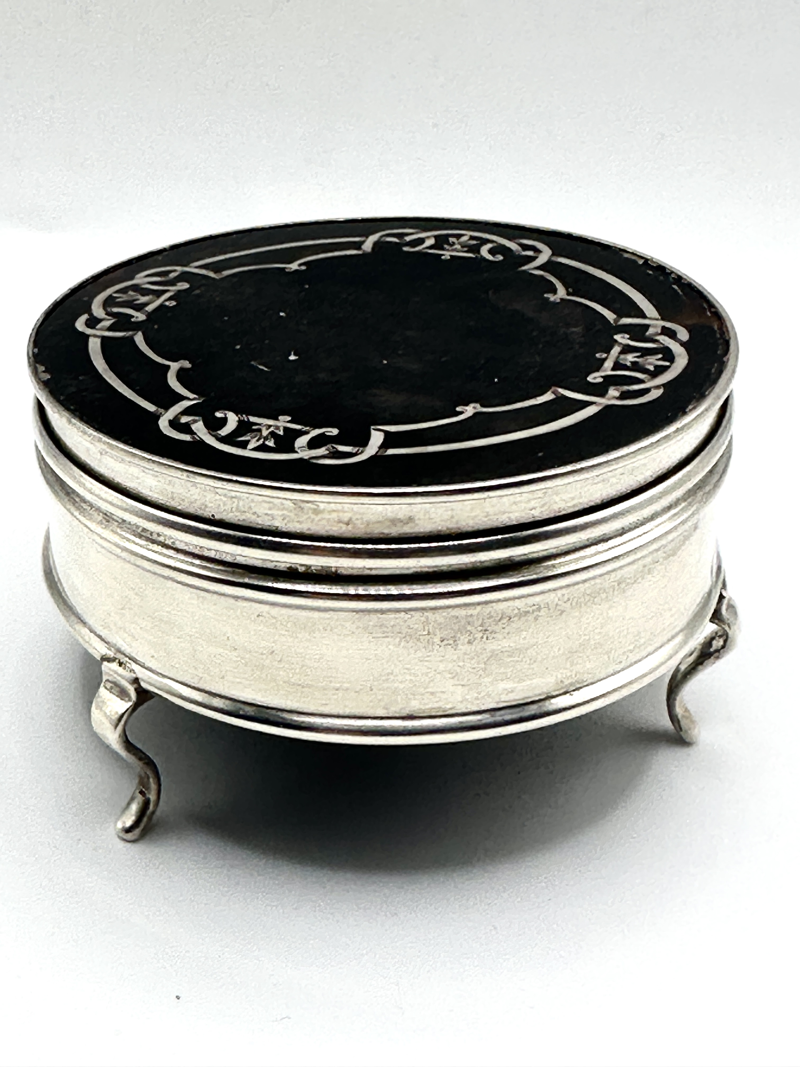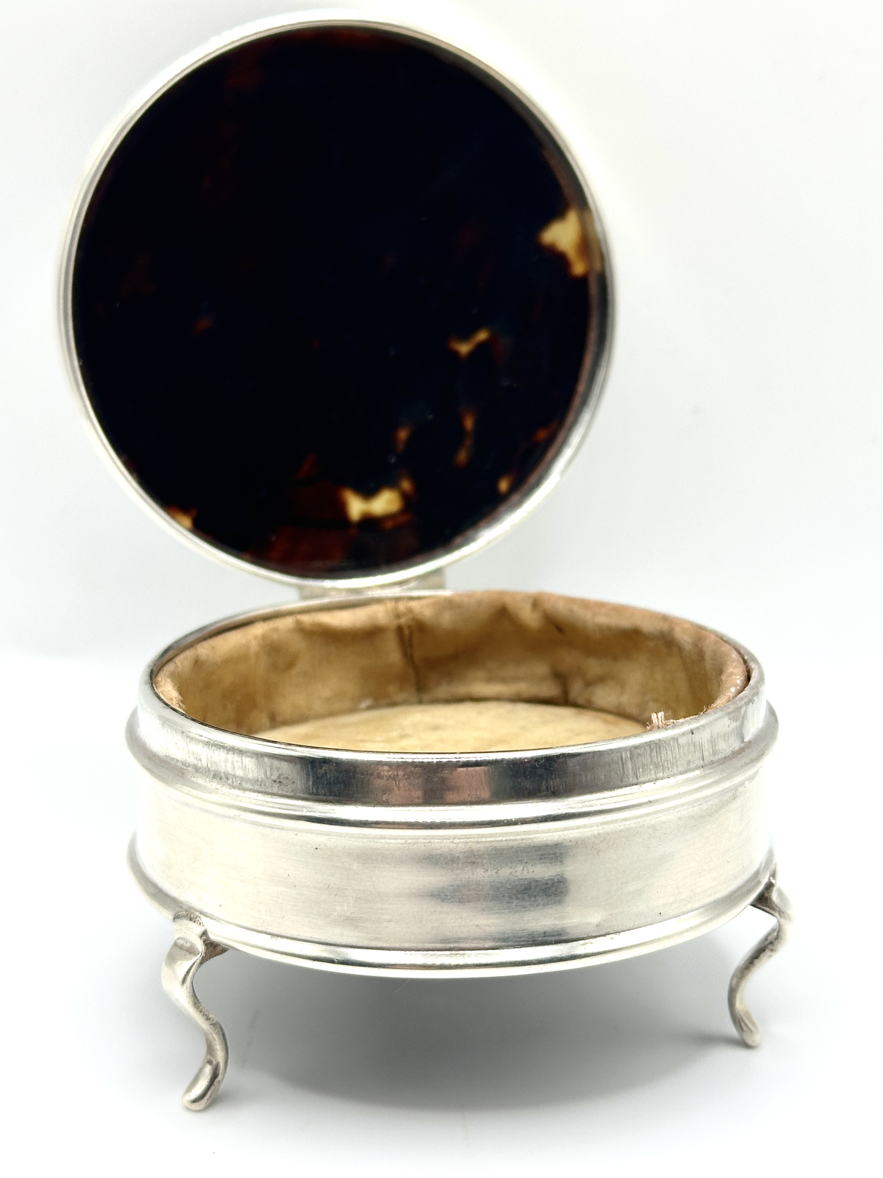 This circular trinket box is constructed from 925 silver and features a hinged lid with an inset dark mottled tortoiseshell panel. The lid is decorated with silver pique work inlay in a scrolling foliate and strapwork design. The silver body is raised on four delicate cabriole legs. The interior is lined with a beige fabric material.
