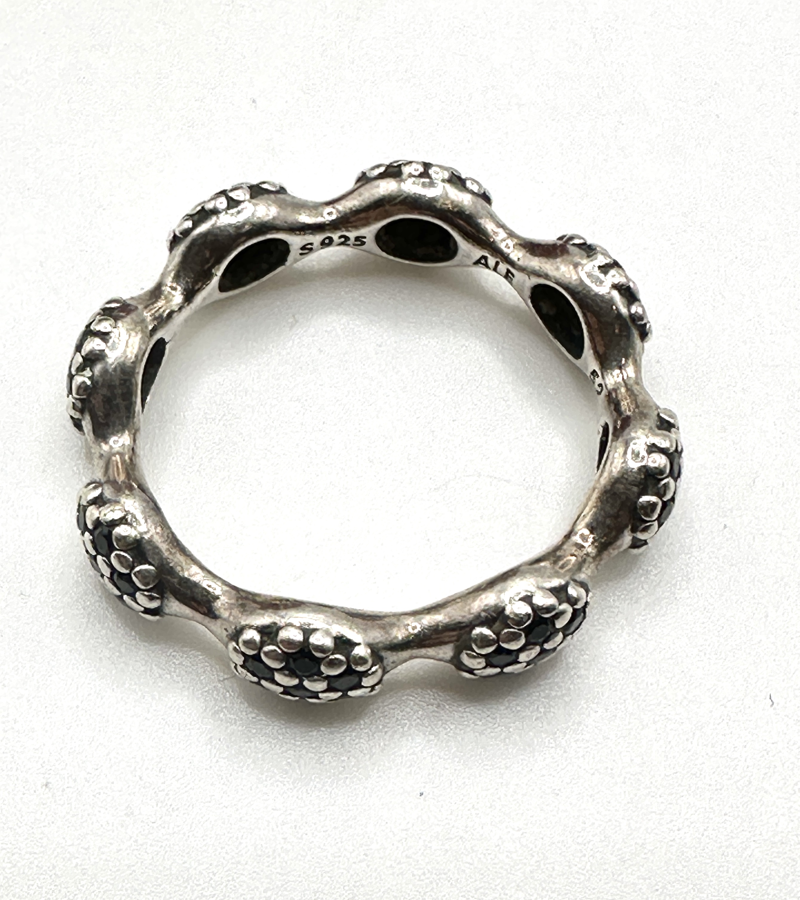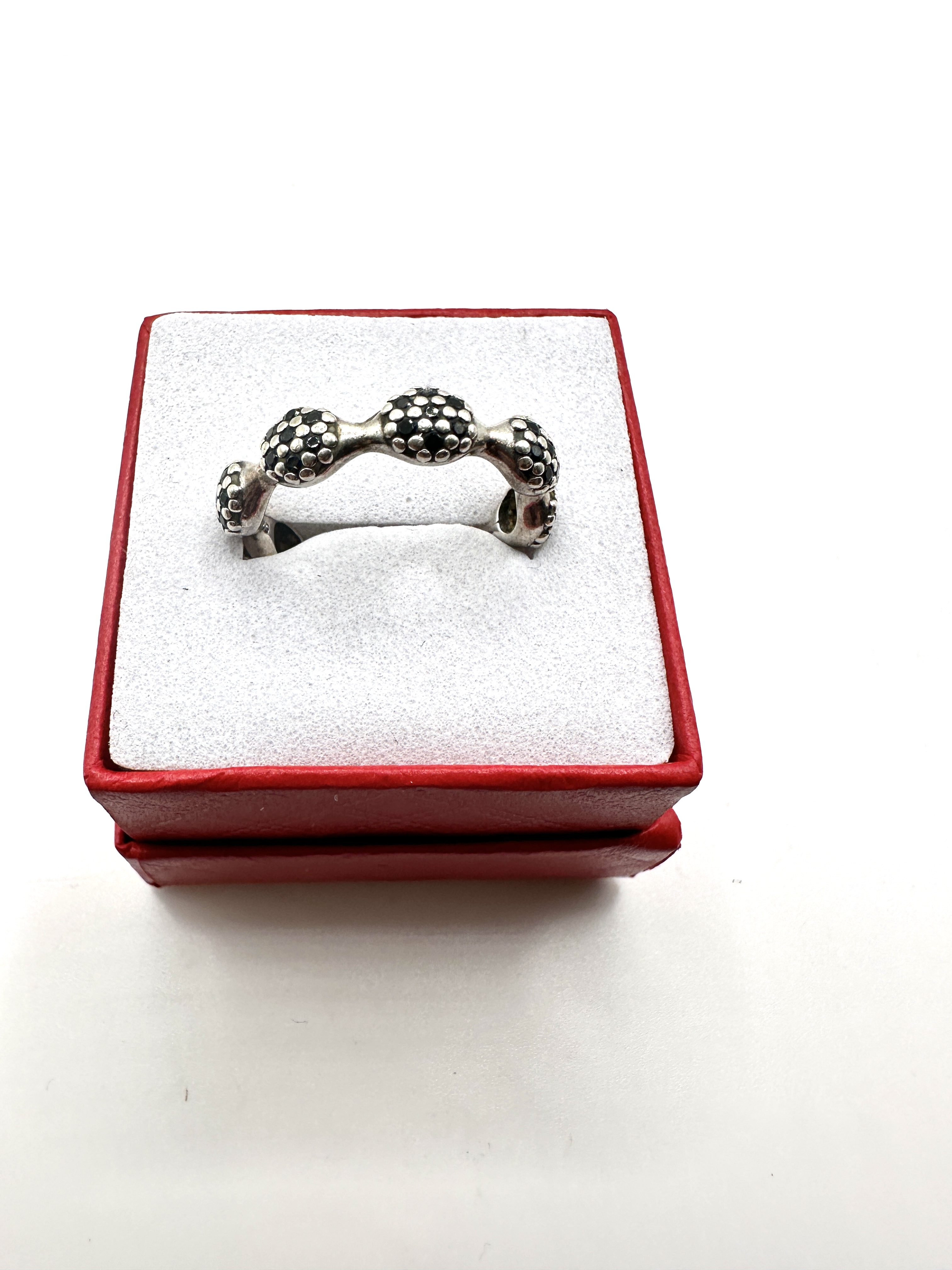 A Pandora sterling silver eternity-style ring from the Modern Lovepods collection, specifically the 8-Pod Pave Black Crystal design (model 190889NCK). The undulating band features eight circular clusters, each pavé-set with black crystals. The interior of the band is clearly stamped with the maker’s mark ALE and the silver purity hallmark S925. The piece is presented in a red textured jewellery box with a white foam insert.