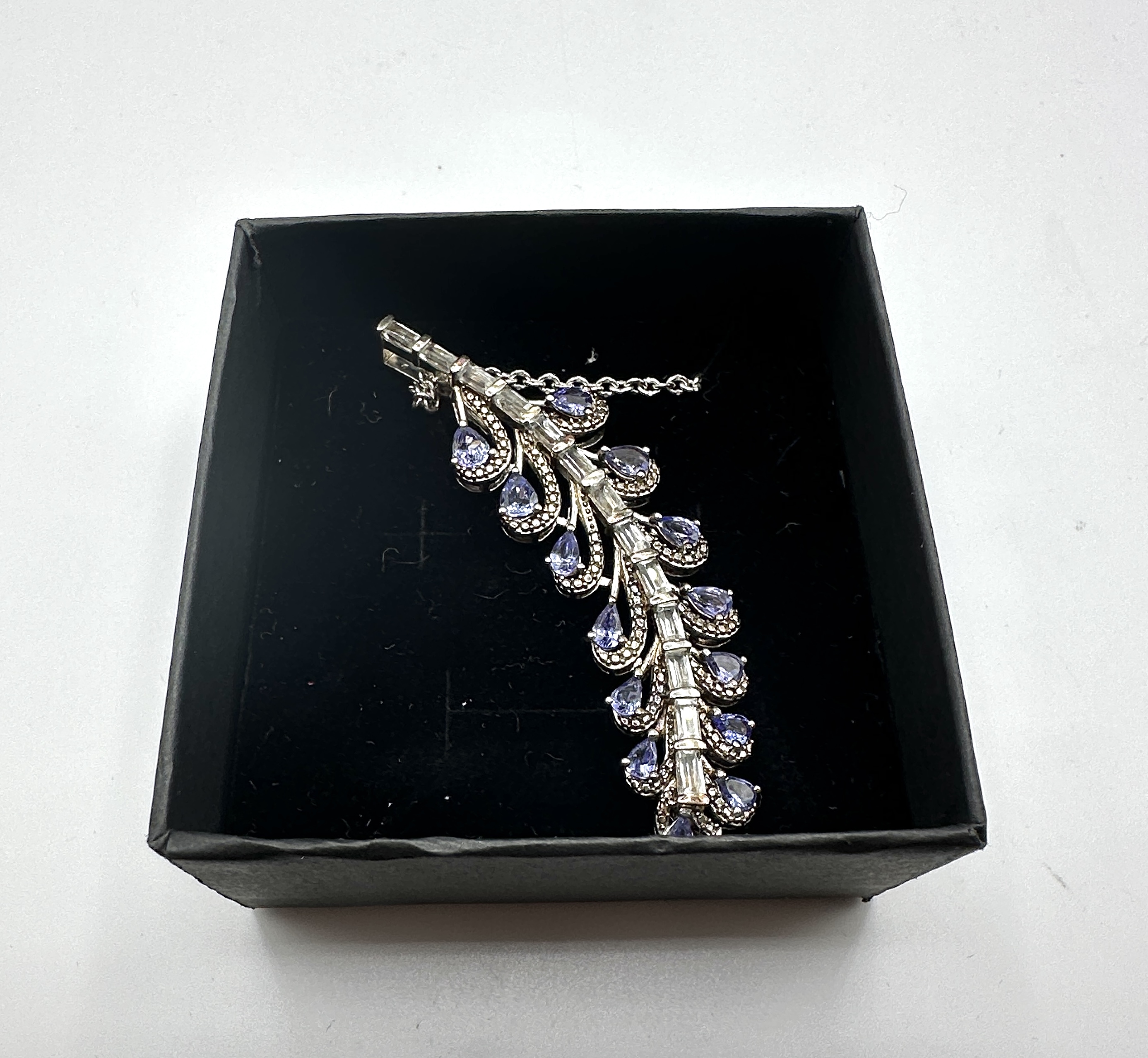 A contemporary silver-tone necklace featuring a large, curved pendant of botanical design, resembling a stylised feather or leafy branch. The central spine of the pendant is set with a vertical row of baguette-cut clear stones. Branching from this spine are several openwork elements, each containing a pear-cut lavender-blue gemstone set within a textured milgrain border. The pendant is suspended from a delicate silver-tone cable chain. The piece is presented in a black jewellery box. No hallmarks or maker’s marks are visible.