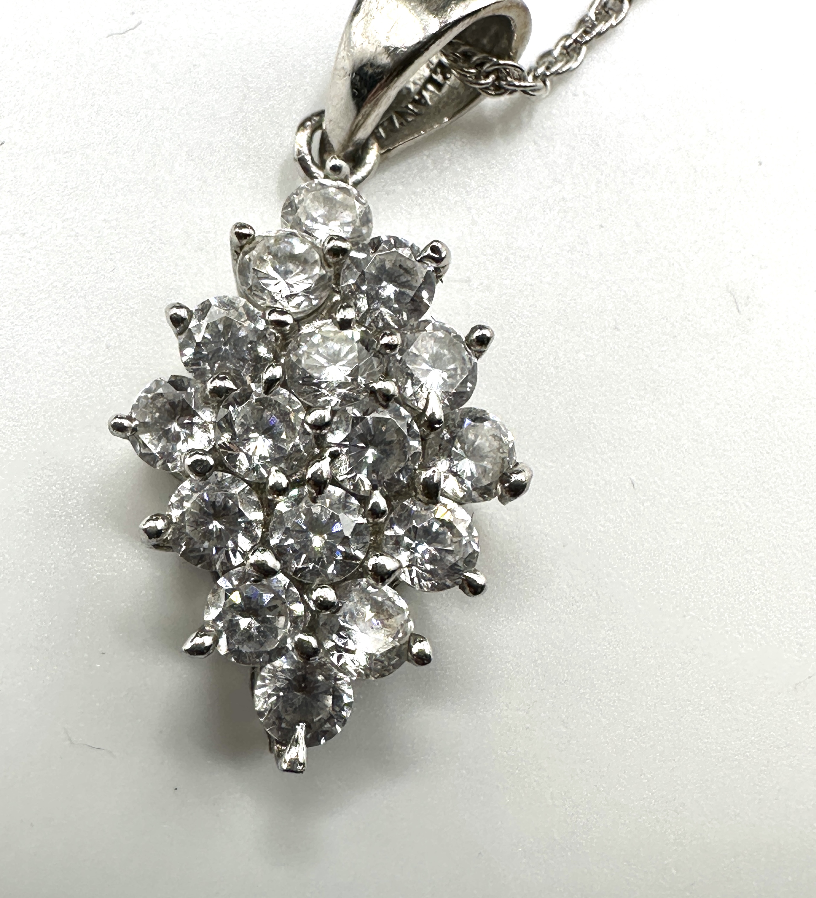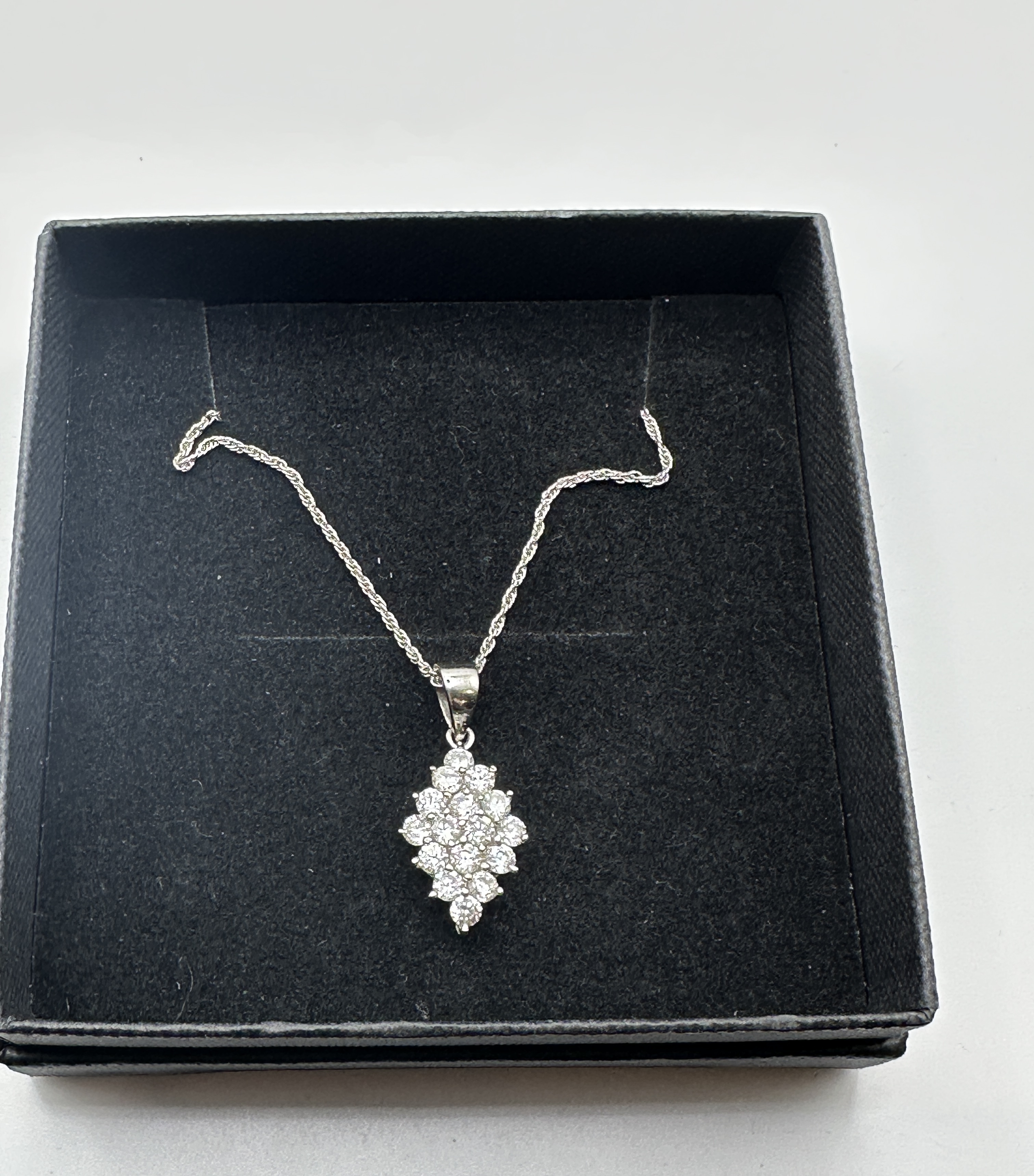 A contemporary-style necklace featuring a cluster pendant set with numerous clear, round brilliant-cut stones. The stones are arranged in a tapered, elongated diamond-shaped motif. The pendant is suspended from a polished white metal bail and a thin, twisted rope-style chain. The bail is stamped with an ITALY hallmark alongside a further partially obscured mark. The piece is presented in a black flock-lined jewellery box.