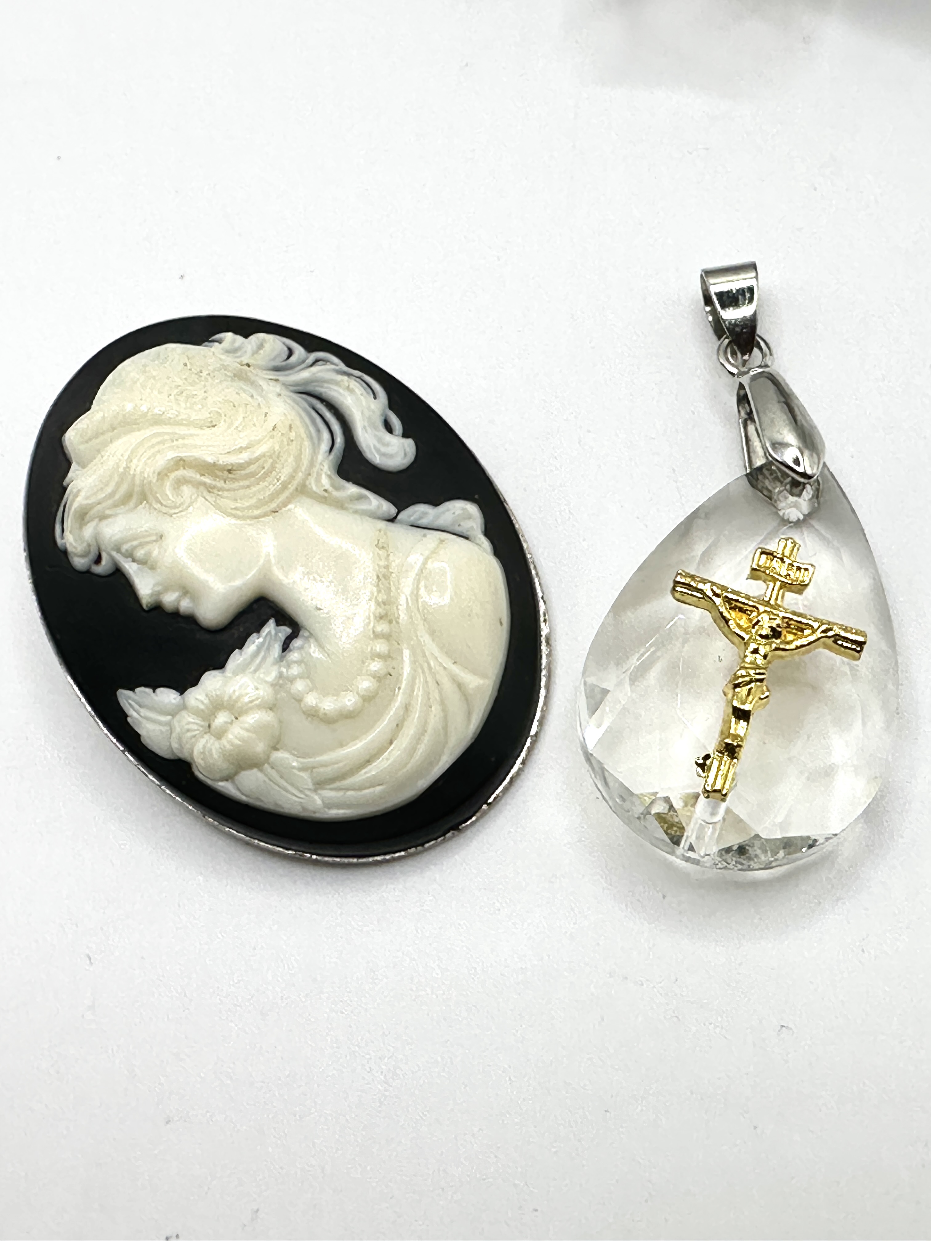 This lot comprises two pieces of jewellery. The first is a ZARD crucifix cross crystal teardrop pendant, featuring a faceted transparent crystal body with a gold-tone metal crucifix mounted to the front. The crucifix includes a small INRI inscription at the top and is fitted with a silver-tone metal bail. The second item is an oval cameo featuring a white relief female profile with floral accents and a beaded necklace detail against a black background. The cameo is composed of resin or hardstone and is set within a simple silver-tone metal bezel.