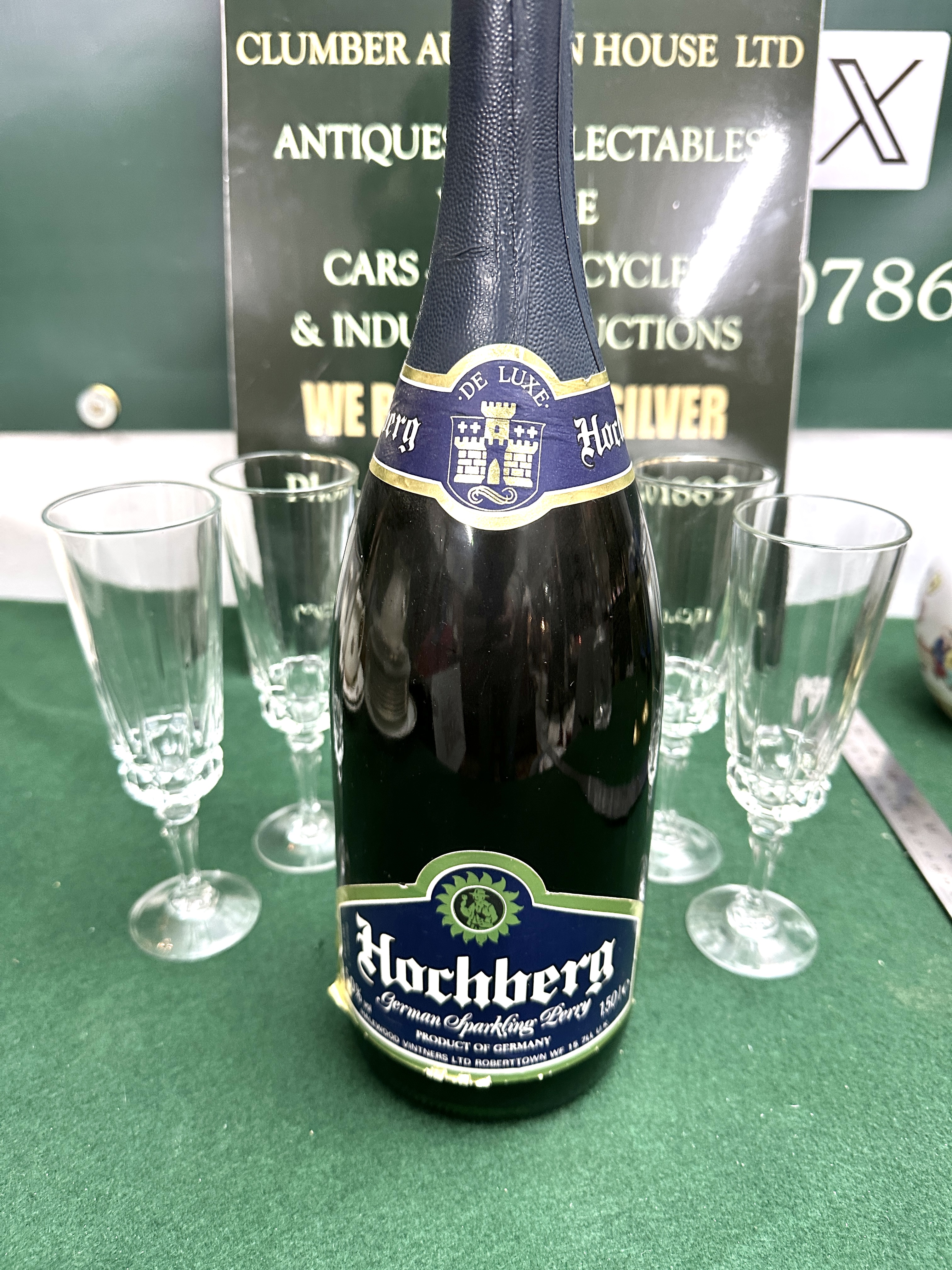 A collection comprising a 1.5-litre bottle of Hochberg German Sparkling Perry and several clear glass champagne flutes. The dark glass bottle remains sealed with its original textured navy-blue foil neck wrap and features a blue and green paper label identifying the contents as a product of Germany, distributed by Halewood Vintners Ltd. The accompanying flutes are crafted from clear glass, each featuring a tapered bowl set upon a faceted, multi-sided stem and a circular foot.