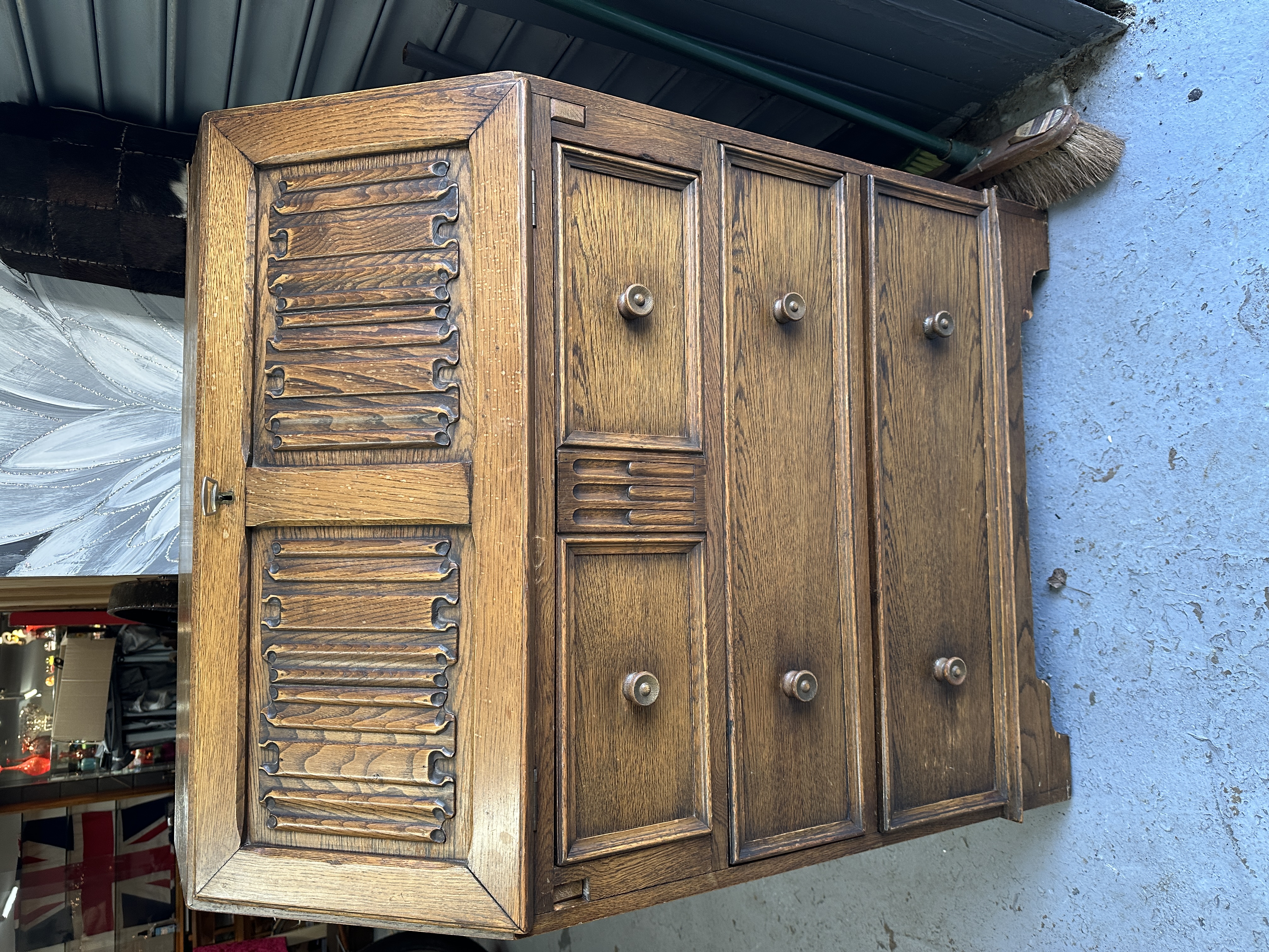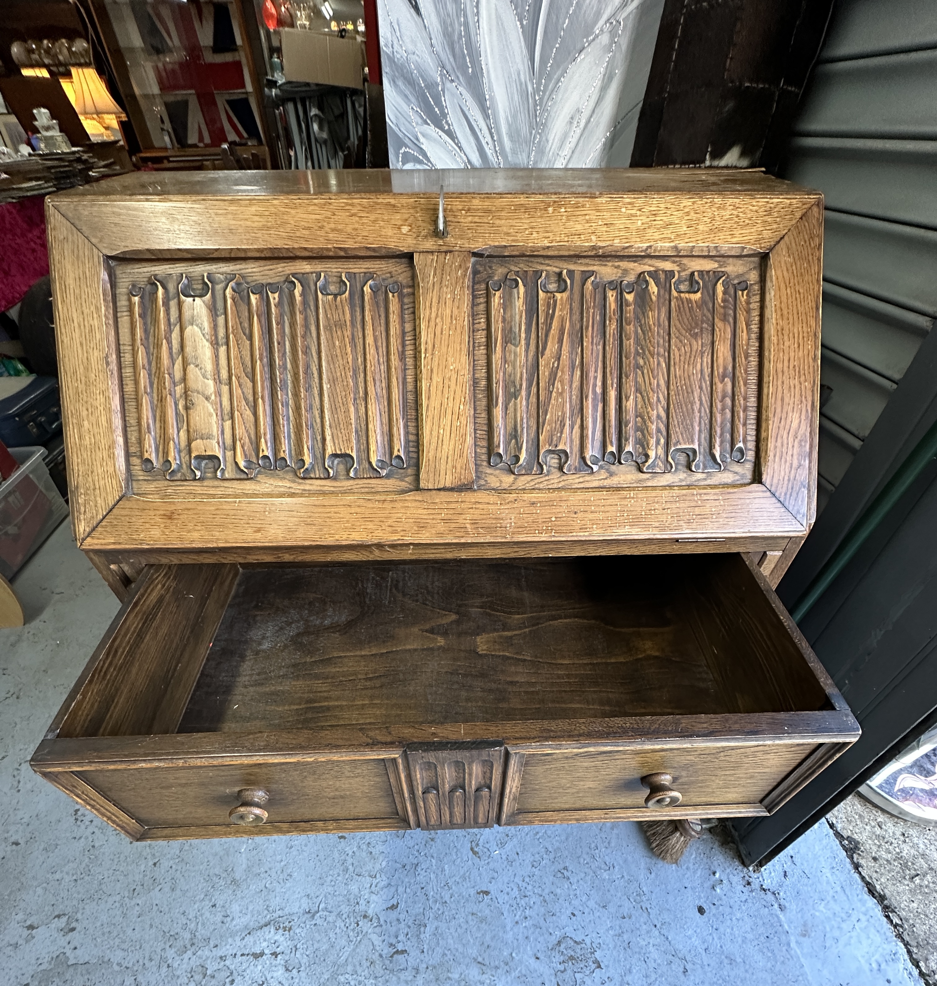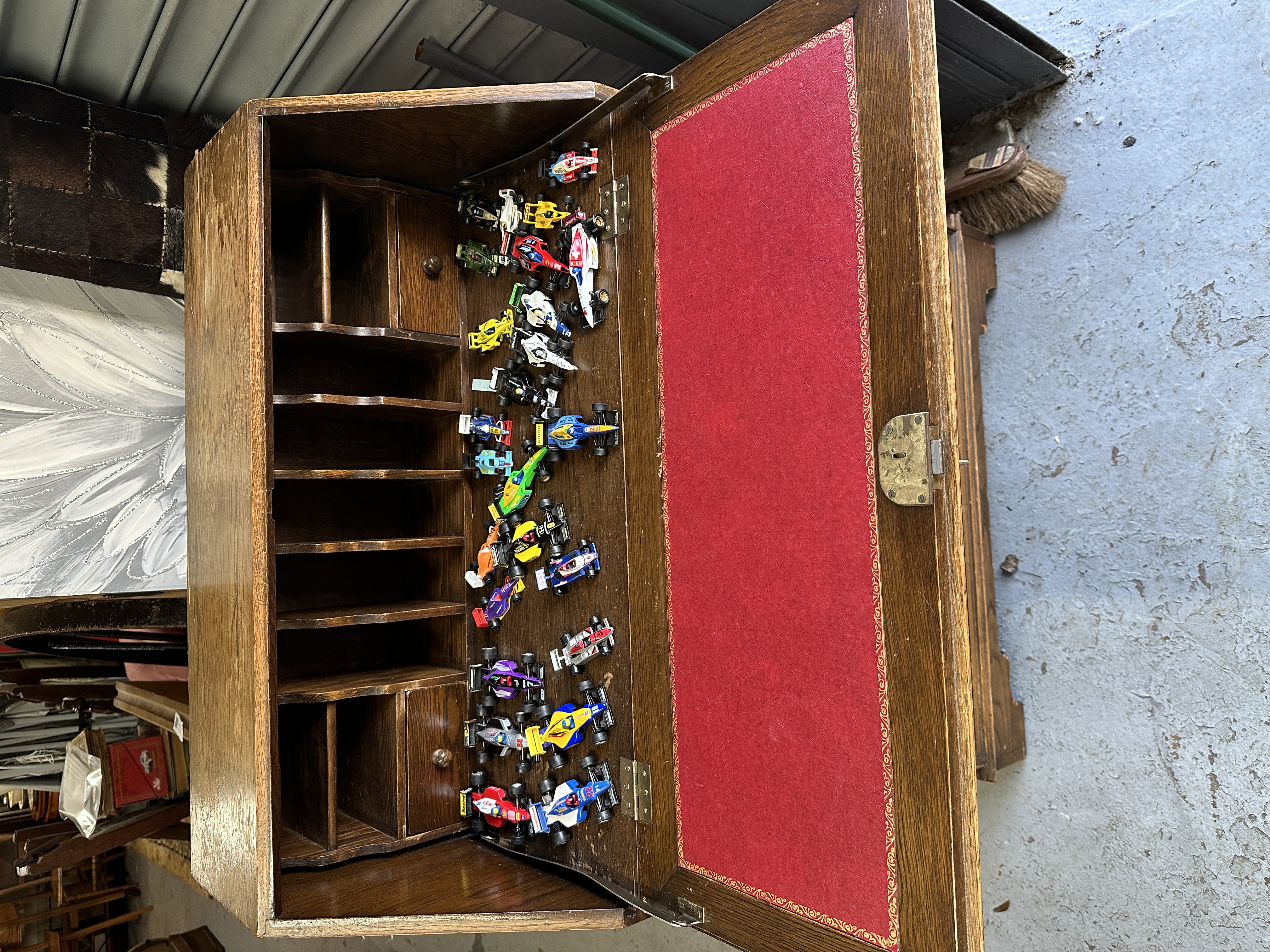 An Old Charm oak slant-front bureau in the Jacobean Revival style. The piece is constructed with a fall-front lid featuring two linenfold-carved panels, which opens to reveal a fitted interior comprising multiple pigeonholes and two small drawers. The writing surface is lined with red felt and finished with a gilt-tooled border. The bureau is configured with three full-width drawers below the desk section, each fitted with circular wooden pull knobs. Included within the lot is a collection of die-cast toy racing cars.