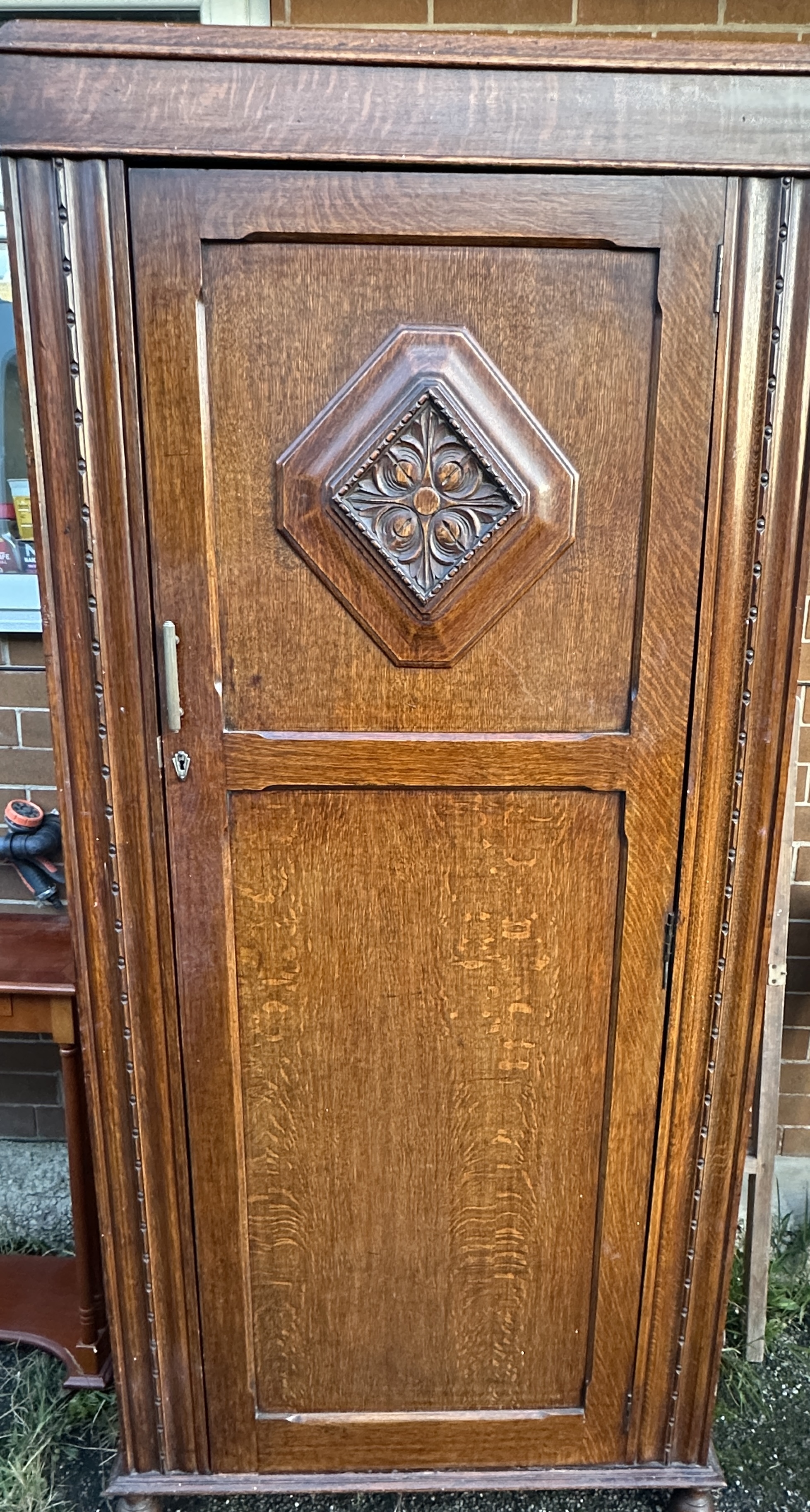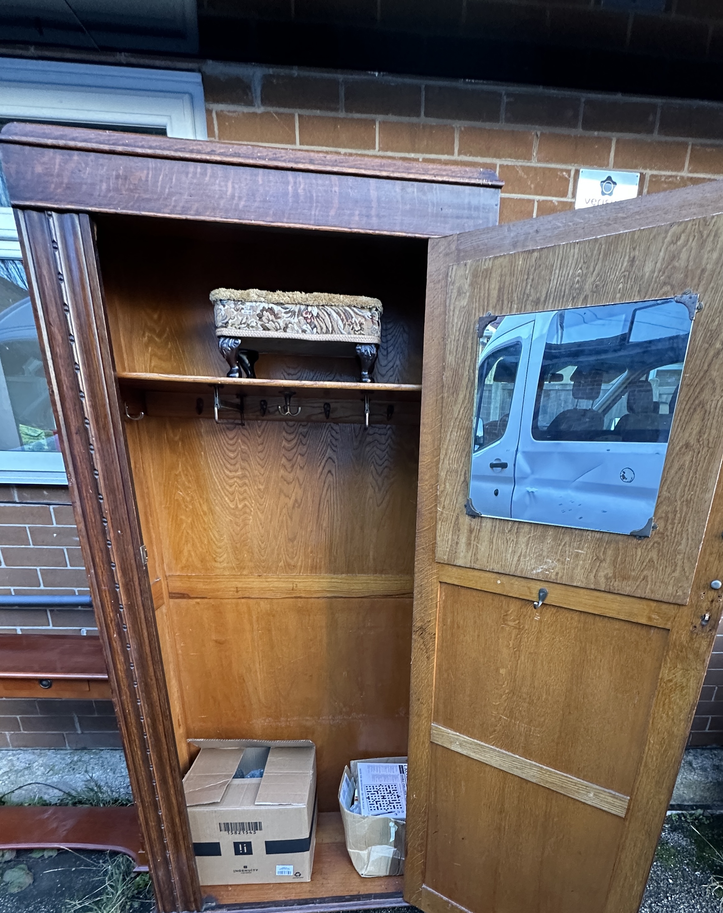 An early 20th-century English oak hall cupboard of upright rectangular form. The wardrobe is constructed from dark-stained oak with quartersawn grain patterns. The single door features a recessed panel with a diamond-shaped lozenge containing a carved floral relief. The door is flanked by beaded pilasters and the piece is supported by block feet. The interior is configured with a single upper shelf, a row of metal coat hooks, and a rectangular mirror mounted to the reverse of the door. This lot includes an assortment of household items, comprising a small upholstered footstool with cabriole legs and various storage containers.