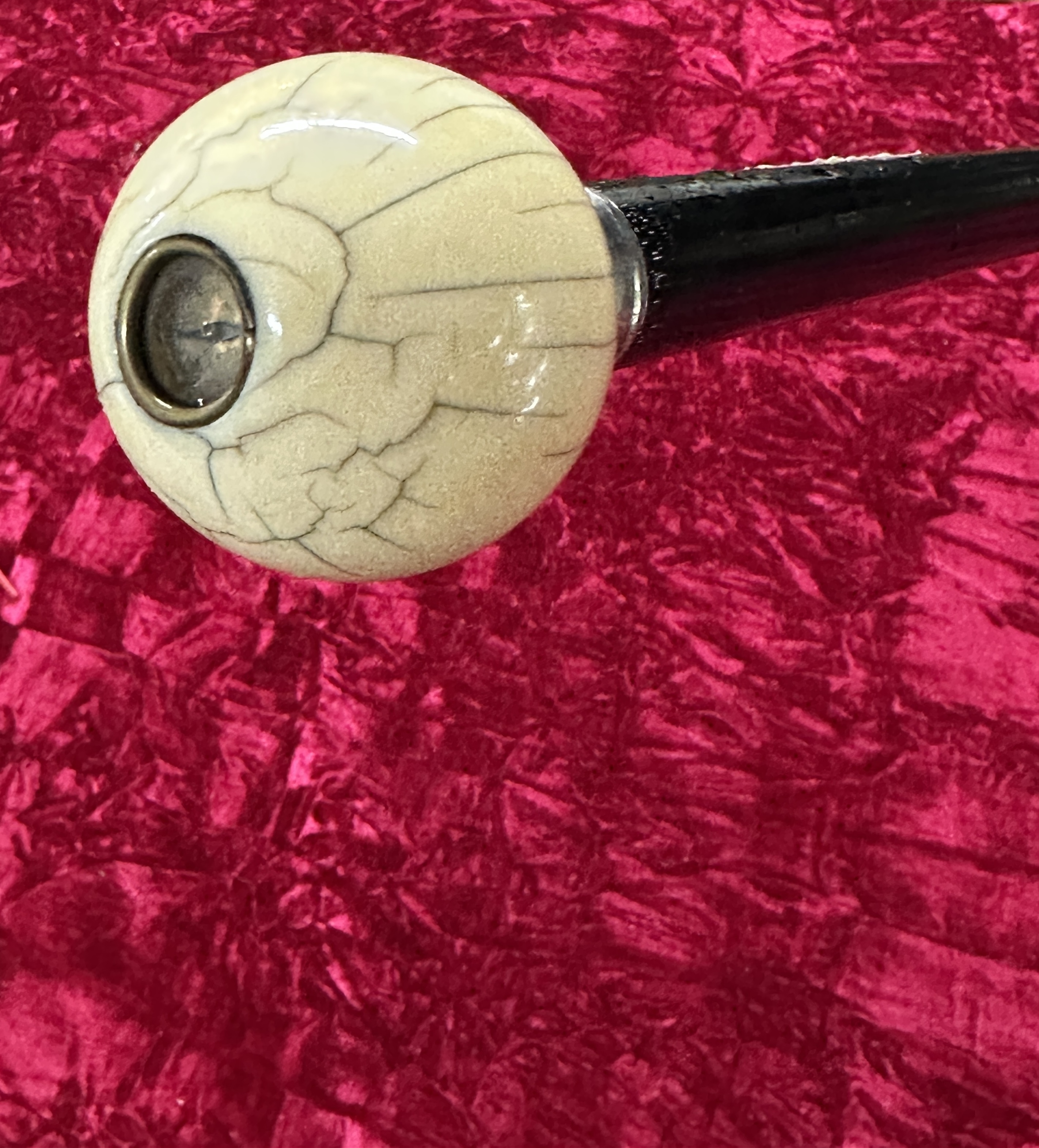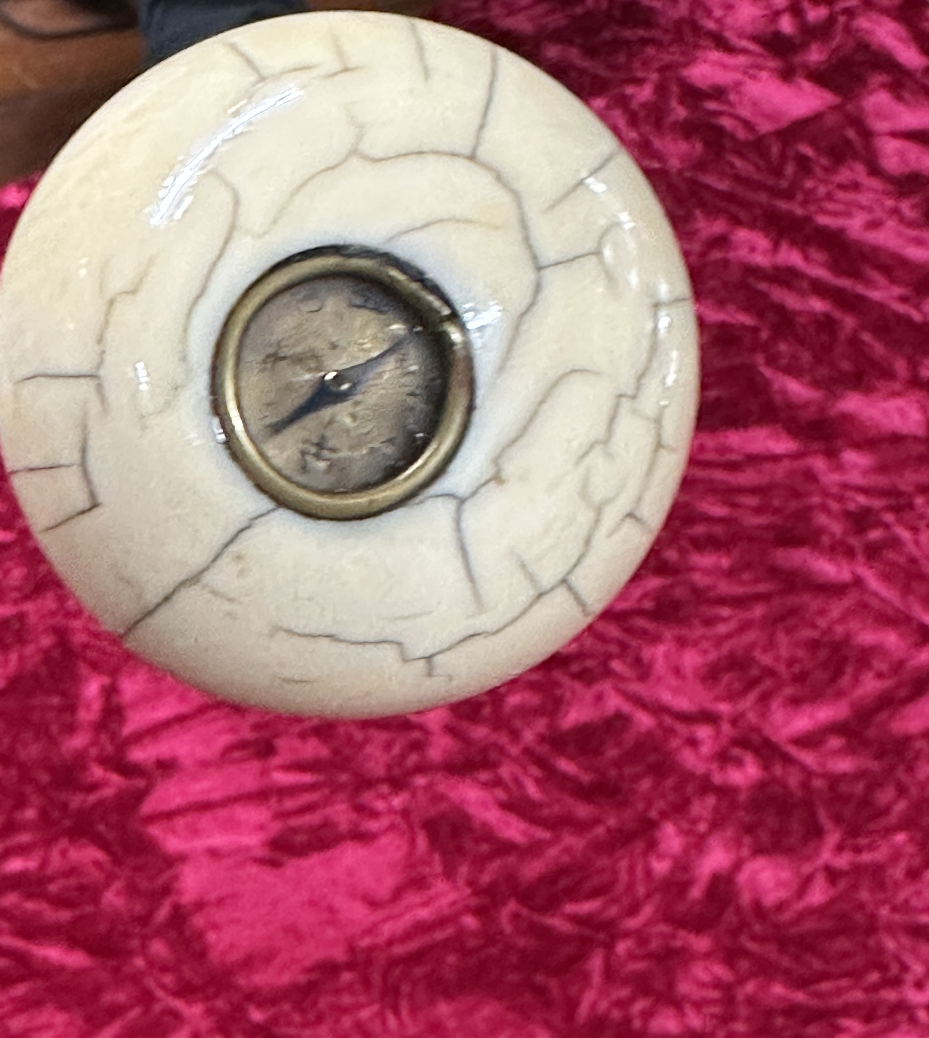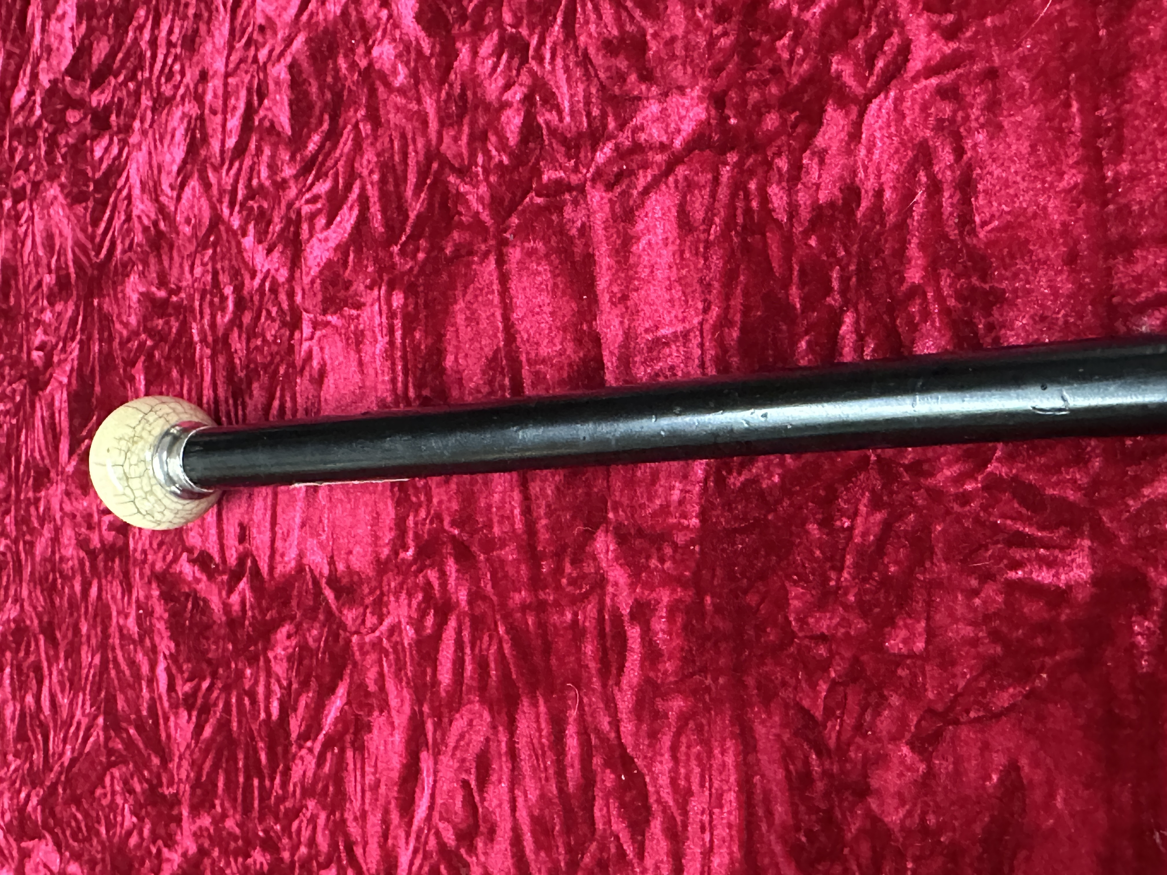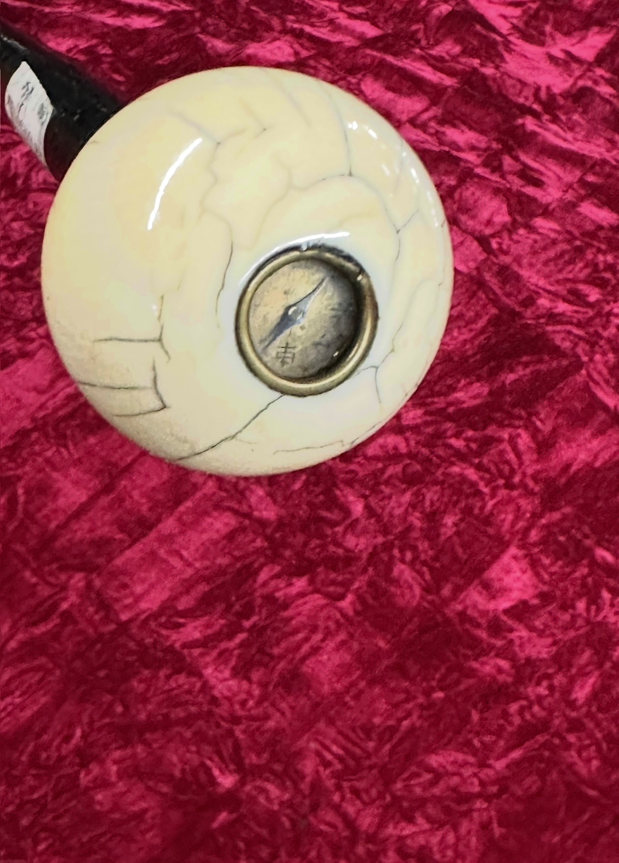 This walking stick features a spherical off-white knob constructed from an organic material or early synthetic. The top of the knob is inset with a small circular compass housed within a metal bezel. The compass face is marked with the Chinese character 南 (Nán), signifying South. The knob is joined to a dark ebonised wooden shaft by a narrow metal collar.