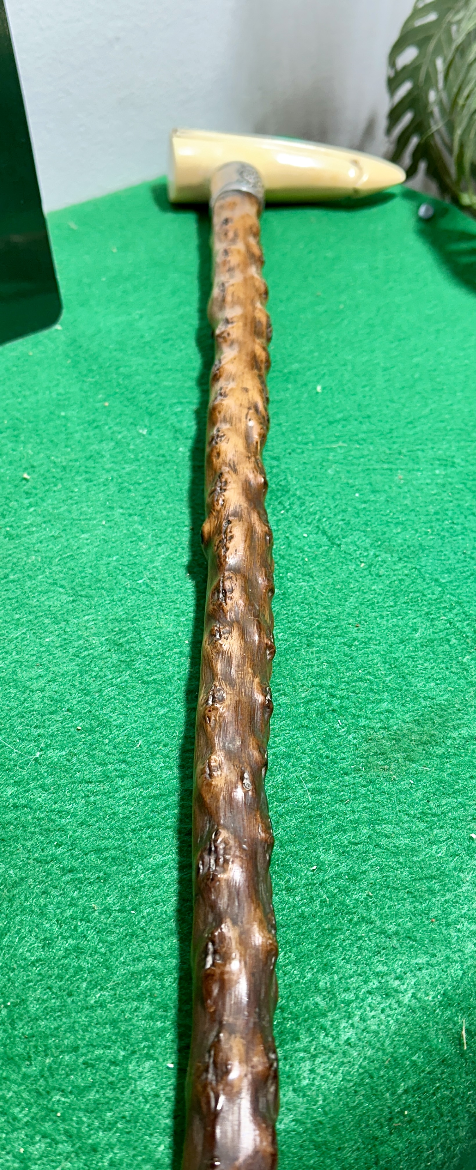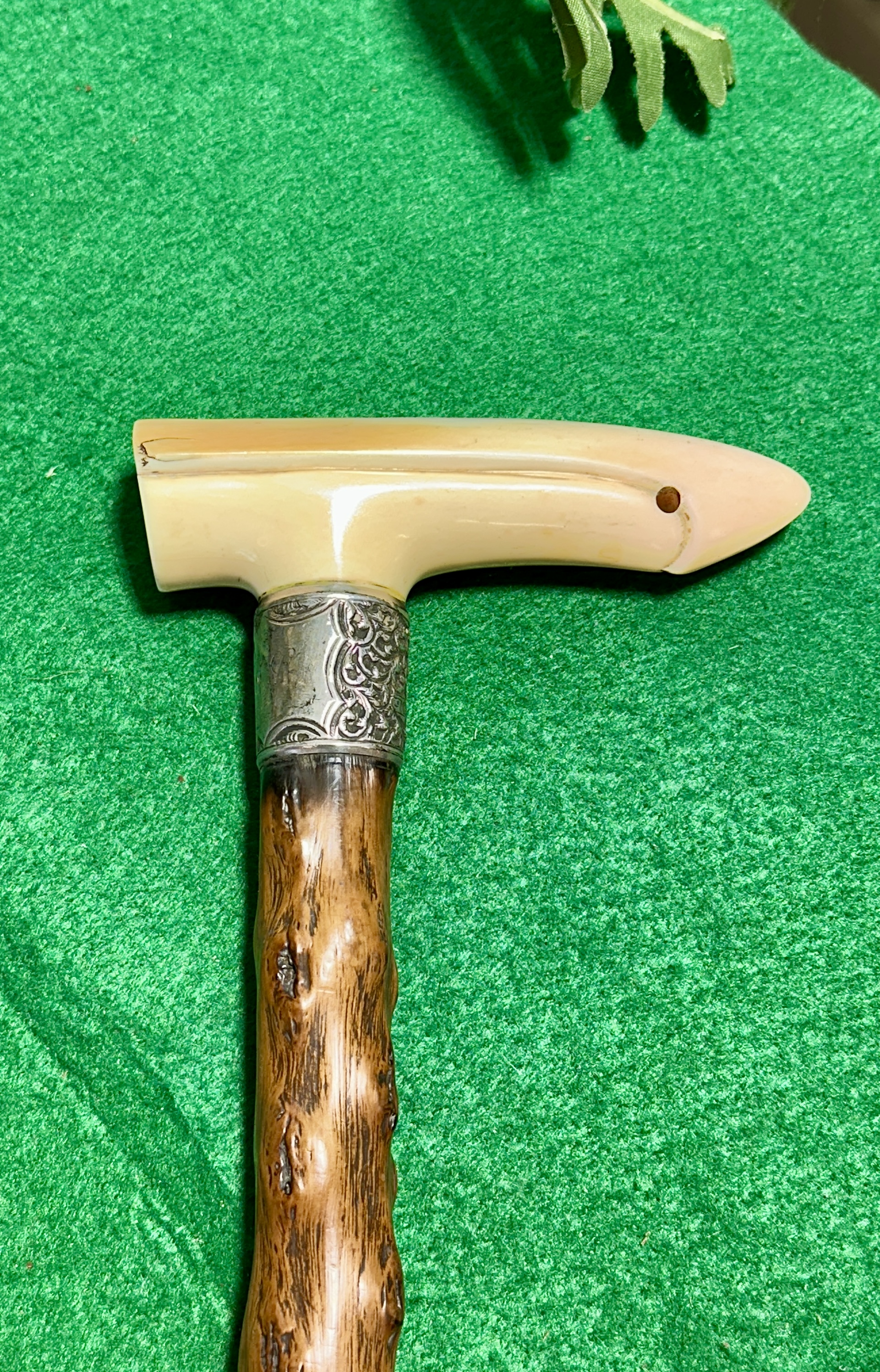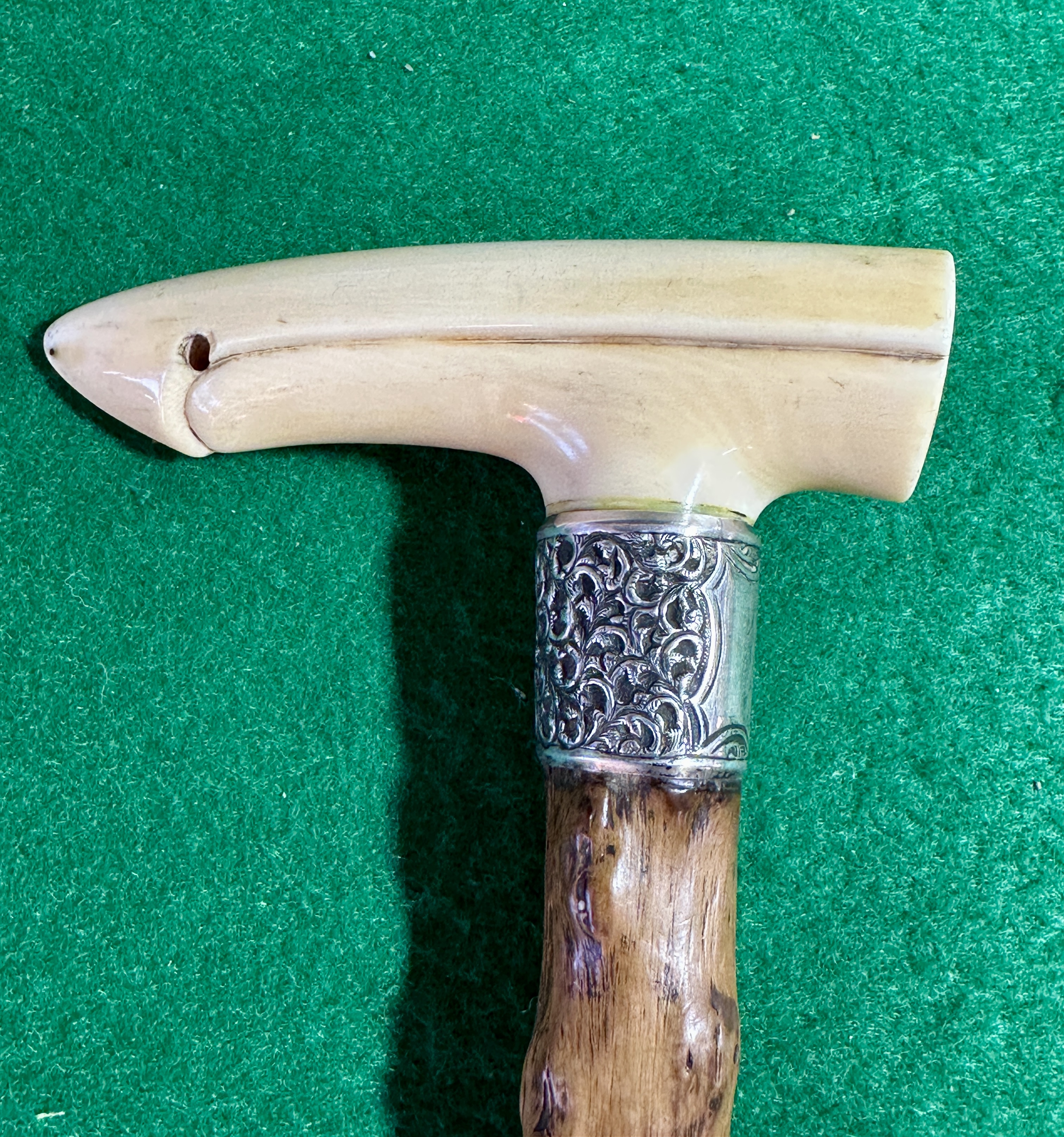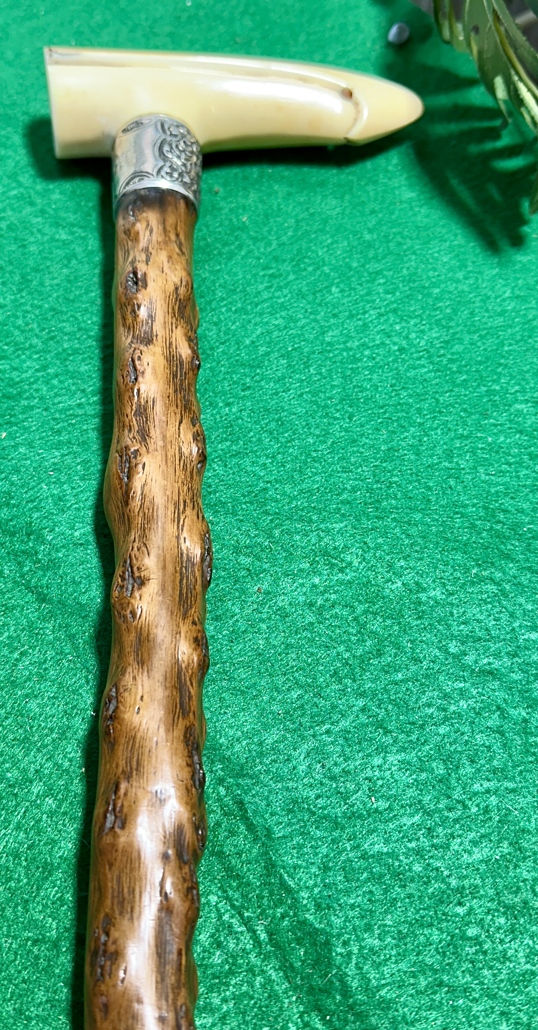 An antique walking stick featuring a sterling silver collar and an Irish blackthorn shaft. The T-shaped handle is crafted from a smooth natural material, such as antler or bone, and features a tapered end with a pre-drilled hole. The handle is joined to the shaft by an ornate metal collar decorated with embossed scrolling foliate patterns. The shaft is composed of rustic, knobby blackthorn wood, finished with a dark, lustrous polish that highlights the natural texture of the timber.