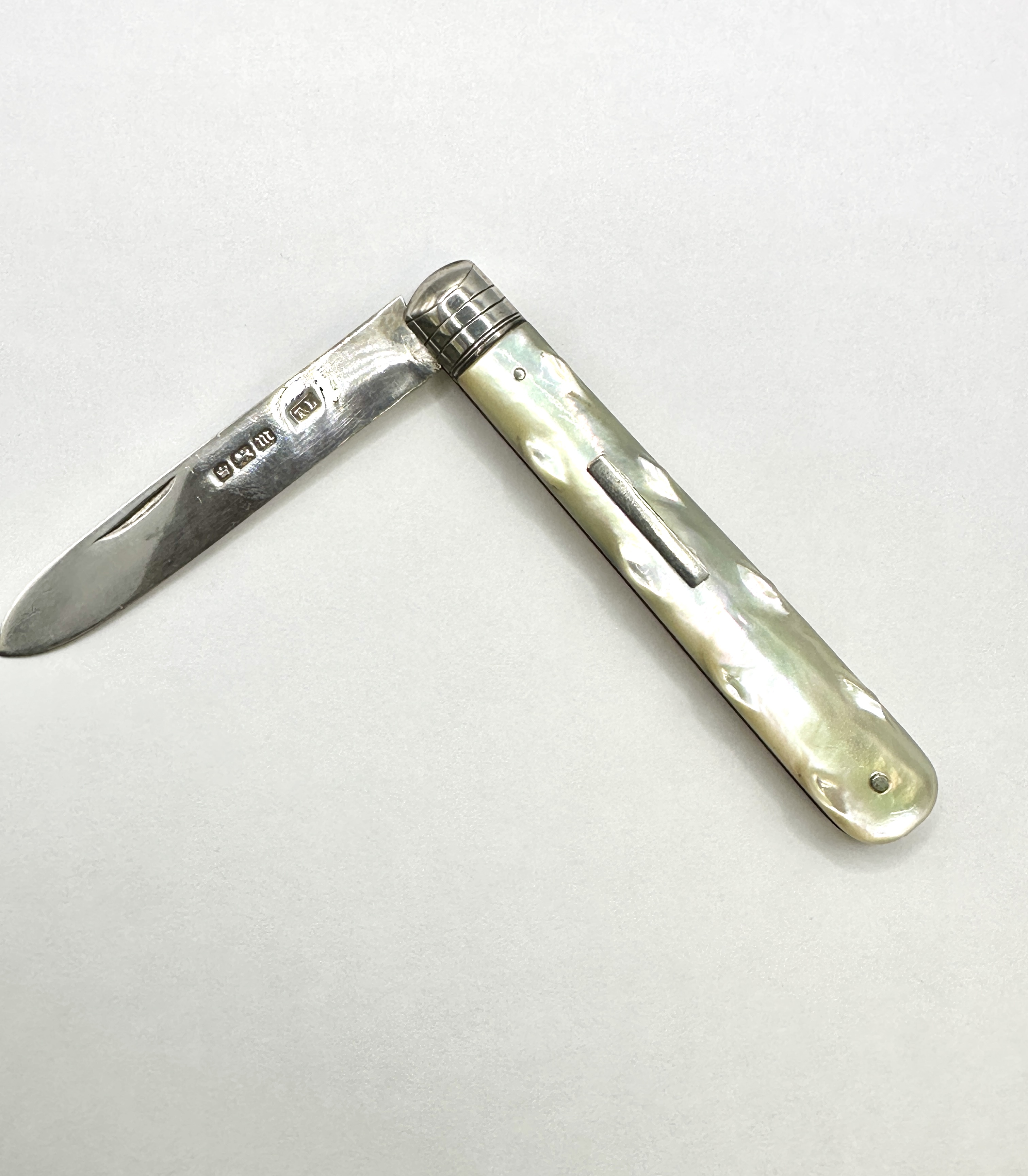 An Edwardian folding fruit knife featuring a 925 silver blade and polished mother-of-pearl handle scales. The blade is struck with a set of Sheffield hallmarks, including the crown, lion passant, the date letter m for 1904, and the maker mark AL for Arthur Ledger. The iridescent mother-of-pearl handle is decorated with carved indentations along its edges and contains a small, blank rectangular silver-toned inset on one side. The scales are secured by metal pins and the knife features a rounded, decorated bolster.