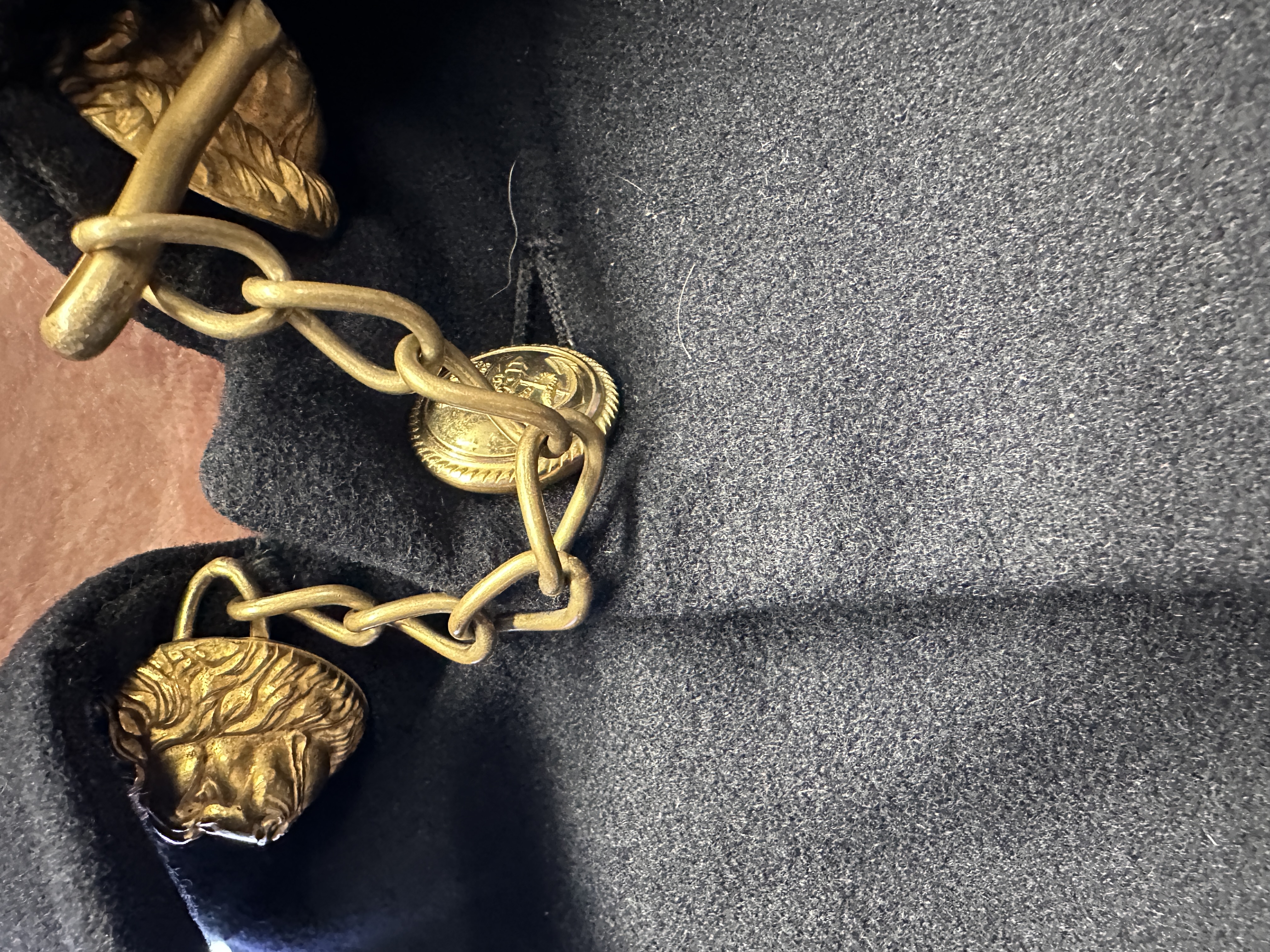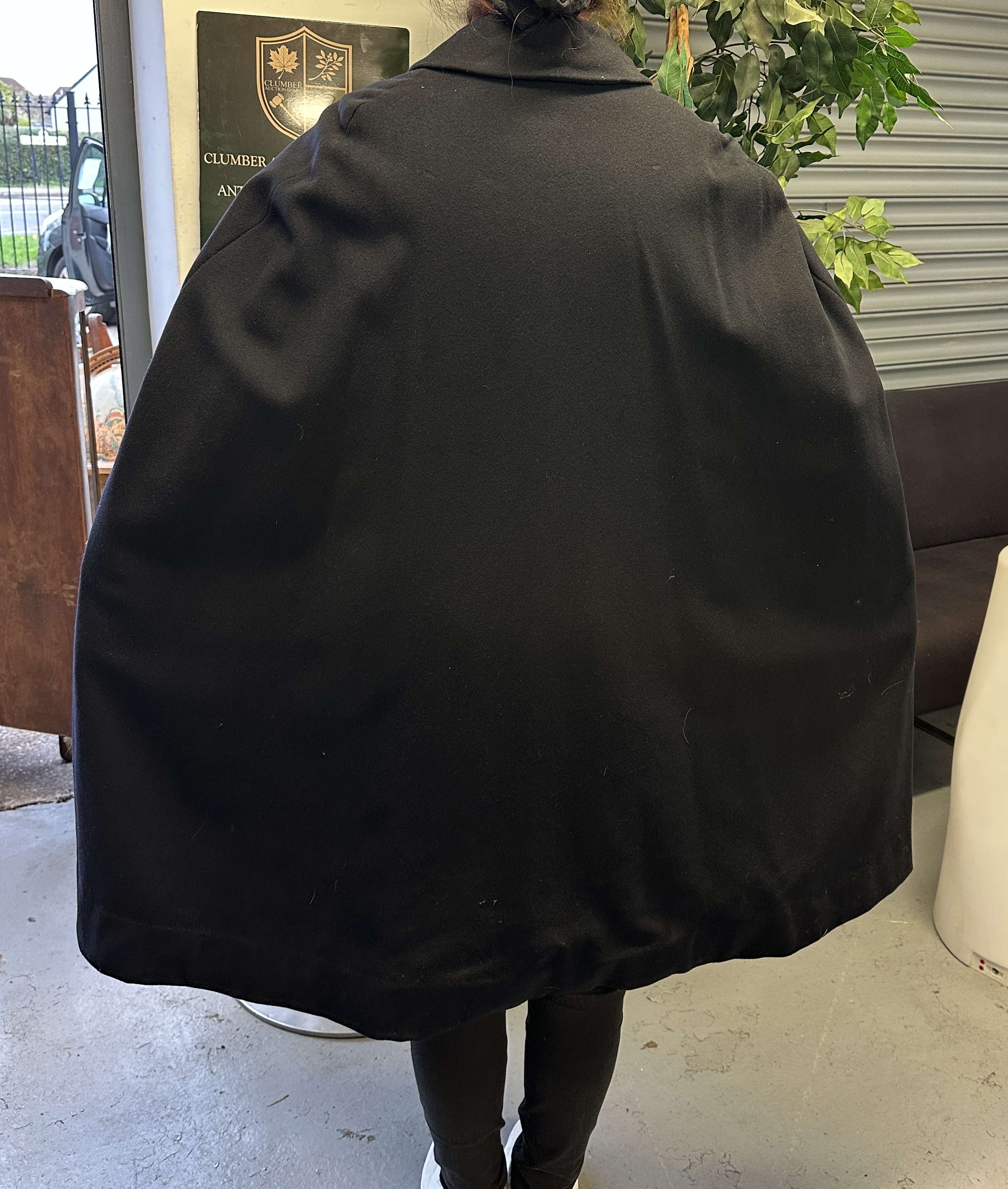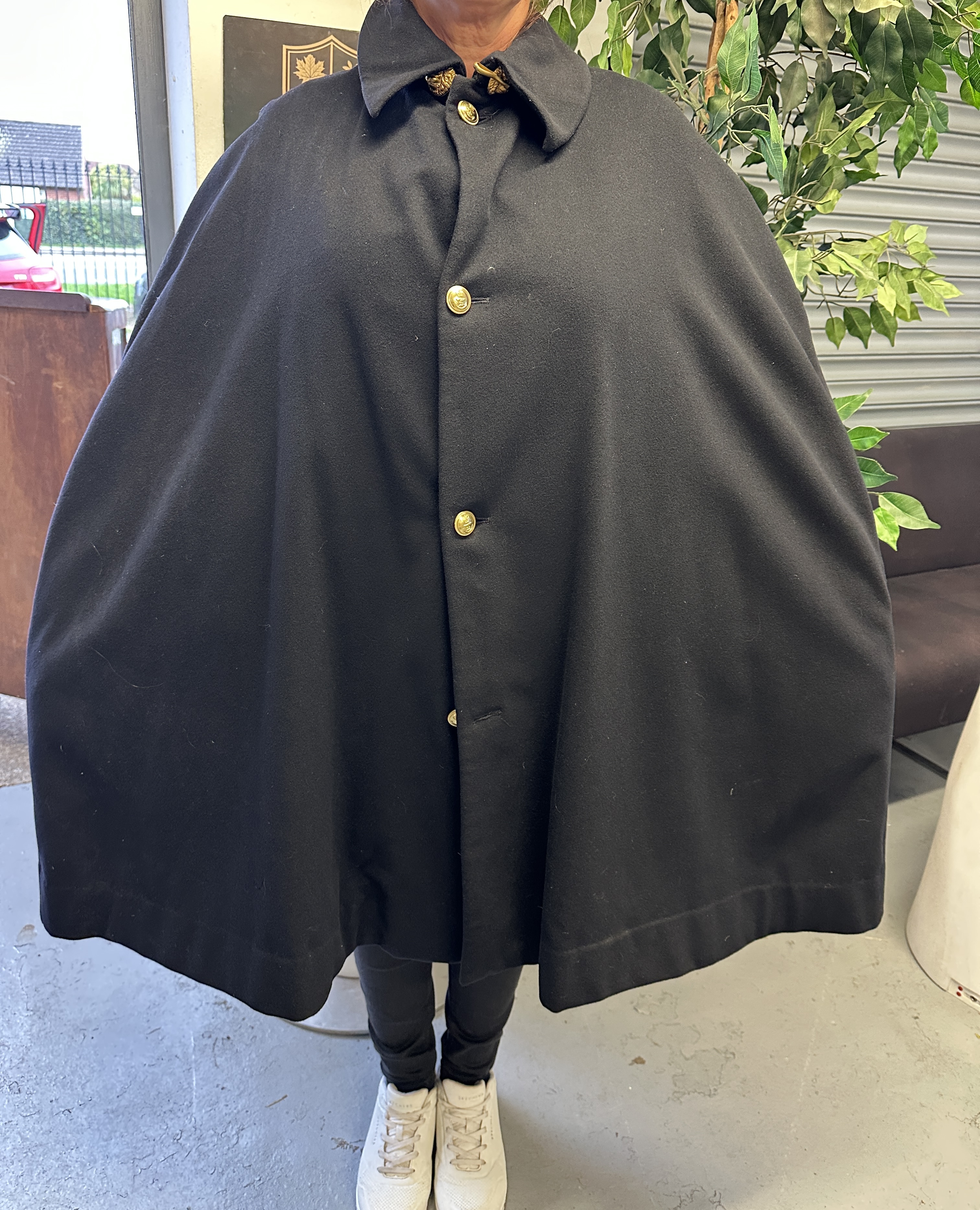 A naval officer’s boat cloak of traditional maritime design. The garment is constructed from a heavy-weight black melton wool. It features a turn-down collar and a vertical front closure with gold-toned buttons, each embossed with an anchor motif. The collar is accented by a pair of ornate gold-toned lion-head clasps joined by a short curb chain. No maker’s marks or labels are present on the garment.
