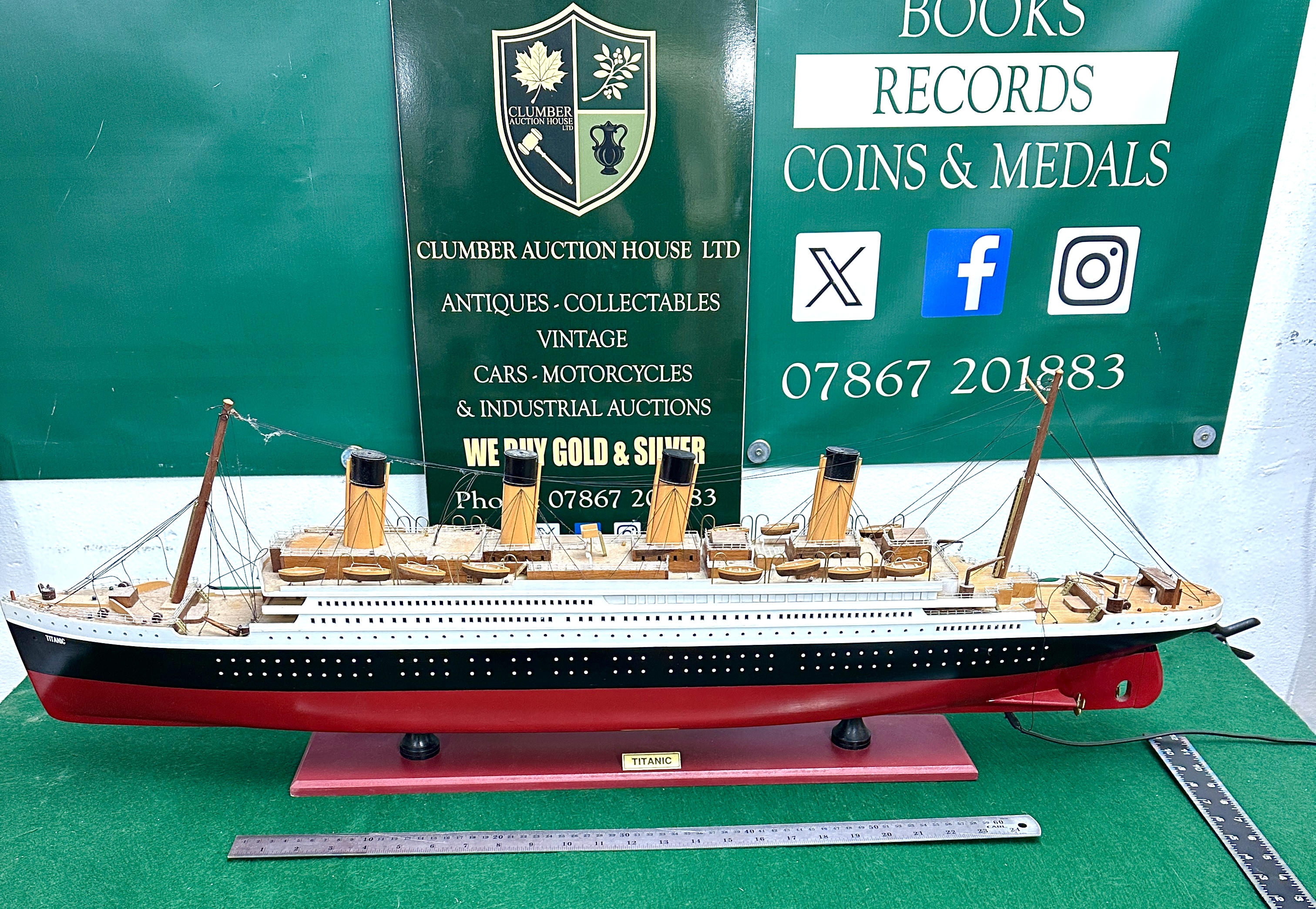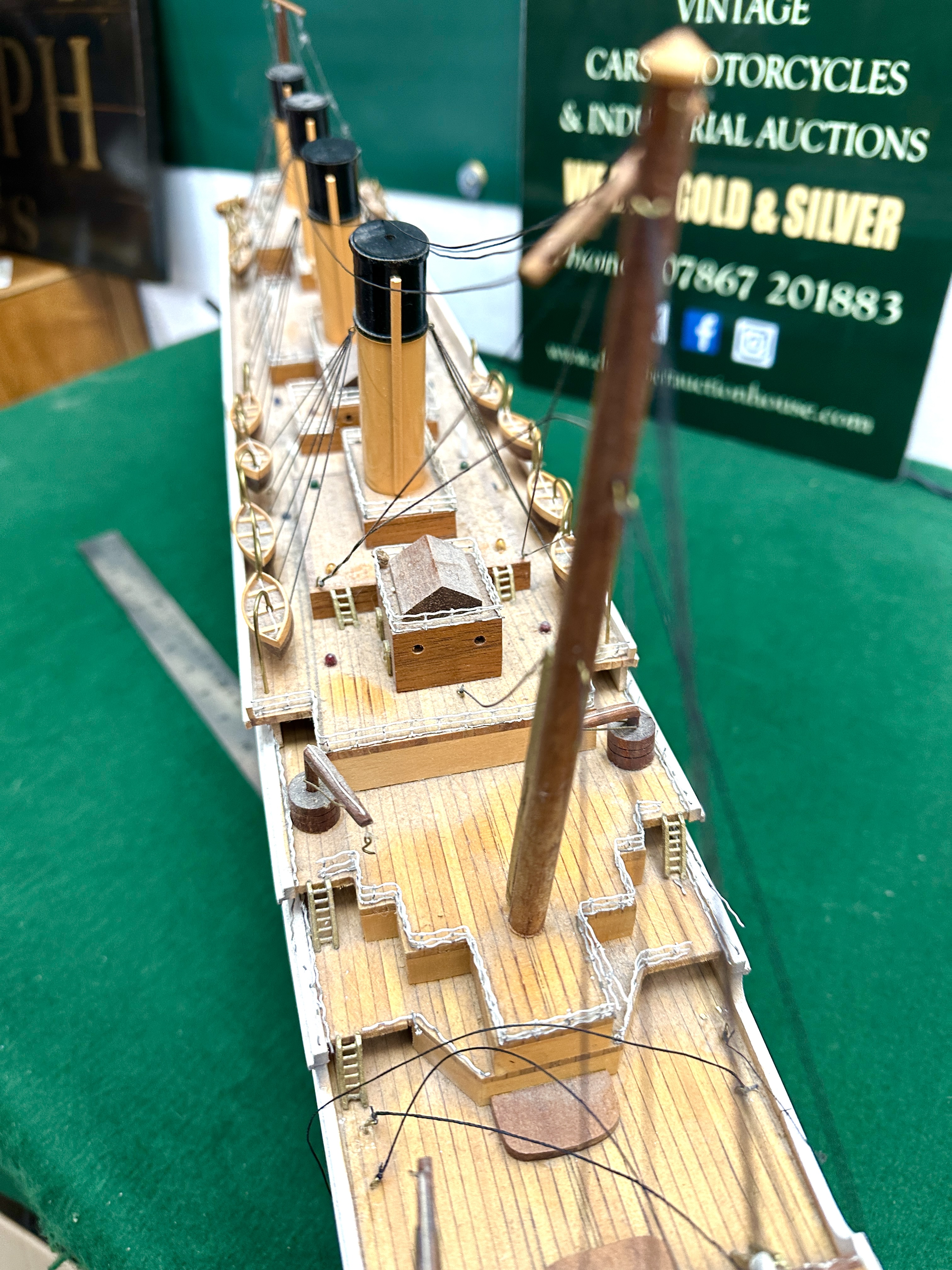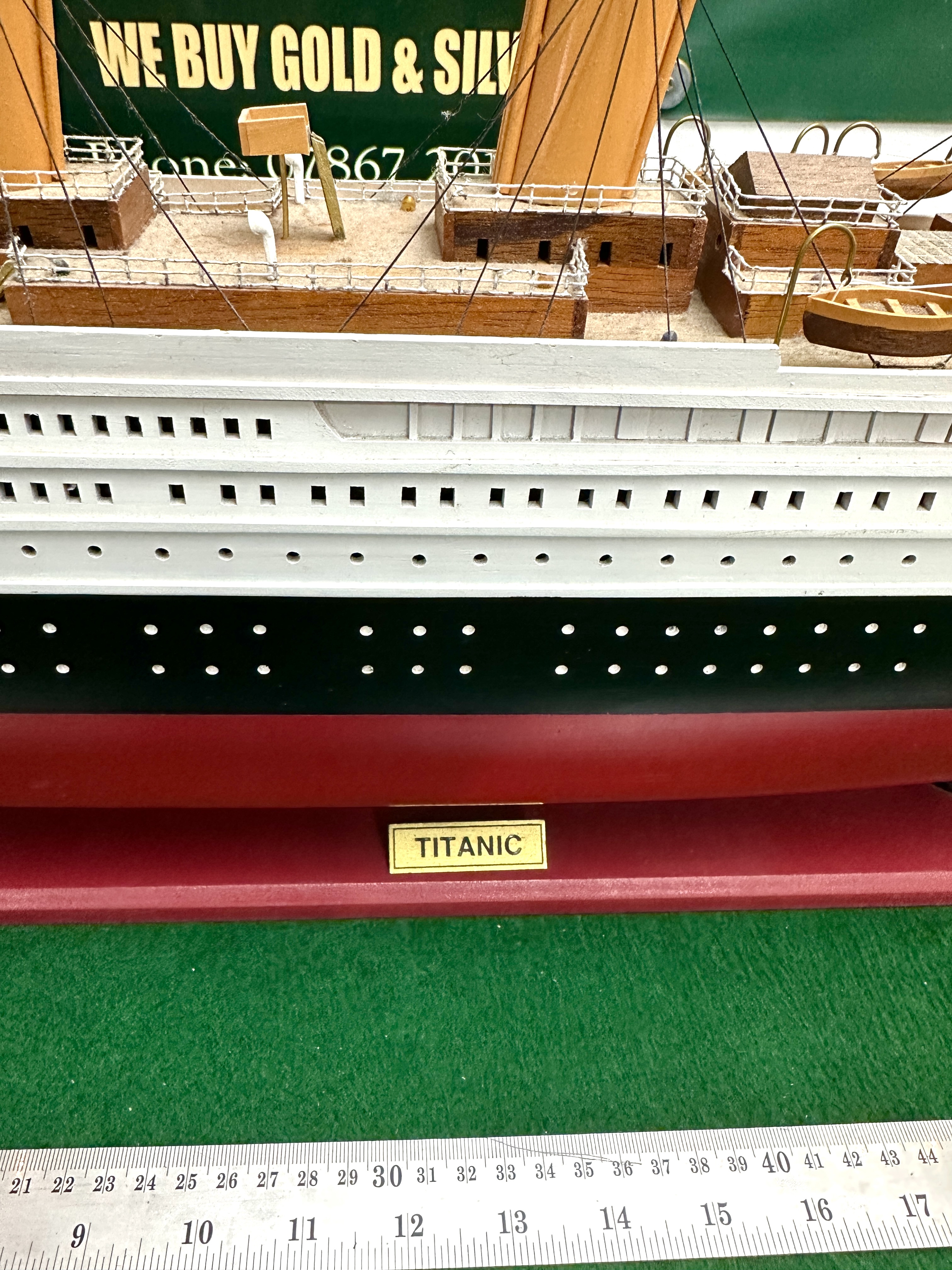 A handcrafted wooden scale model of the RMS Titanic, featuring a hull finished in red, black, and white. The model is detailed with multiple decks, four yellow and black funnels, and various lifeboats and masts with rigging. The piece is mounted on a red-painted wooden base which includes a gold-coloured plaque inscribed TITANIC, a name which also appears at the vessel’s bow and stern. A black electrical cord protrudes from the stern, indicating an internal lighting system.