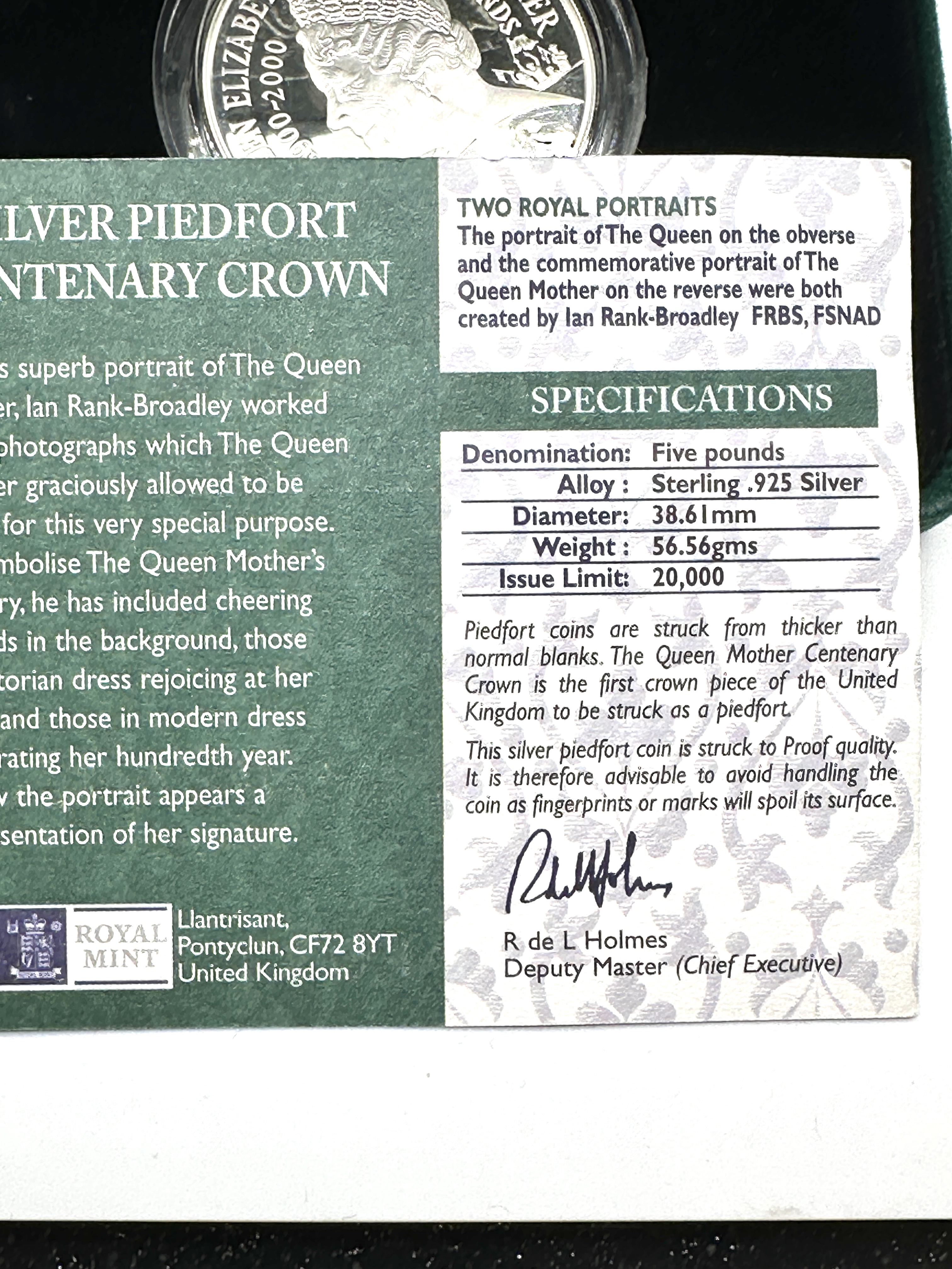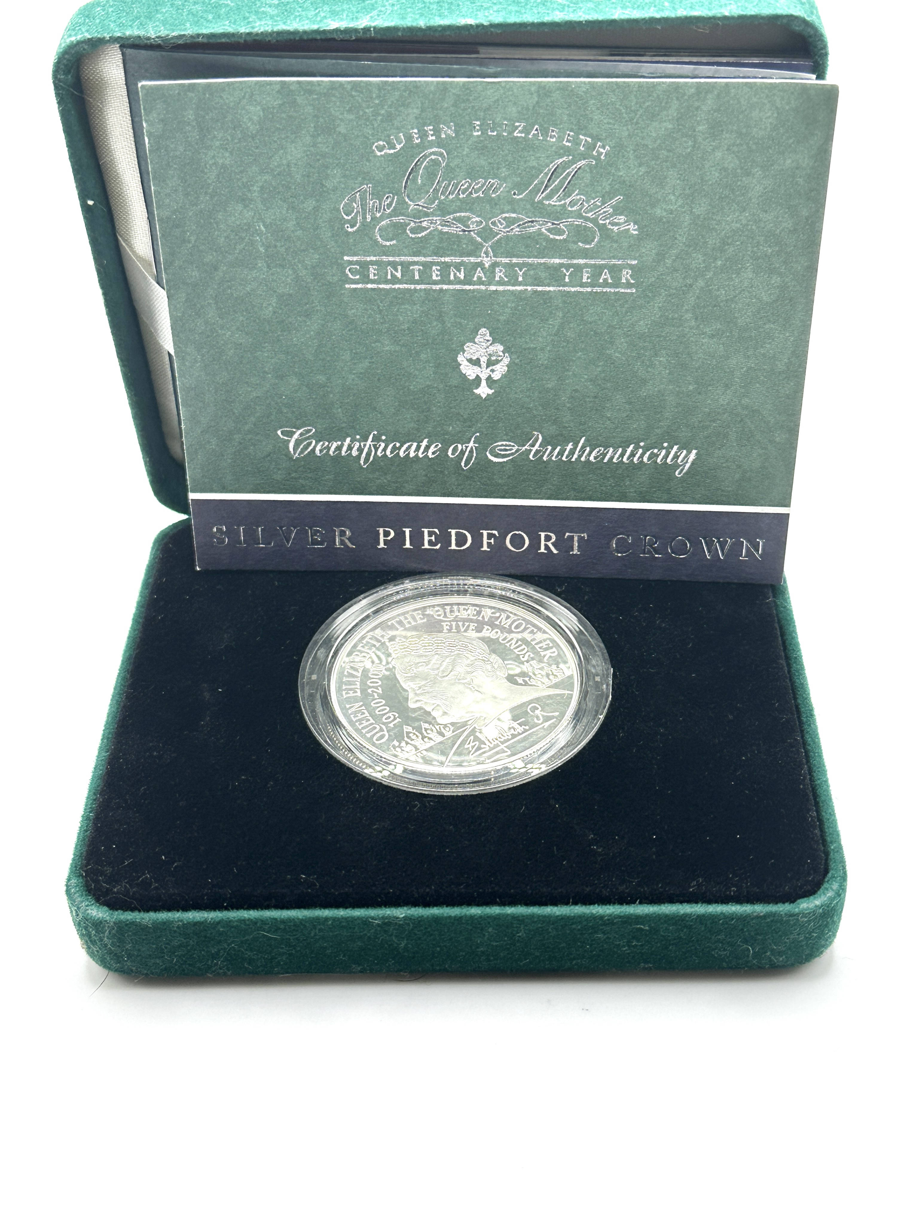 A single presentation set containing the Royal Mint 2000 Queen Mother Centenary Silver Piedfort Crown. The coin is struck to Proof quality and commemorates the 100th birthday of Queen Elizabeth The Queen Mother. The coin is confirmed to be Sterling 925 silver. The obverse displays a double portrait of Queen Elizabeth II and the Queen Mother, inscribed QUEEN ELIZABETH II 2000 and THE QUEEN MOTHER FIVE POUNDS. The coin is housed in its original dark green velvet-covered hinged presentation box, complete with a black velour-lined interior and the official Certificate of Authenticity booklet issued by the Royal Mint. Piedfort coins are struck on thicker blanks than standard issues.