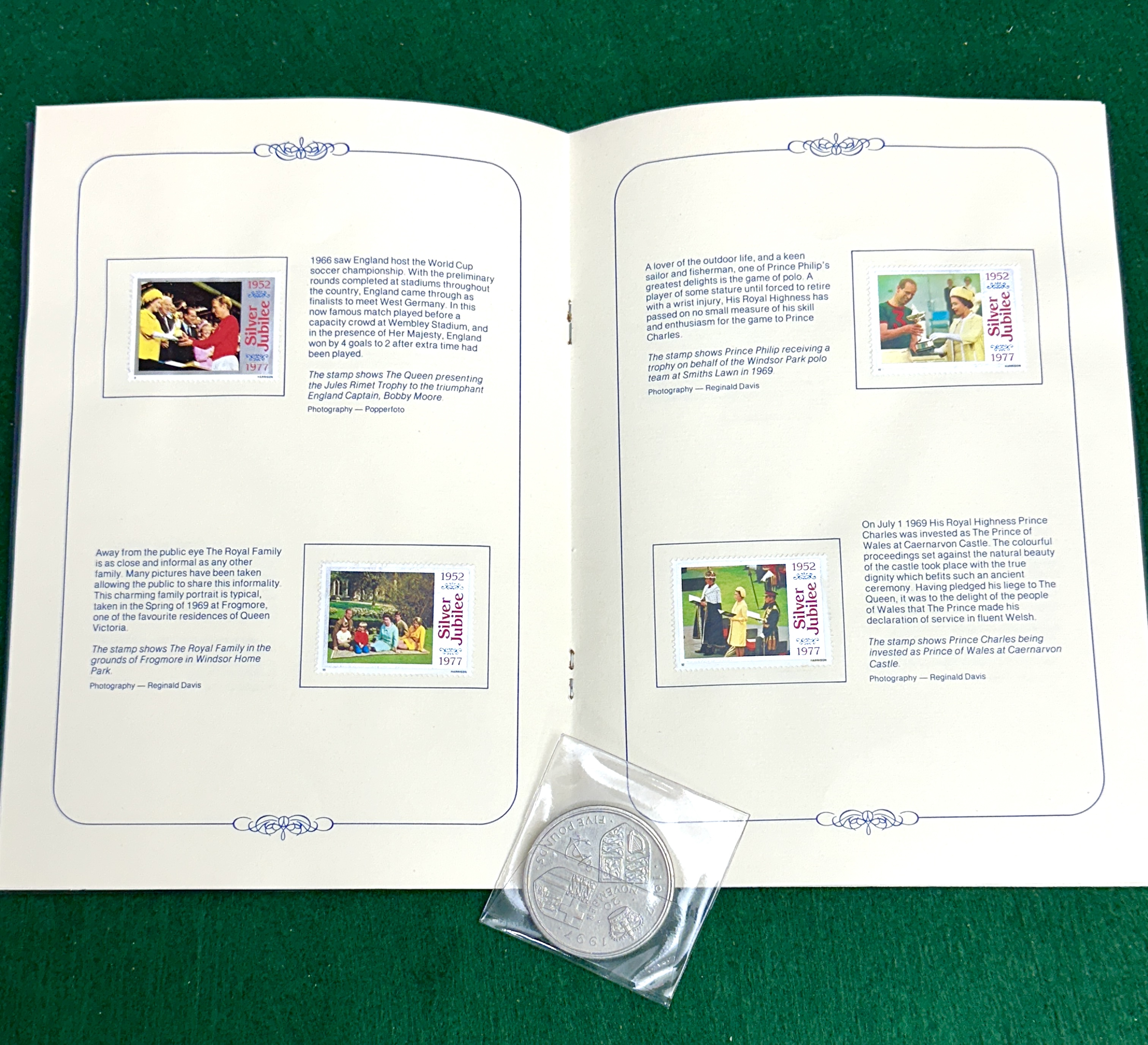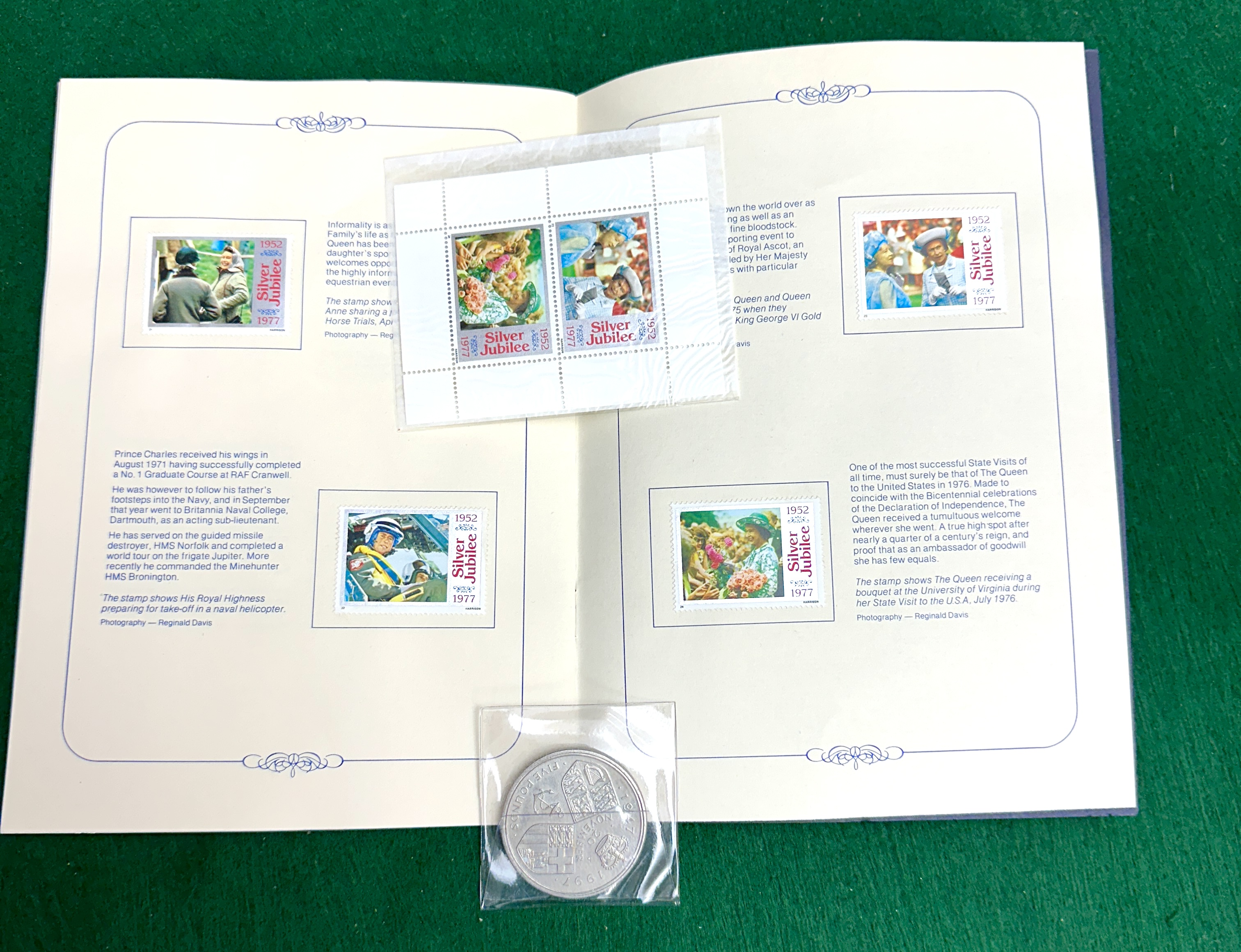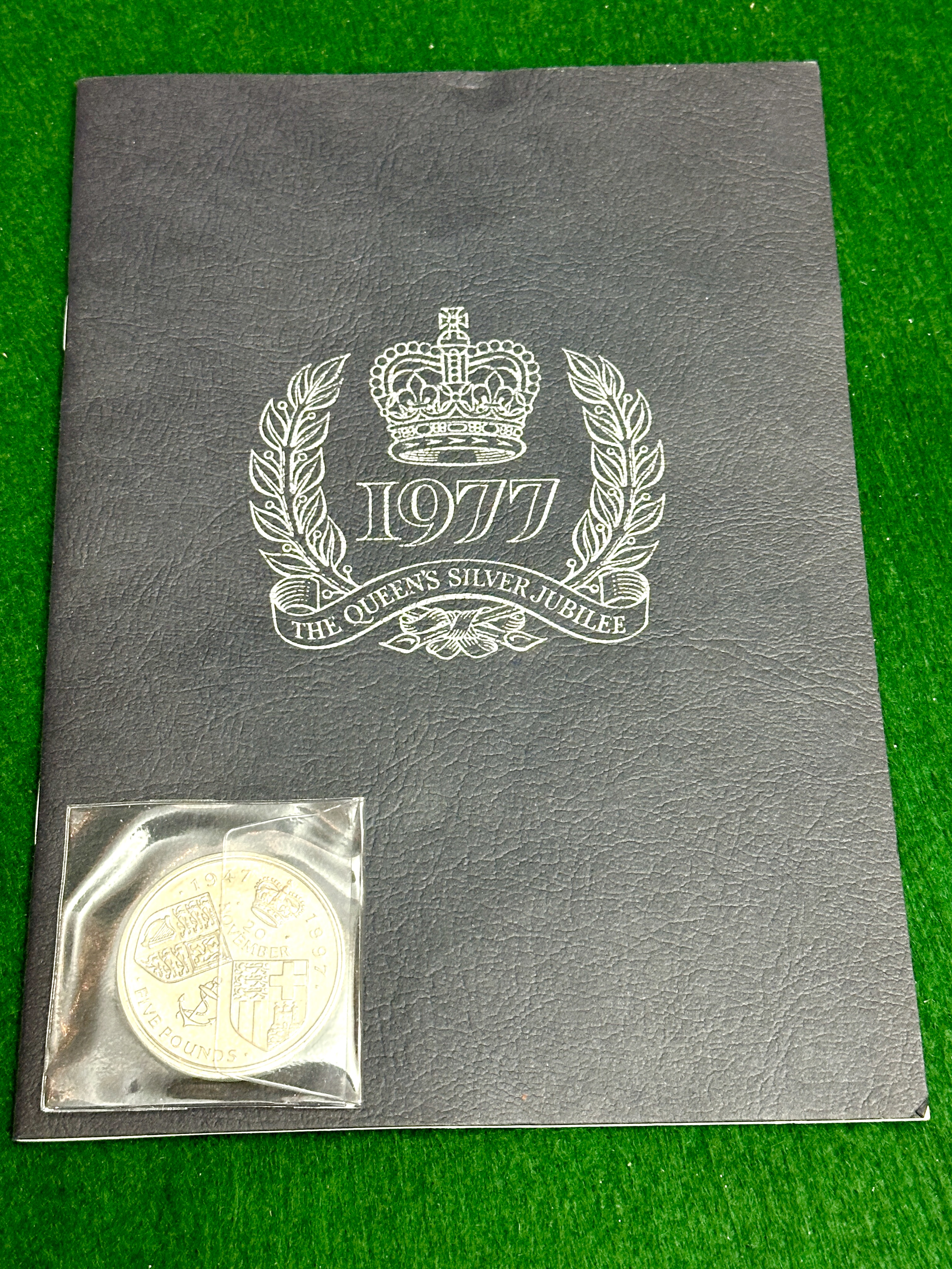 A collection of British Royal Family commemorative items. The lot features a dark-coloured, textured paper booklet produced for the 1977 Silver Jubilee of Queen Elizabeth II, decorated with a silver-tone crown and laurel emblem. The interior contains a series of illustrated postage stamps marked Silver Jubilee 1952 1977, alongside descriptive text and photographic reproductions. Accompanying the booklet is a United Kingdom five-pound coin, presented in a clear plastic sleeve. The reverse of the coin is dated 1947 1997 and bears the inscription 20 NOVEMBER, commemorating the Golden Wedding Anniversary of Queen Elizabeth II and Prince Philip.