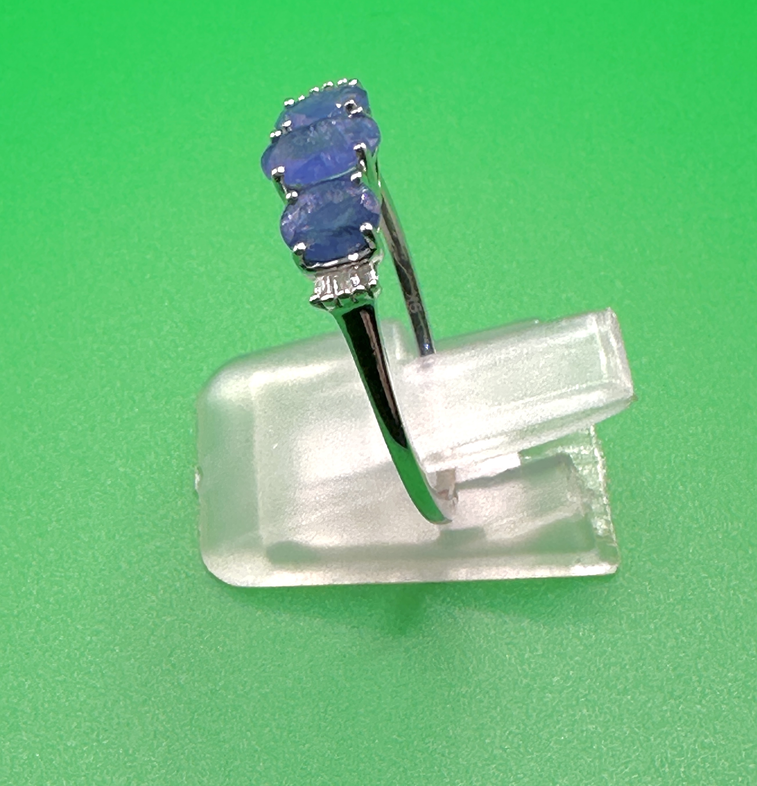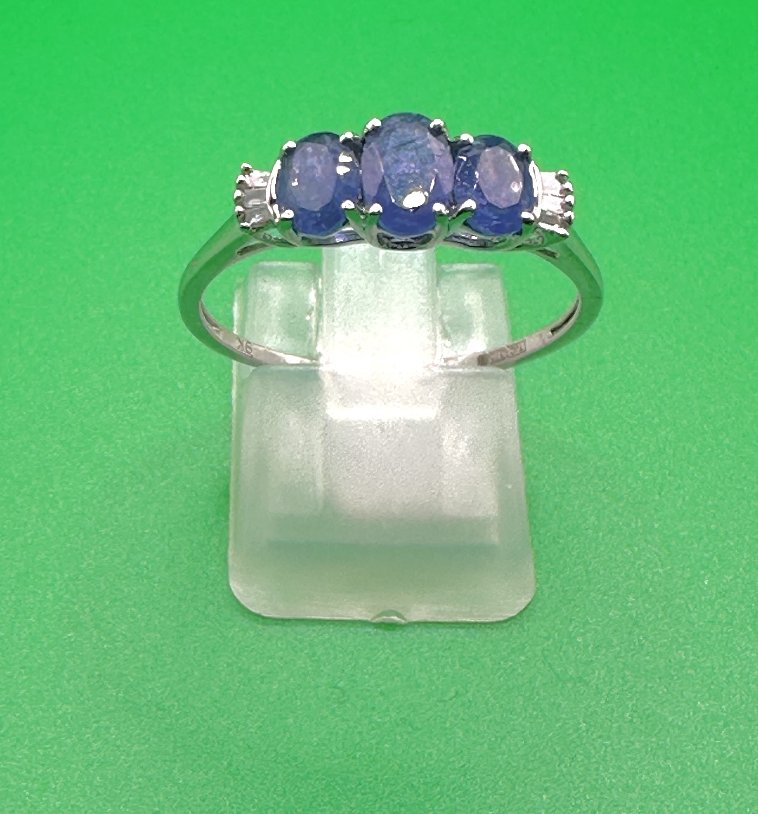 A 9k white gold ring featuring a three-stone setting. The mount holds three oval-cut violet-blue gemstones, identified as tanzanites, in a prong setting. The shoulders are accented with small, channel-set diamonds. The interior of the band is stamped with a 9K hallmark.