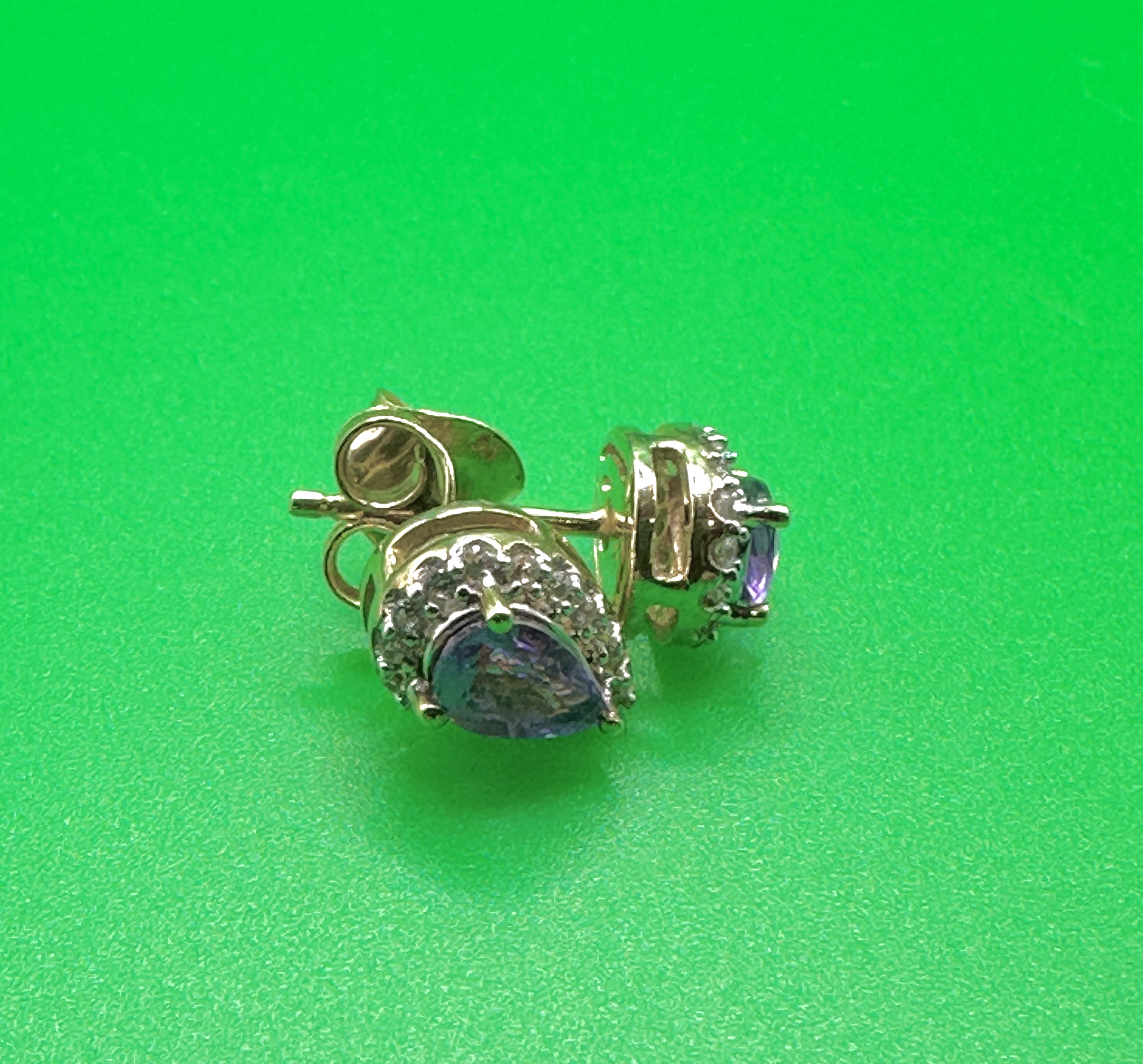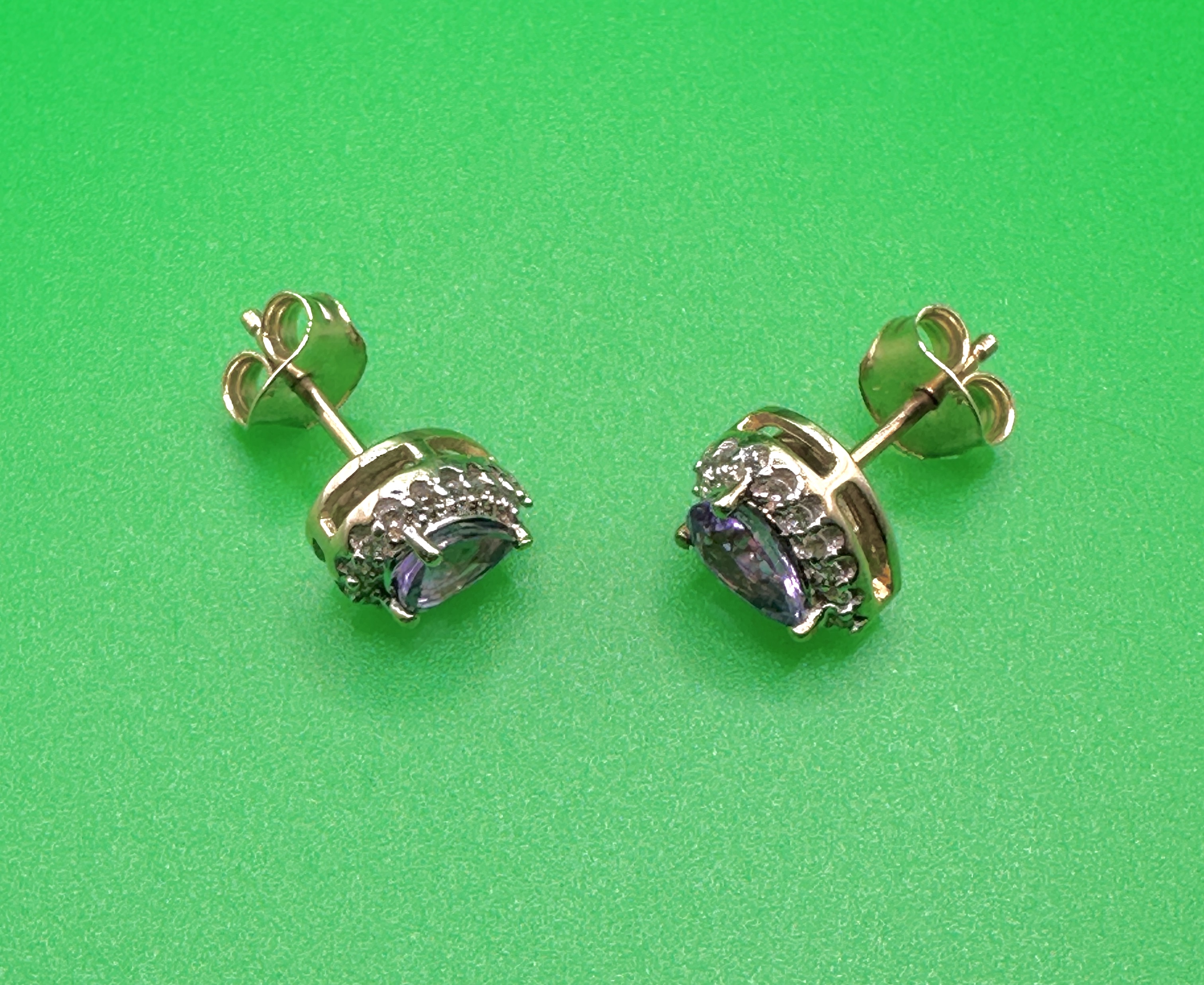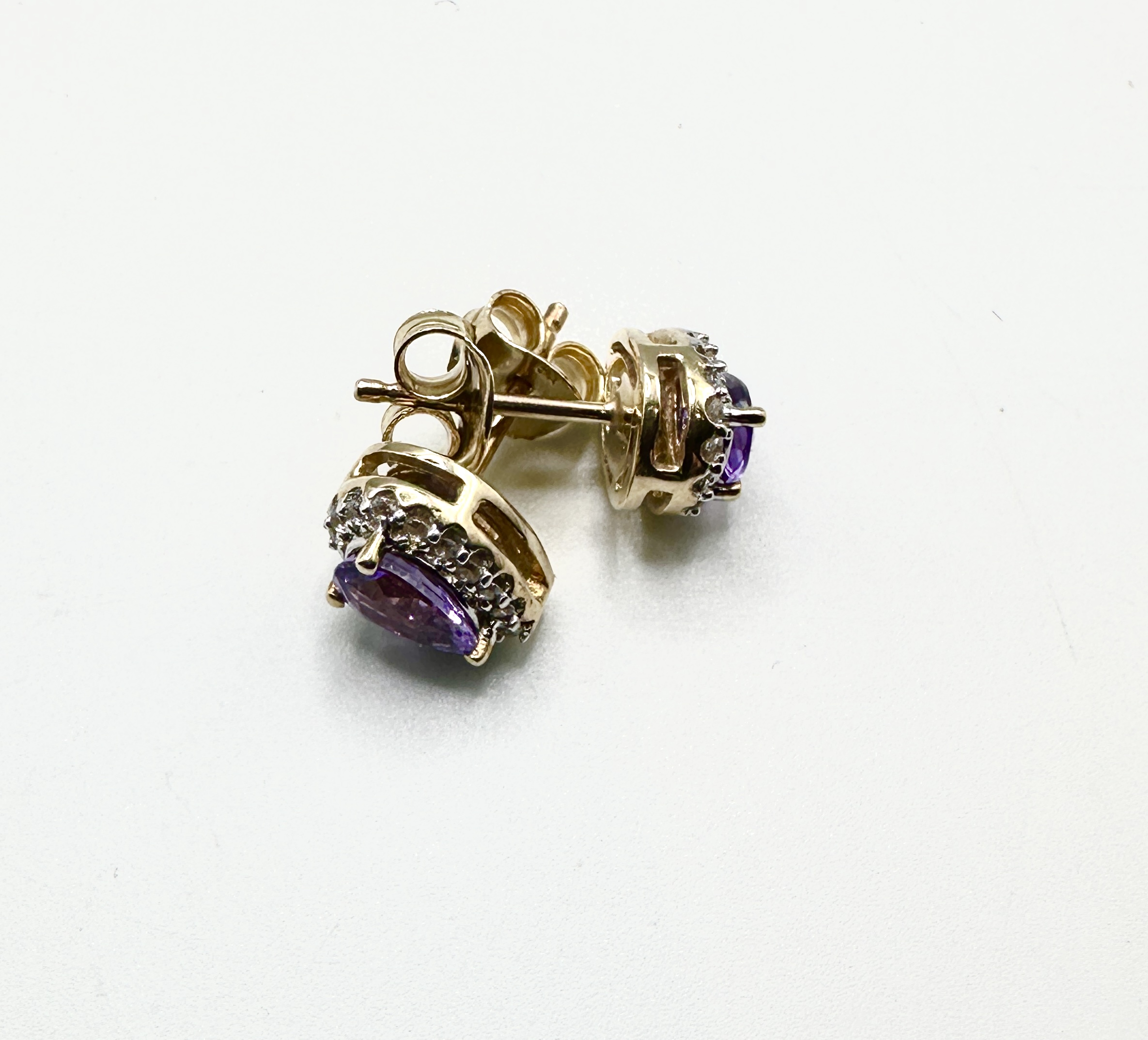 A pair of 9k yellow gold halo-style stud earrings. Each earring features a pear-cut purple gemstone, likely amethyst, claw-set within a surround of small round-cut clear accent stones. The earrings are fitted with friction posts and butterfly scroll backs.
