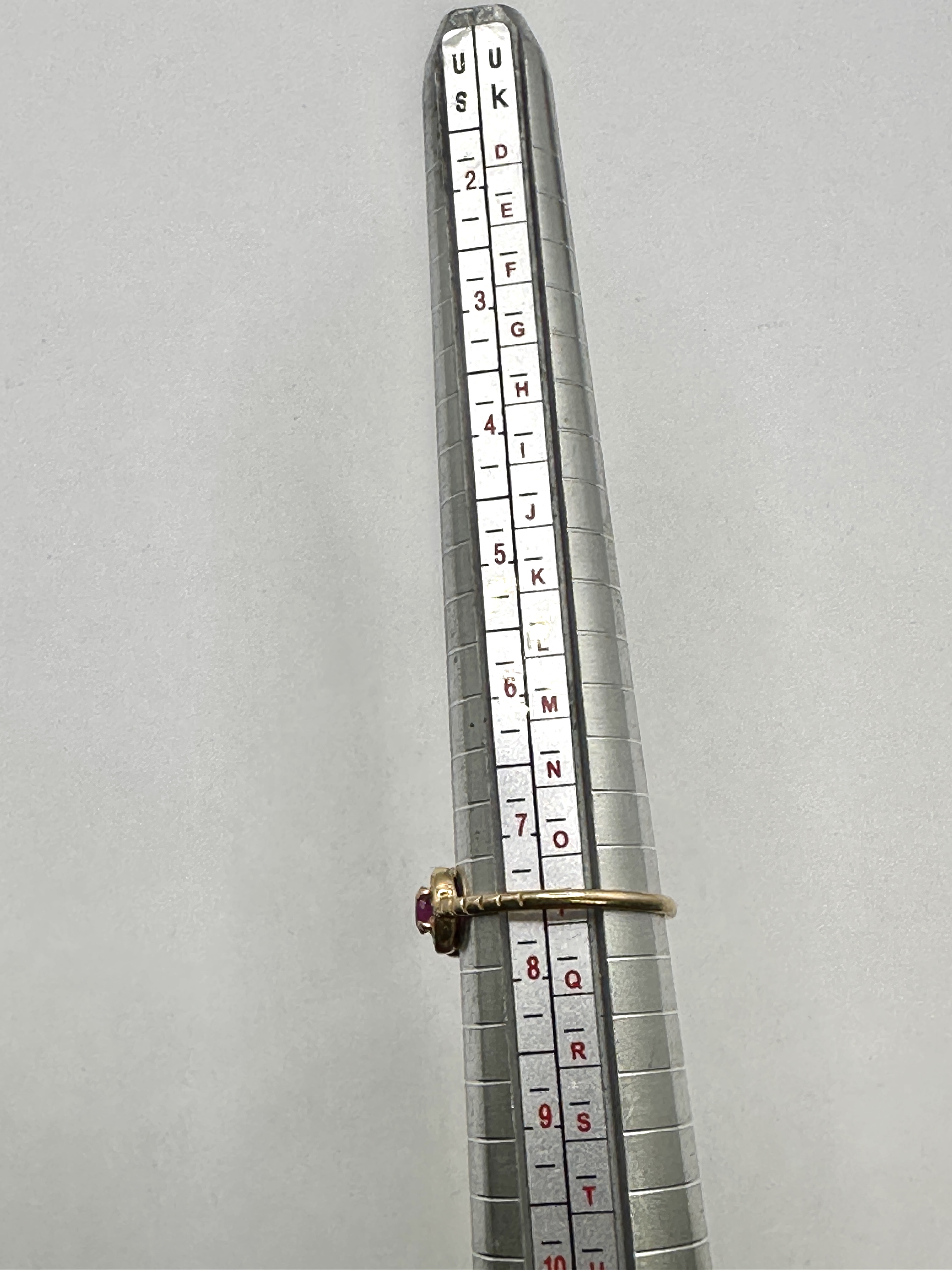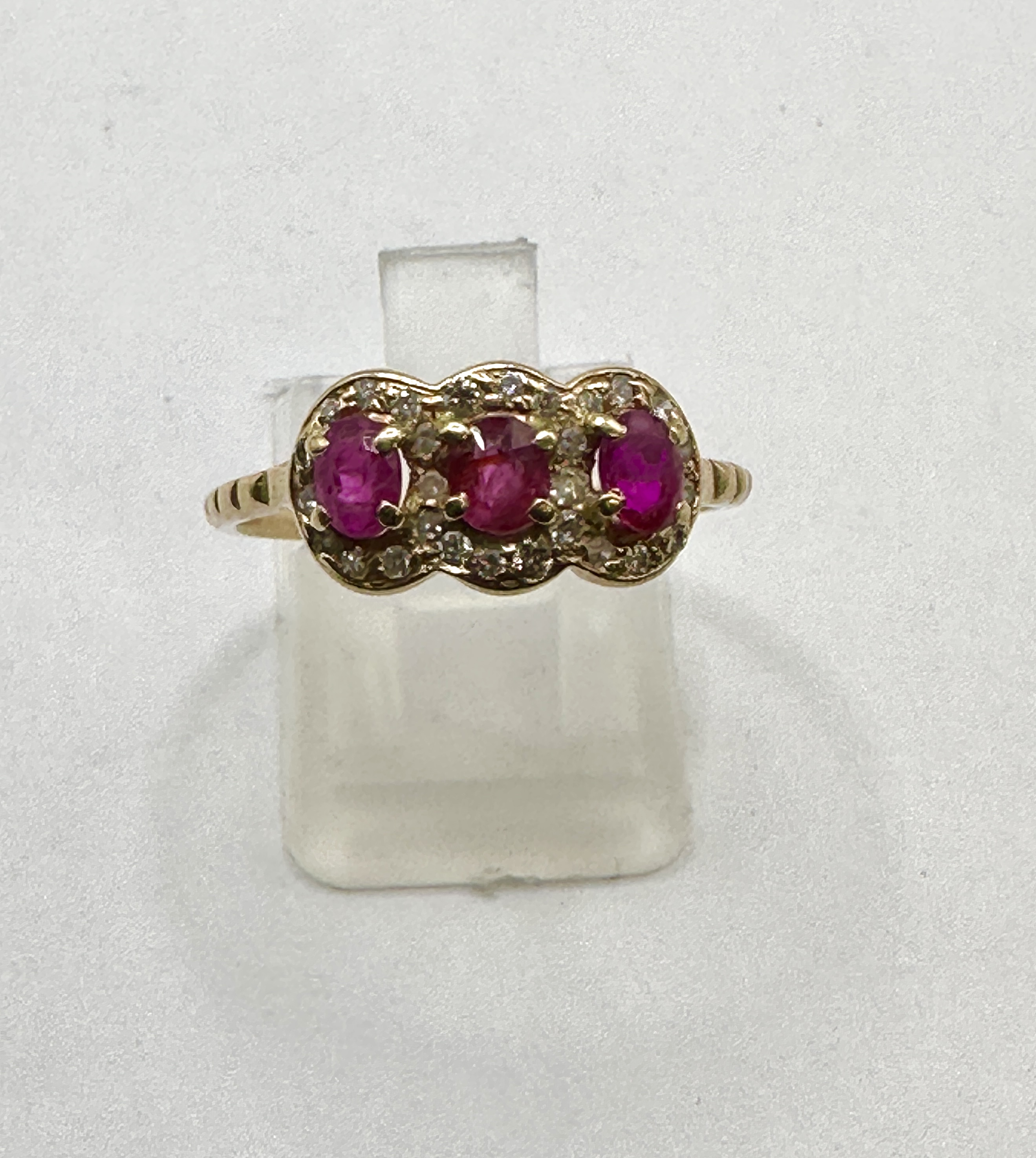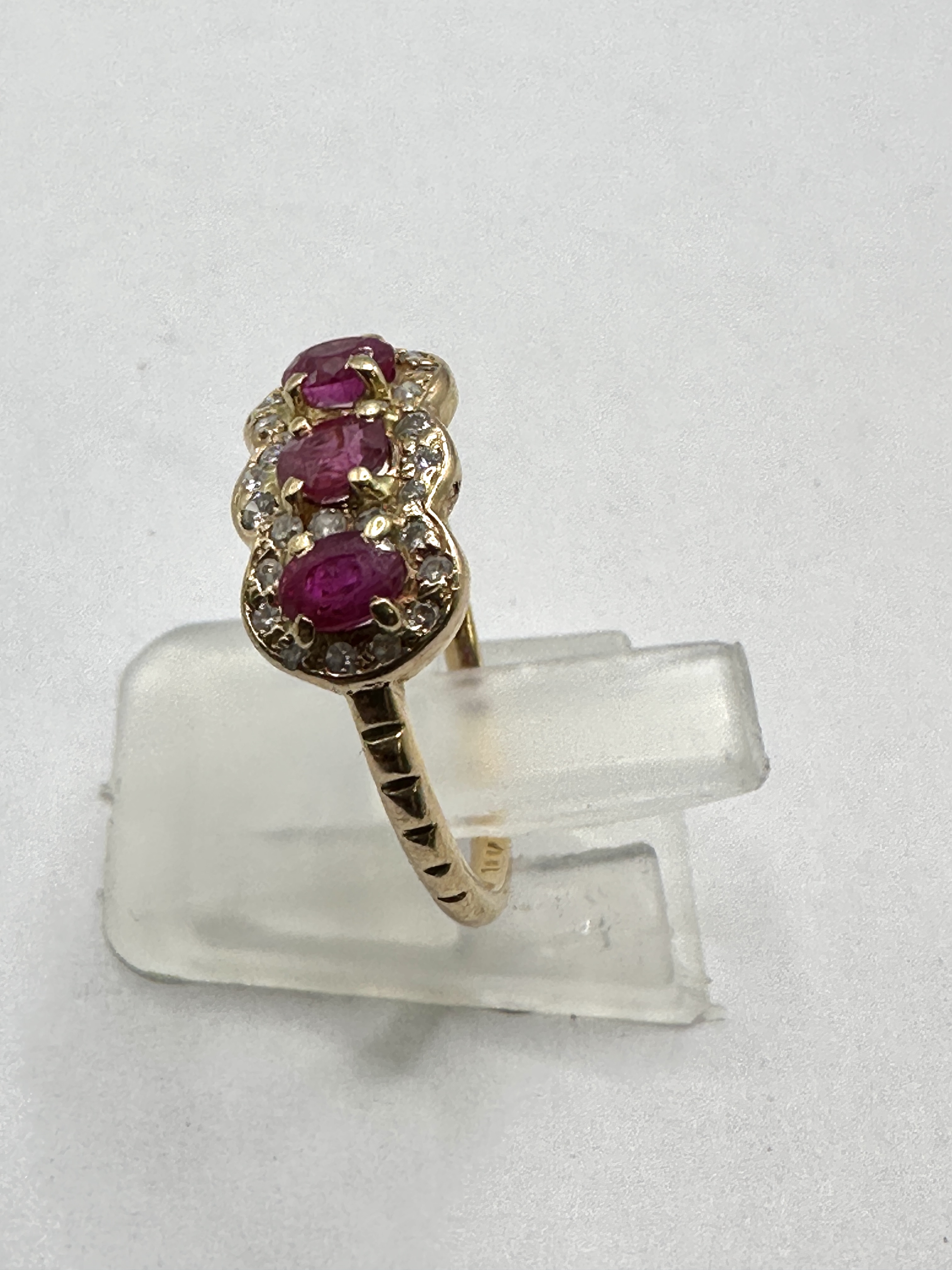 A ladies ring featuring three oval-cut pinkish-red rubies, each set within a shared scalloped halo of small, round-cut colourless diamonds. The piece is crafted in 14K yellow gold. The band displays decorative vertical notched detailing along the shoulders.