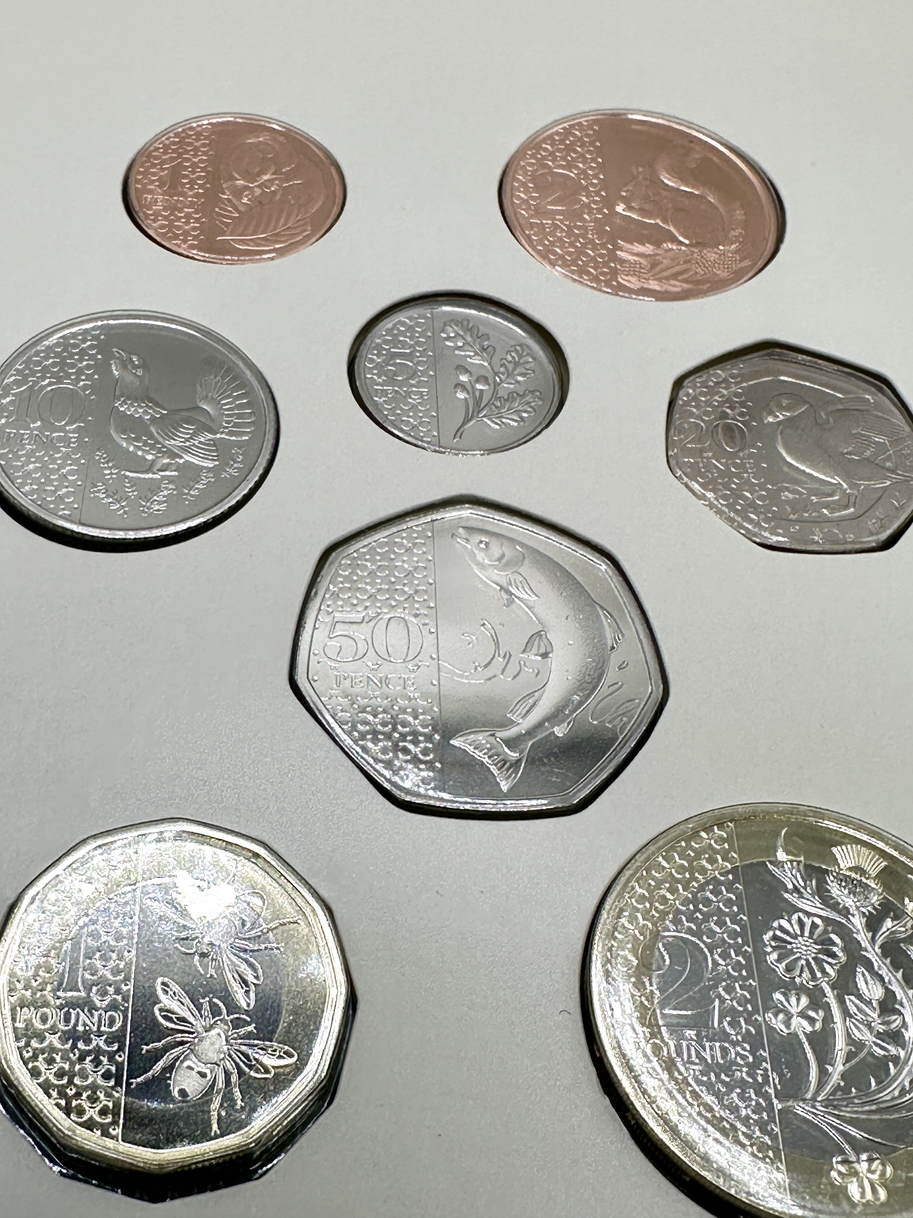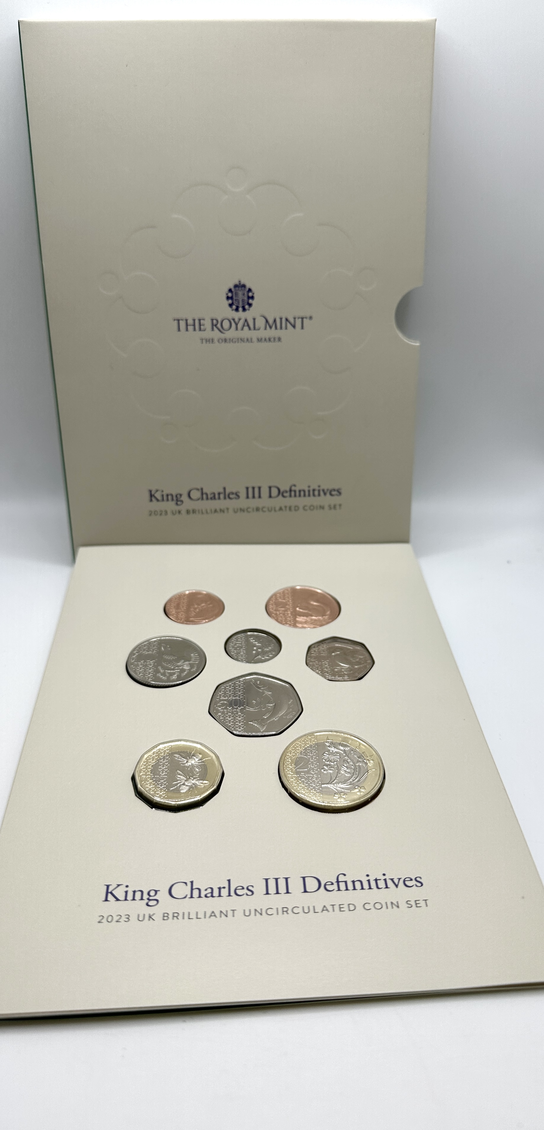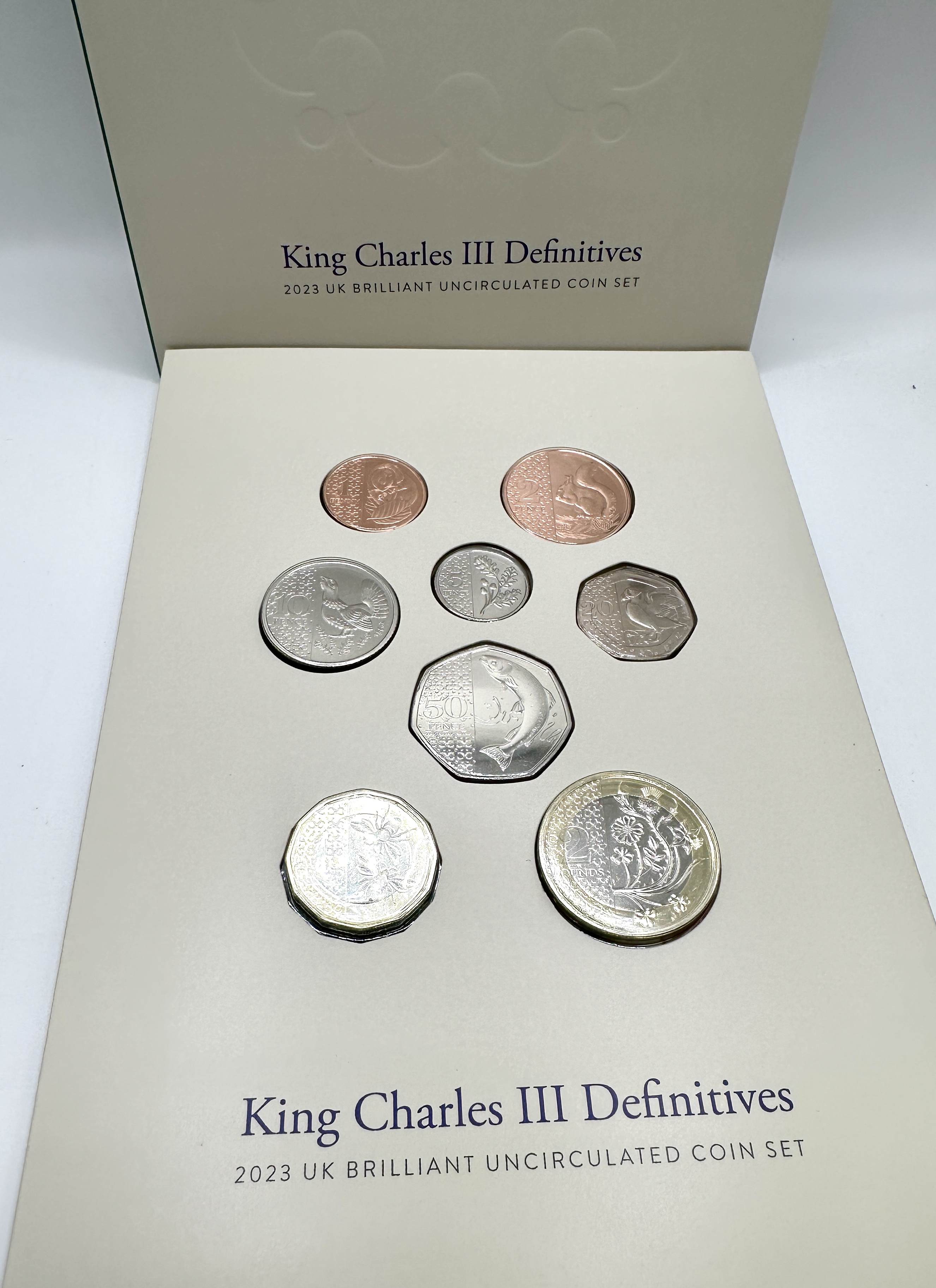 A 2023 King Charles III UK Definitives Brilliant Uncirculated coin set, produced by The Royal Mint. This set comprises eight coins in denominations of £2, £1, 50p, 20p, 10p, 5p, 2p, and 1p. The reverse of each coin features contemporary designs inspired by British flora and fauna, specifically a dormouse on the 1p, a red squirrel on the 2p, oak leaves on the 5p, a capercaillie on the 10p, a puffin on the 20p, an Atlantic salmon on the 50p, bees on the £1, and floral emblems of the four nations on the £2. The coins are presented in the original cream-coloured card folder which bears the official Royal Mint logo and descriptive text. The set represents the first definitive coinage of the reign of King Charles III.