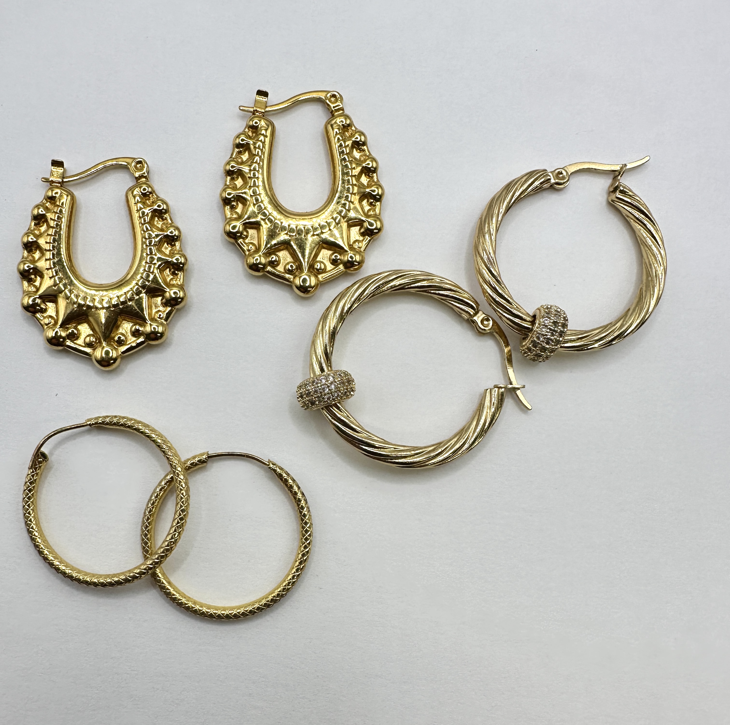 A collection of Monet gold toned hoop earrings in various decorative styles and sizes. The group includes a pair of ornate, U-shaped hoops with intricate architectural detailing and saddleback closures. Also featured is a pair of large twisted-rope style hoops with central sliding beads pavé-set with small clear stones. The collection is completed by a pair of slender round hoops with an all-over engraved lattice pattern and wire-and-clasp closures. All items are constructed from gold toned base metal.