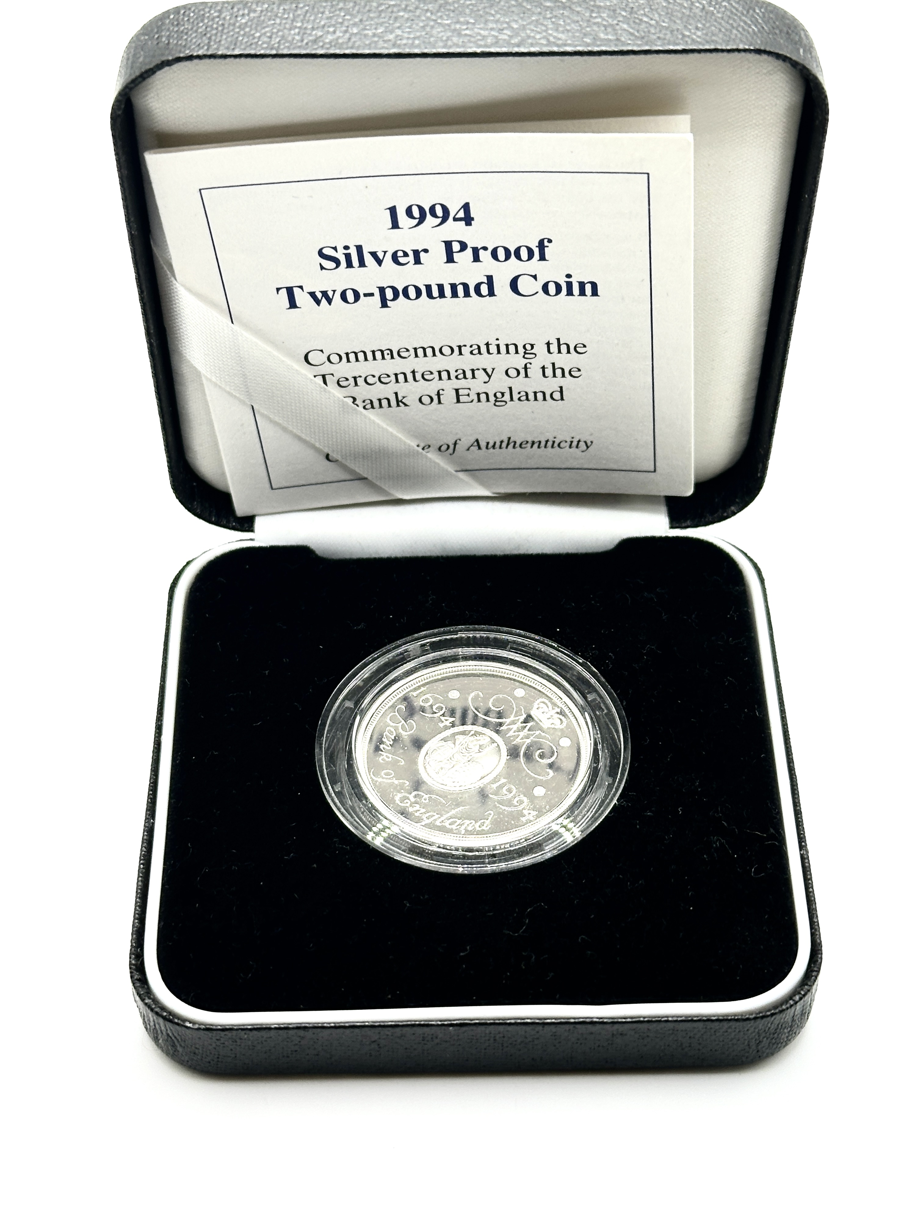 A 1994 United Kingdom silver proof two-pound coin issued to commemorate the tercentenary of the Bank of England. The coin is struck in 925 silver. The reverse design features the seal of the Bank of England, a corporate monogram, and the dual dates 1694 and 1994. The coin is housed in a clear protective plastic capsule and presented in its original Royal Mint black leatherette display case. The lot includes the official Certificate of Authenticity held by a white satin ribbon in the lid.