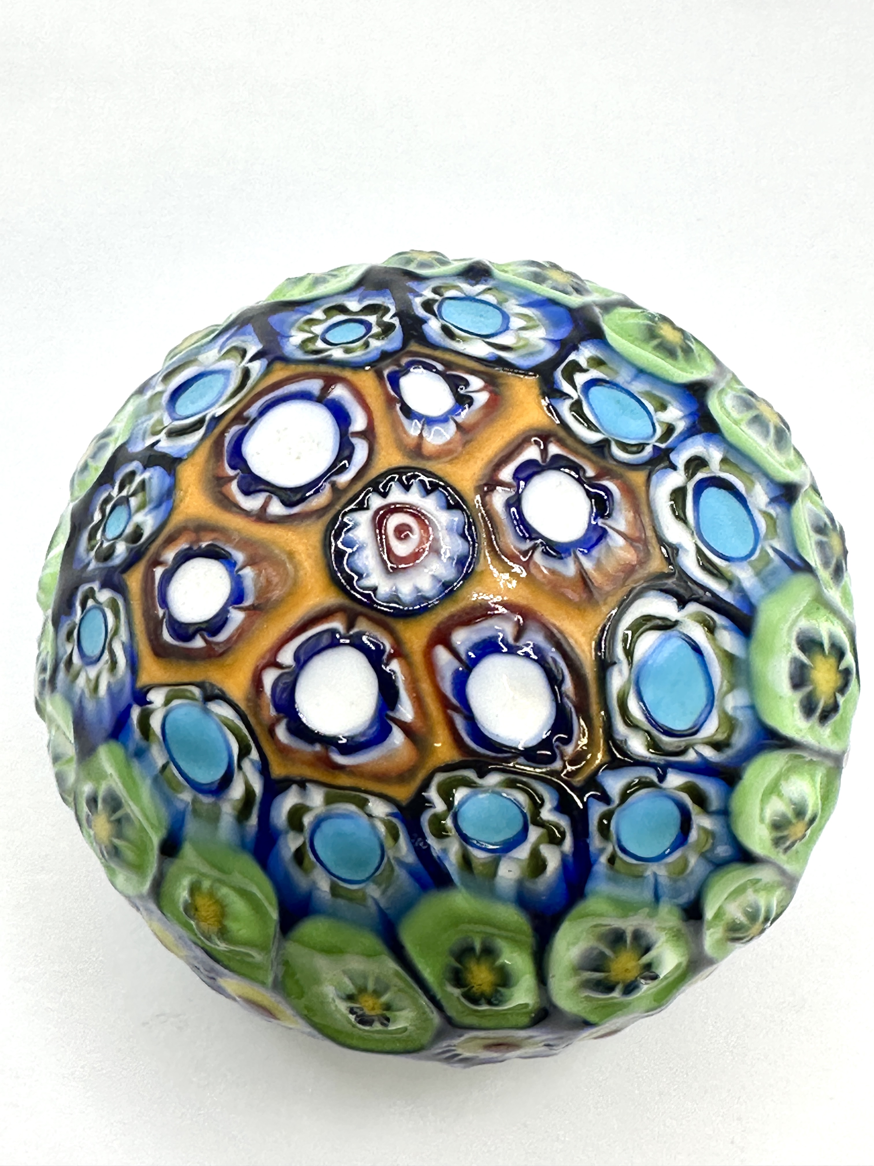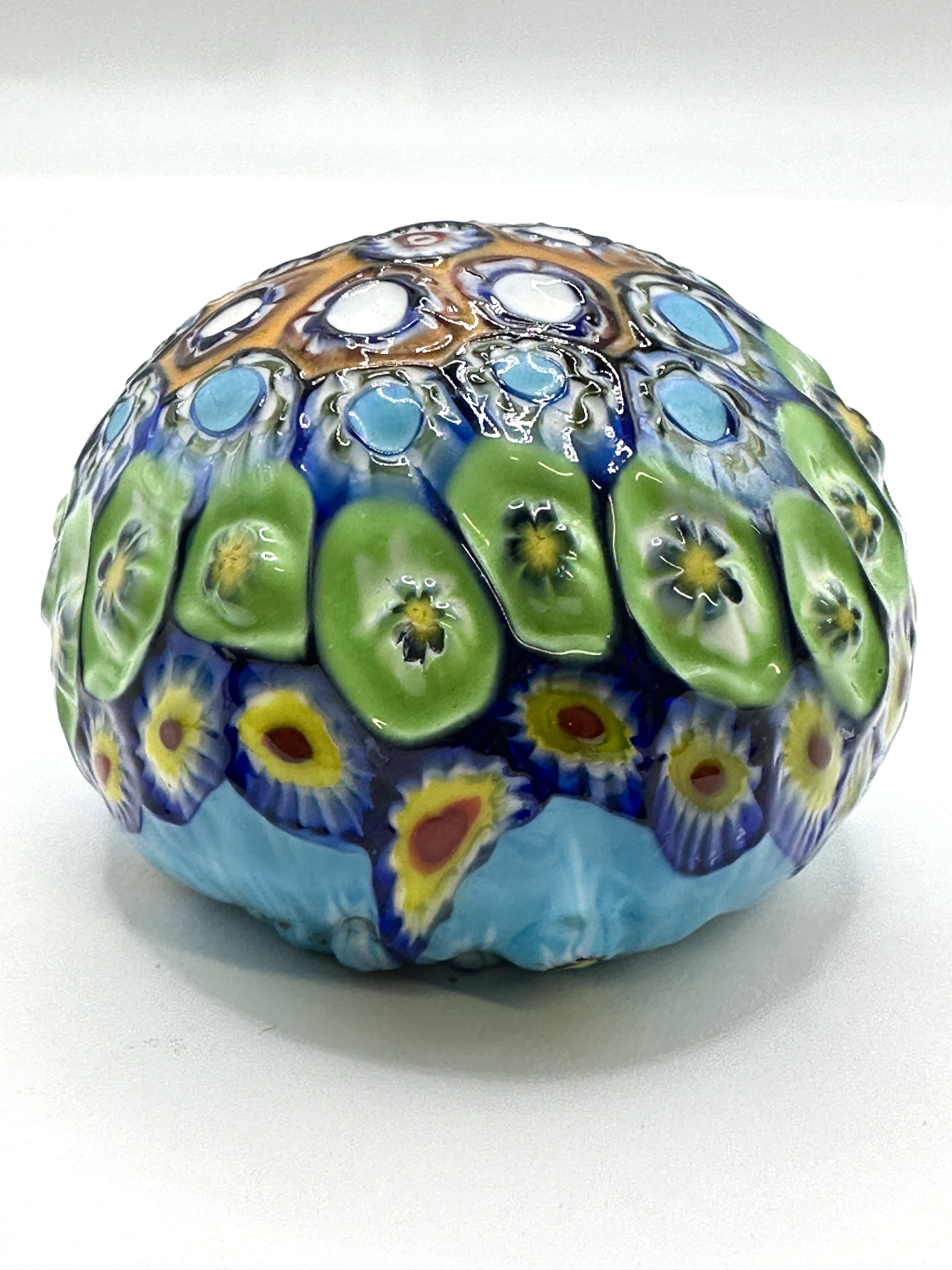 A Murano millefiori art glass paperweight of hemispherical form. The piece is constructed from concentric rings of fused glass canes in a domed arrangement. The decorative canes feature various floral and starburst patterns in a colour palette of white, cobalt blue, ochre, lime green, and red. These elements are set against a light turquoise glass base. The surface exhibits a slightly irregular texture characteristic of the fused-cane manufacturing process and has been finished with a high-gloss polish. No maker marks or signatures are visible.