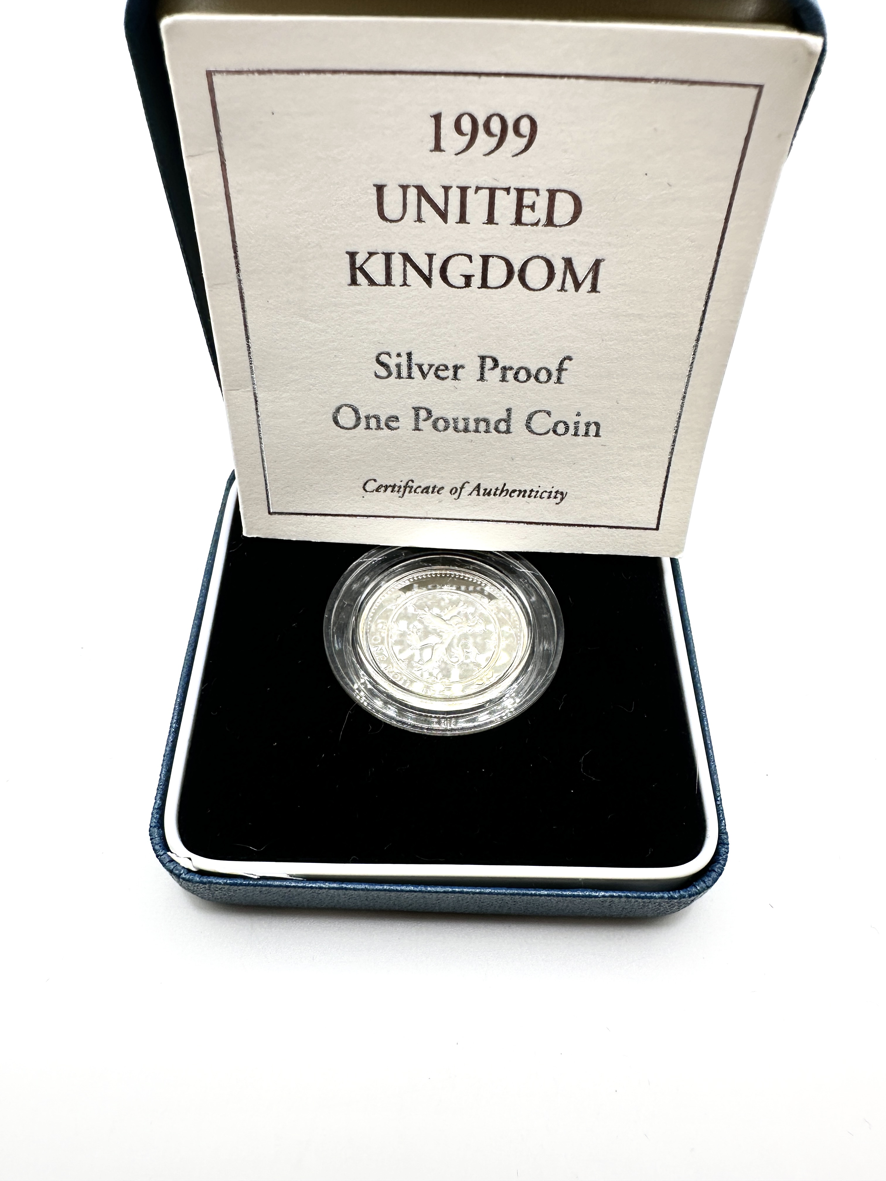 A 1999 United Kingdom silver proof one pound coin struck in 925 silver. The reverse design features the heraldic lion rampant within a double tressure flory counter-flory, representing Scotland, as part of the series of four designs representing the constituent parts of the United Kingdom. The coin is housed in its original clear plastic protective capsule and presented in a blue Royal Mint case with a black velvet-lined interior. The set is accompanied by the original Certificate of Authenticity mounted within the lid of the presentation box.