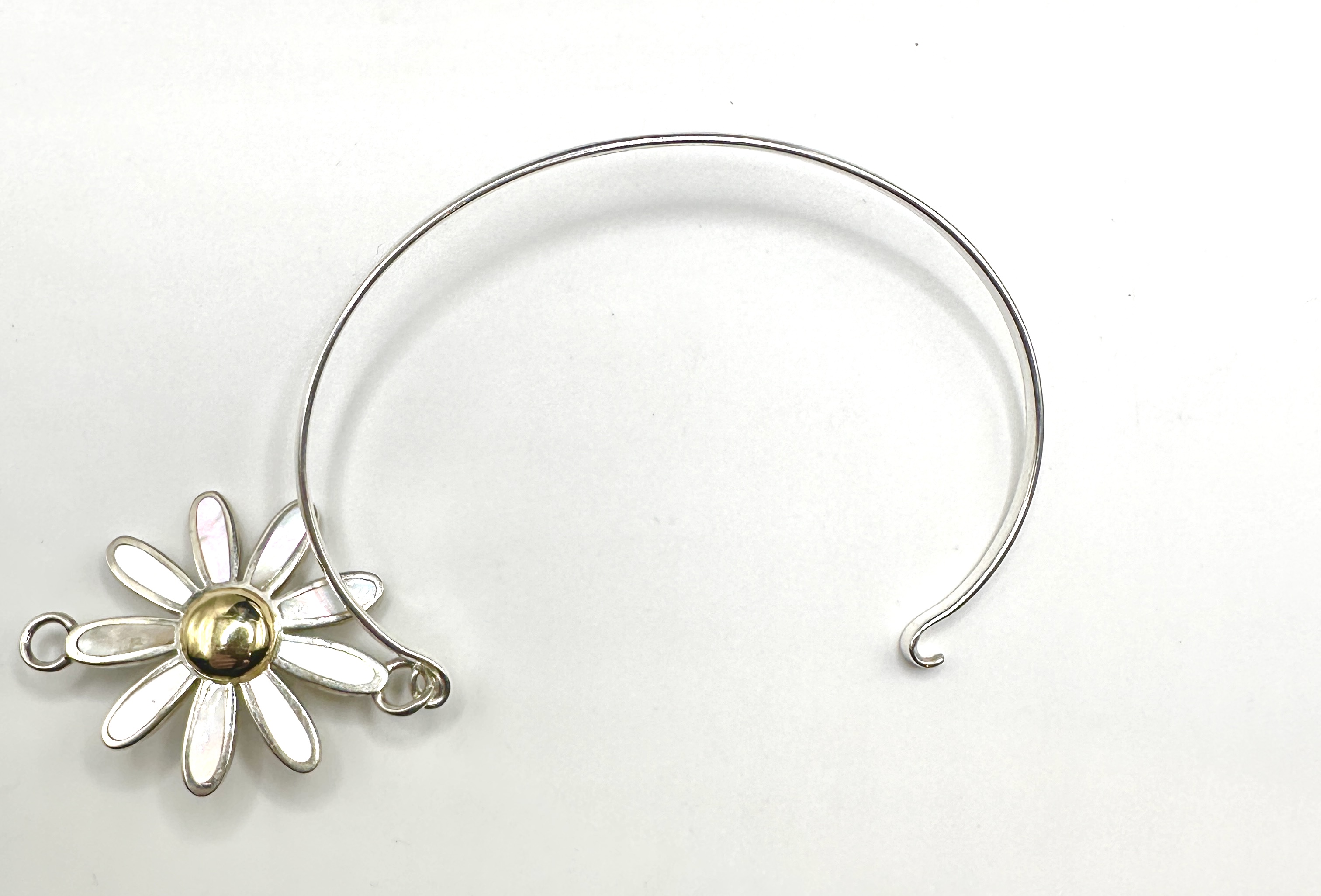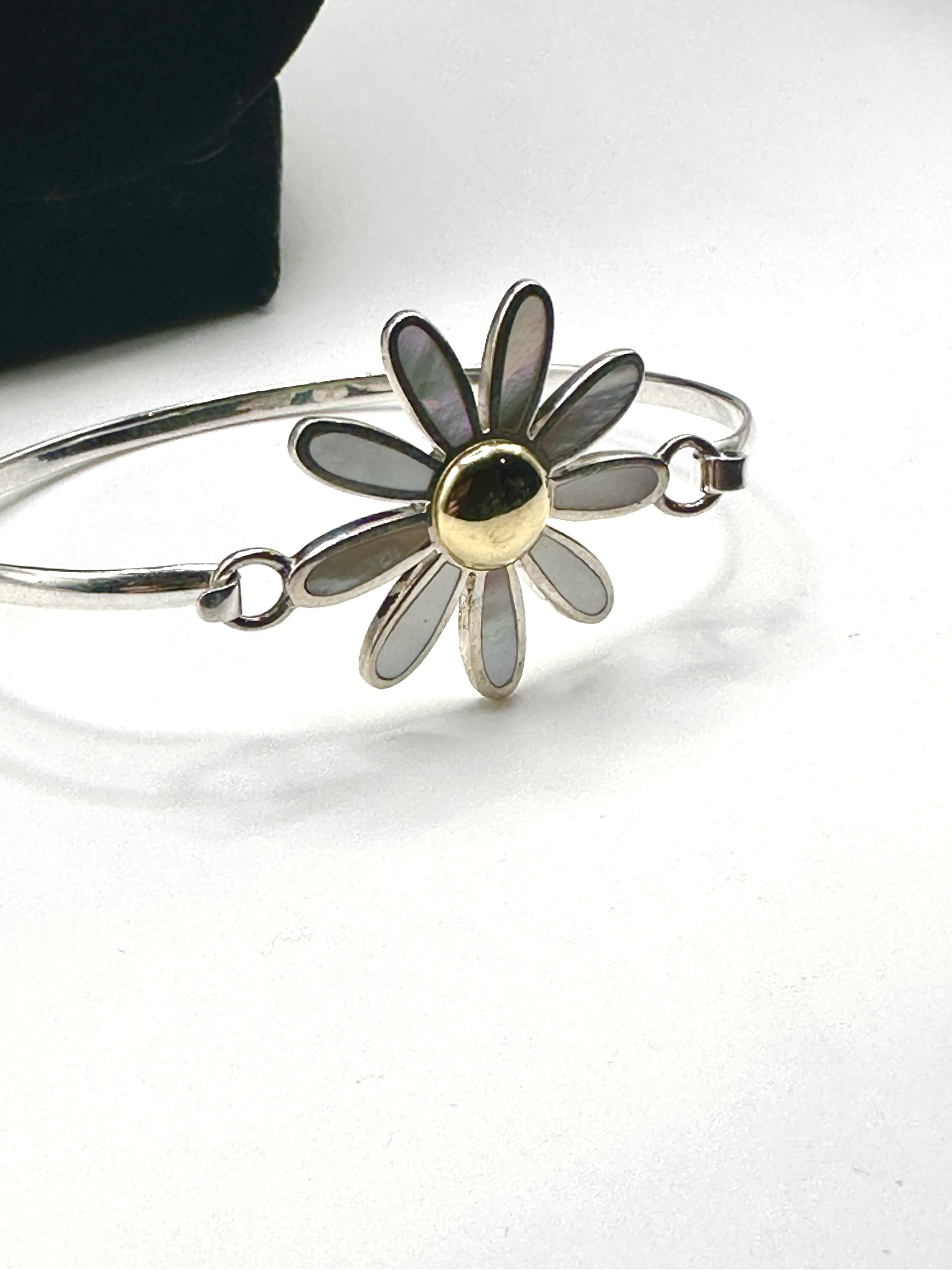 A Kate Spade hinged bangle bracelet featuring a prominent central floral motif, consistent with the Daisy Into the Bloom design. The semi-rigid cuff structure is constructed from 925 silver, confirmed by user facts. The central daisy motif acts as the clasp, composed of petals inlaid with iridescent mother-of-pearl or shell material surrounding a domed gold-toned metal centre. The bracelet fastens via loops integrated into the flower centrepiece. No visible hallmarks or manufacturer stamps are discernible on the accessible surfaces.