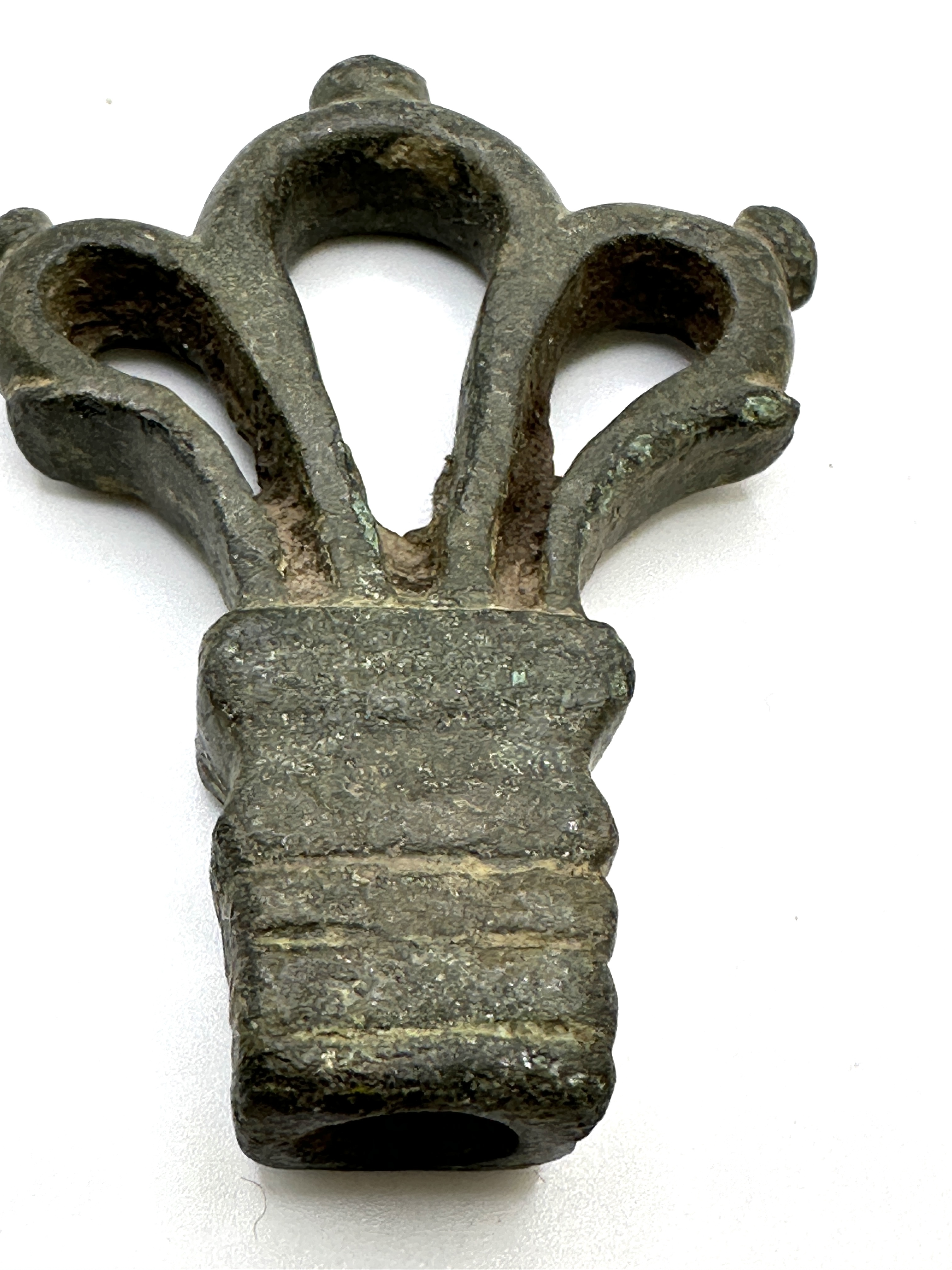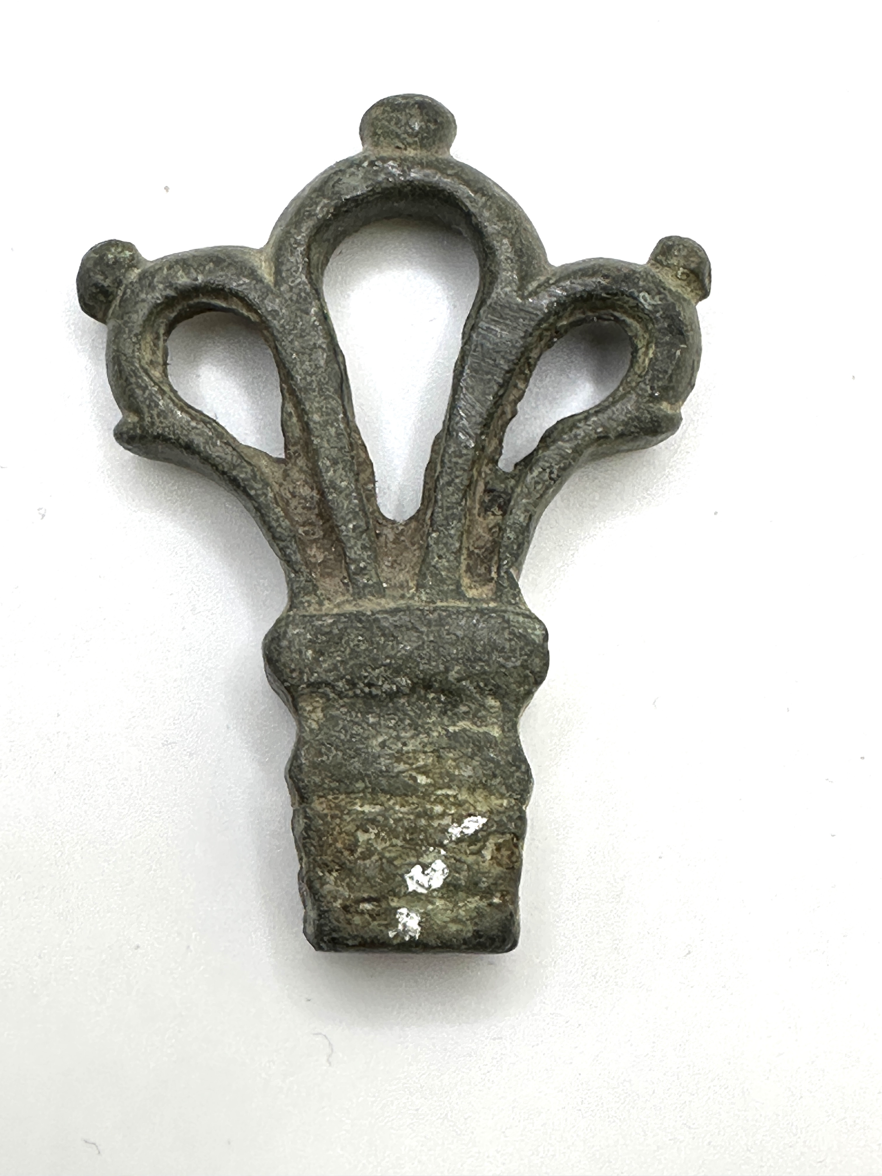 A Roman cast bronze key handle, dating circa 1st-3rd century AD. The piece is constructed from a copper alloy and features a trilobate openwork design. Each of the three lobes is surmounted by a small globular terminal. The lower portion consists of a socketed rectangular base, intended to house an iron key shank, which is now absent. The base is decorated with horizontal moulded bands. The surface exhibits a heavy, dark-green and brown oxidised patina with some white mineral deposits.
