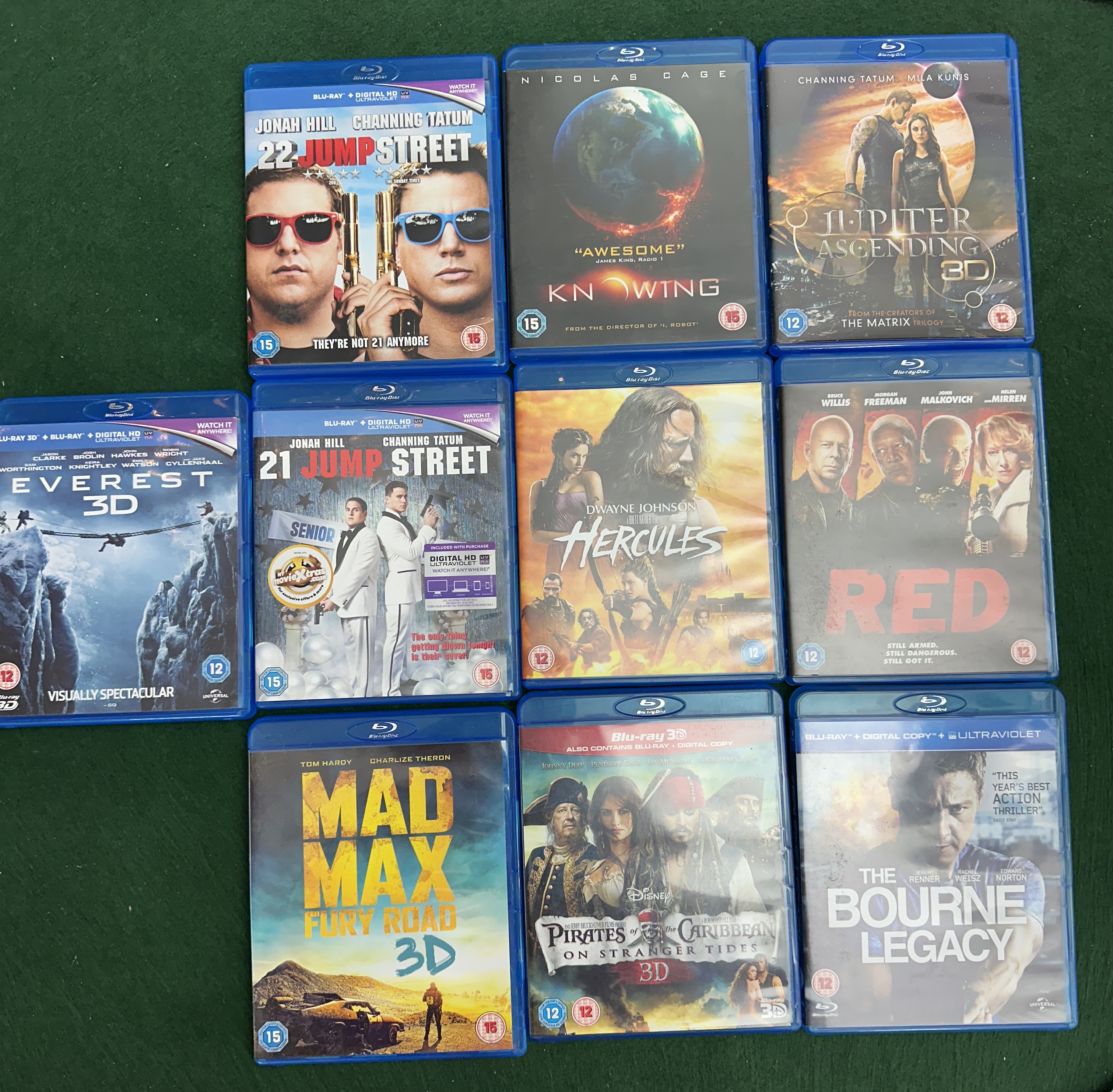 A collection of twenty 10 commercial Blu-ray media discs, housed in their original blue plastic cases with paper/cardboard sleeves. The films are predominantly from the action, adventure, and science fiction genres, released in the 21st century. Specific titles visible across the collection include 22 Jump Street, Knowing, Mad Max: Fury Road 3D, Mission Impossible: Ghost Protocol, and Hercules (starring Dwayne Johnson and Ian McShane, as confirmed by web research). The collection features prominent actors such as Tom Cruise, Nicolas Cage, Channing Tatum, Dwayne Johnson, Bruce Willis, and Sylvester Stallone. Many cases indicate compatibility formats such as 3D, Digital HD, and Ultraviolet. All visible cases display European/UK film age classification ratings, predominantly 12, 15, or 18.