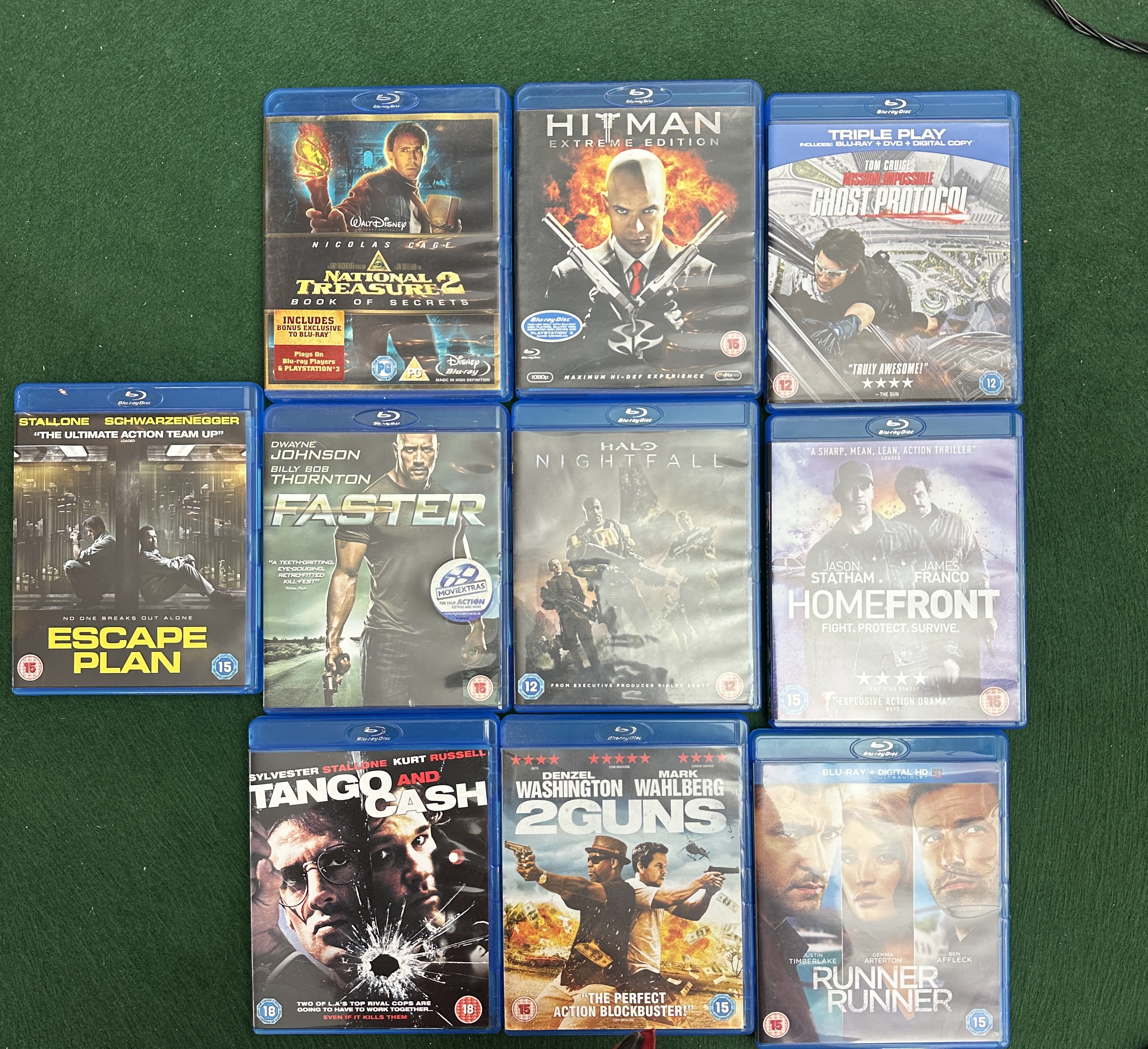 A collection of 10 modern action and thriller films presented in the Blu-ray format. Each film is housed in a standard blue plastic clamshell case featuring the original colour artwork inserts. The collection includes prominent titles such as Tango & Cash (Sylvester Stallone, Kurt Russell), Mission: Impossible – Ghost Protocol (Triple Play), National Treasure 2: Book of Secrets (Nicolas Cage), Hitman: Extreme Edition, Escape Plan (Stallone, Schwarzenegger), Faster, Halo: Nightfall, Homefront (Jason Statham), 2 Guns (Denzel Washington, Mark Wahlberg), and Runner Runner (Blu-ray + Digital HD UV). The films carry various UK/European age restriction symbols, including ratings 12, 15, and 18.