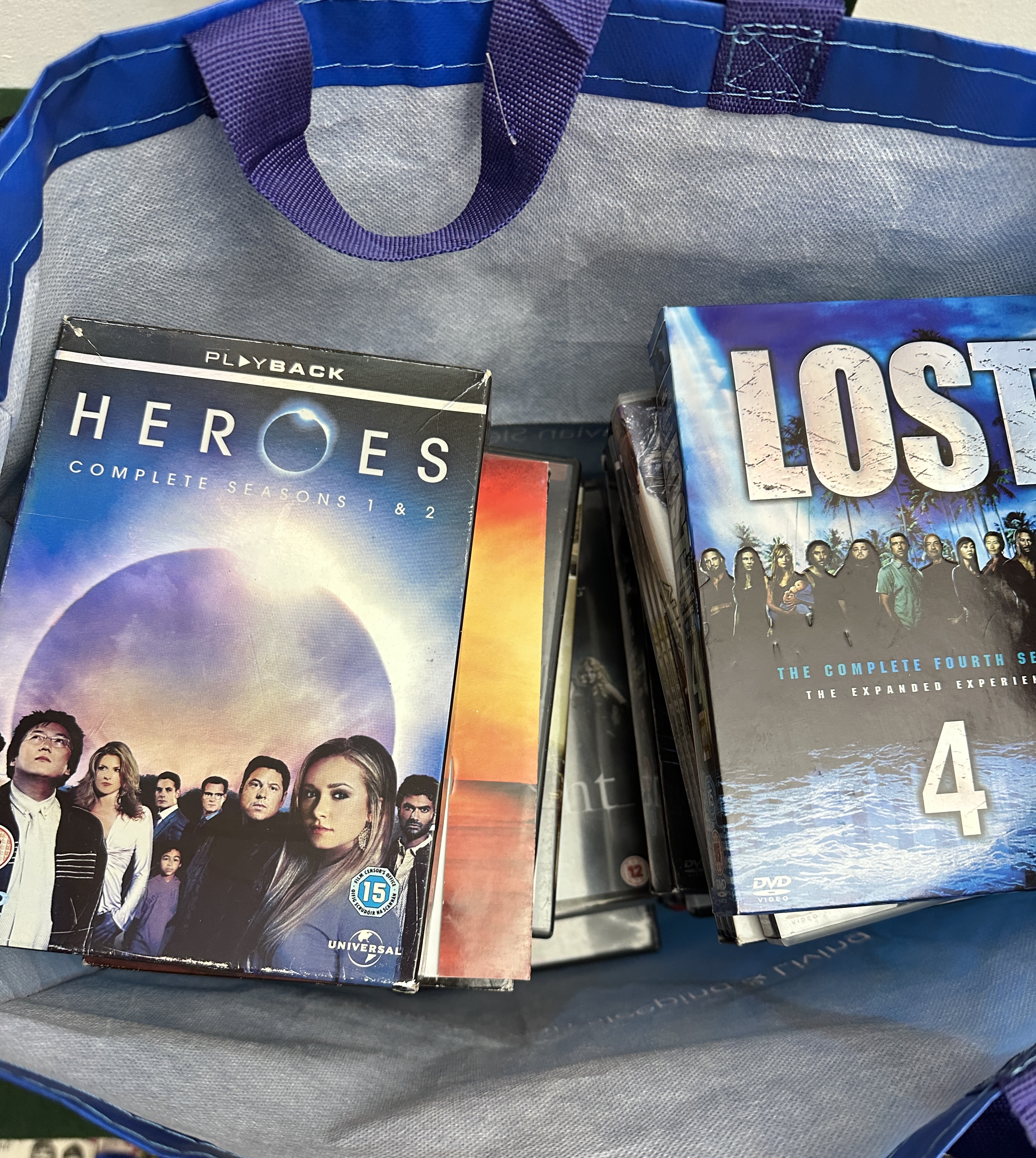 A collection of assorted used home video media, primarily consisting of multi-disc DVD box sets and standard DVD cases. The collection is contained within a blue woven polypropylene reusable shopping bag marked ‘JYSK Scandinavian Sleeping & Living’. Identifiable titles include the box sets HEROES Complete Seasons 1 & 2, LOST The Complete Fourth Season, and The Ultimate Alien & Predator Collection (7 films), along with a standard case for Wrath of the Dragon Gods. The media features various British Board of Film Classification (BBFC) age ratings, including ’15’ and ’18’. Packaging materials are predominantly plastic and cardboard/paper.