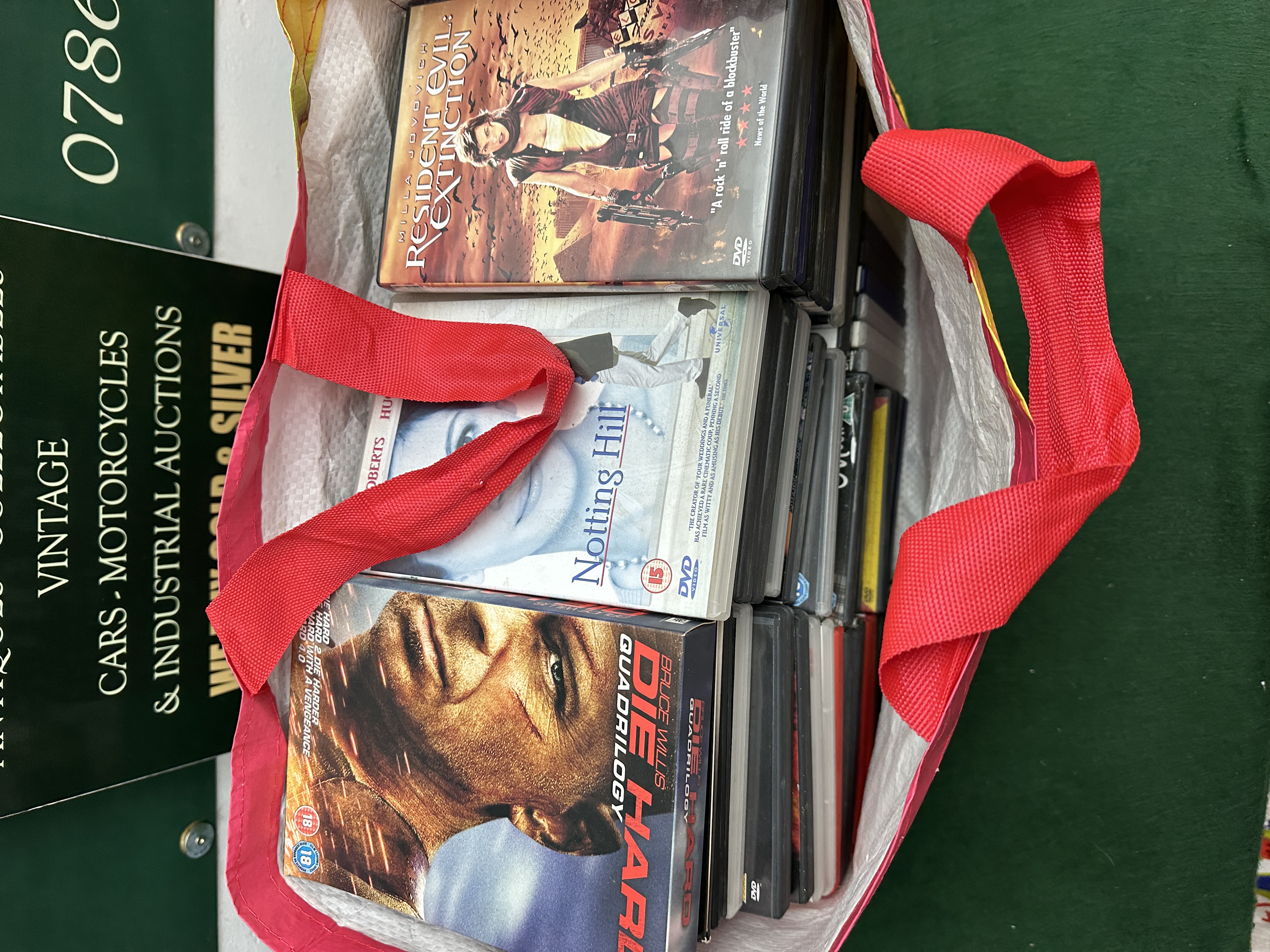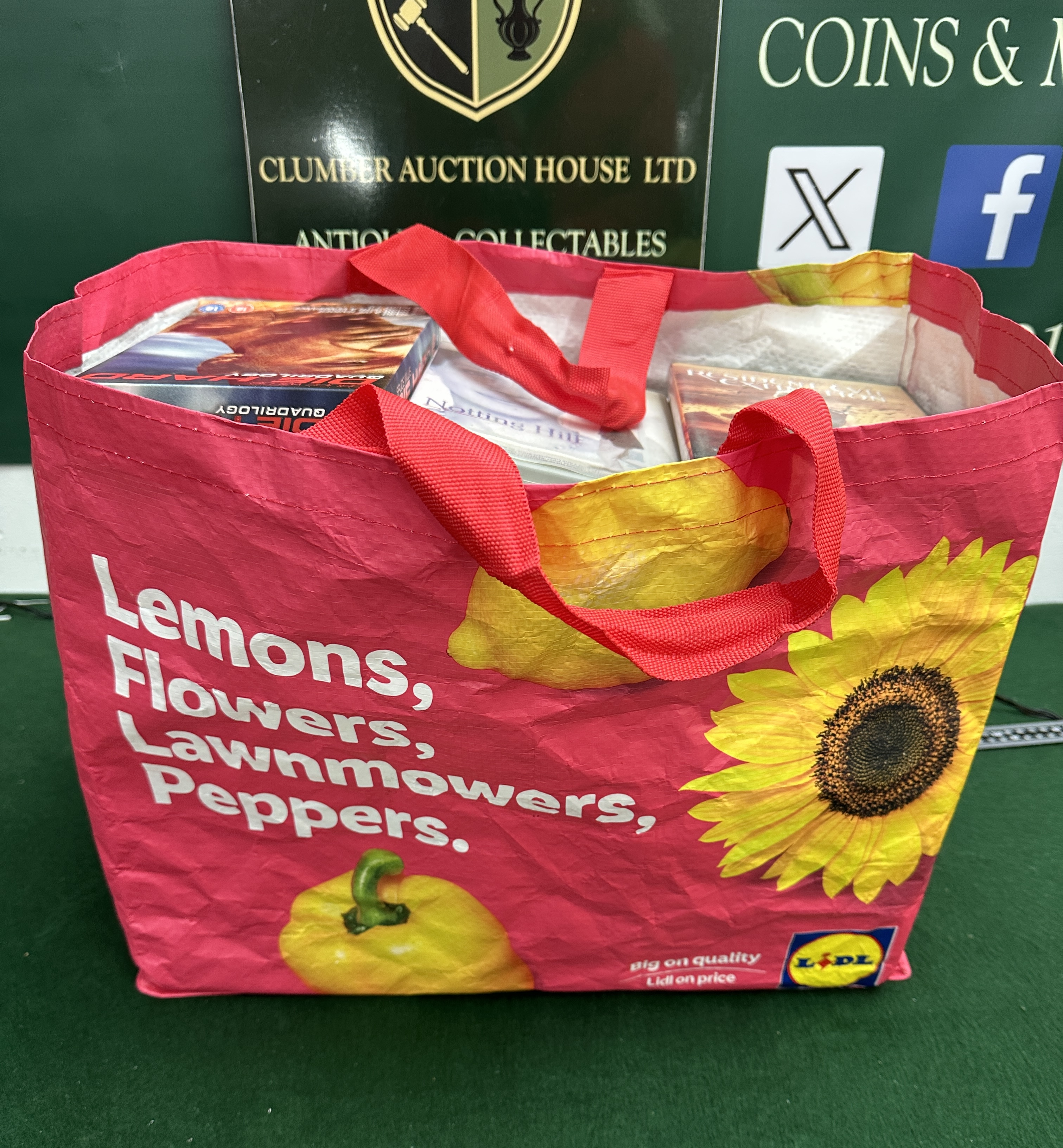A collection of approximately twenty-nine home video media cases, primarily standard plastic DVD cases and box sets, containing modern commercial film titles. The collection is presented within a reusable woven polypropylene shopping bag. Visible titles include the action films Resident Evil: Extinction and Die Hard: Quadrilogy, alongside the romantic comedy Notting Hill, starring Julia Roberts and Hugh Grant. The container is a pink and red Lidl grocery bag printed with produce imagery and the text, “Lemons, Flowers, Lawnmowers, Peppers.” The media cases are stacked tightly within the bag.