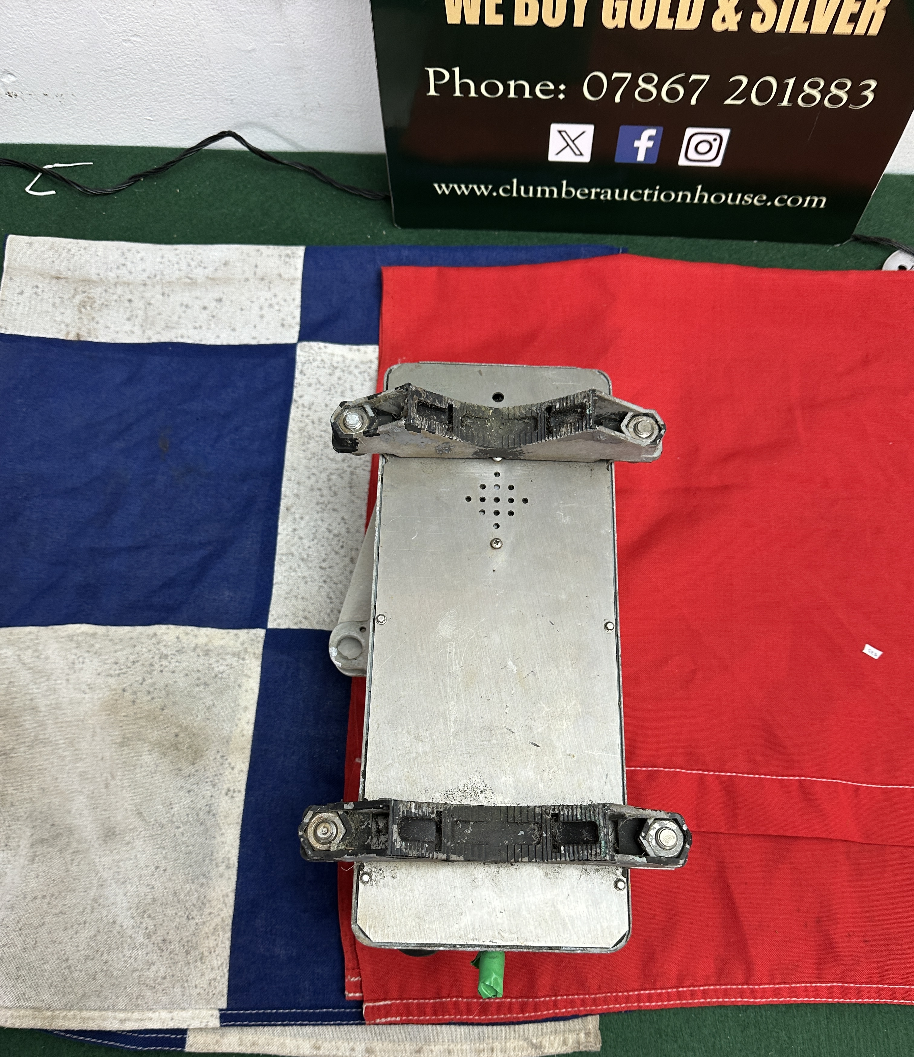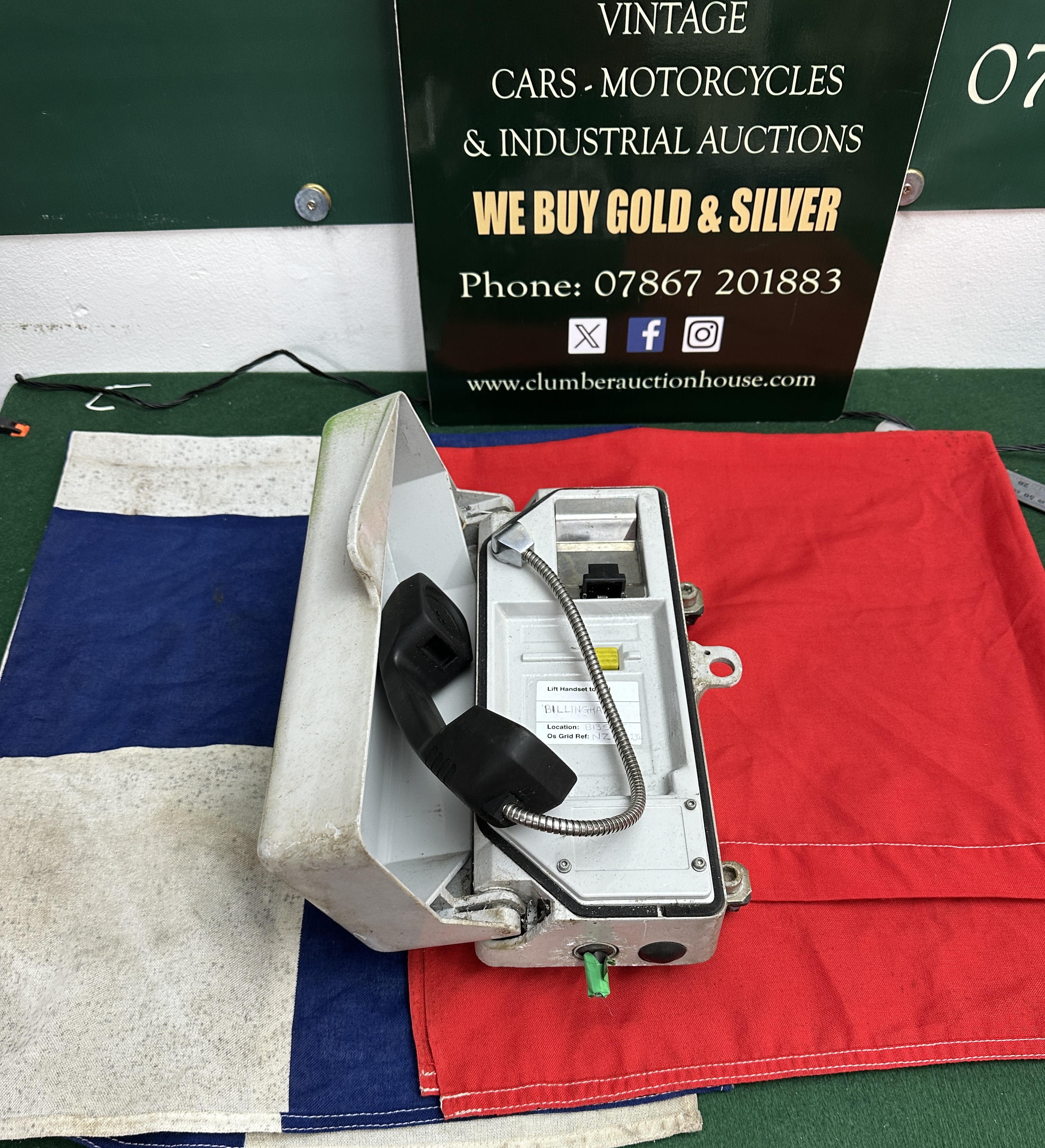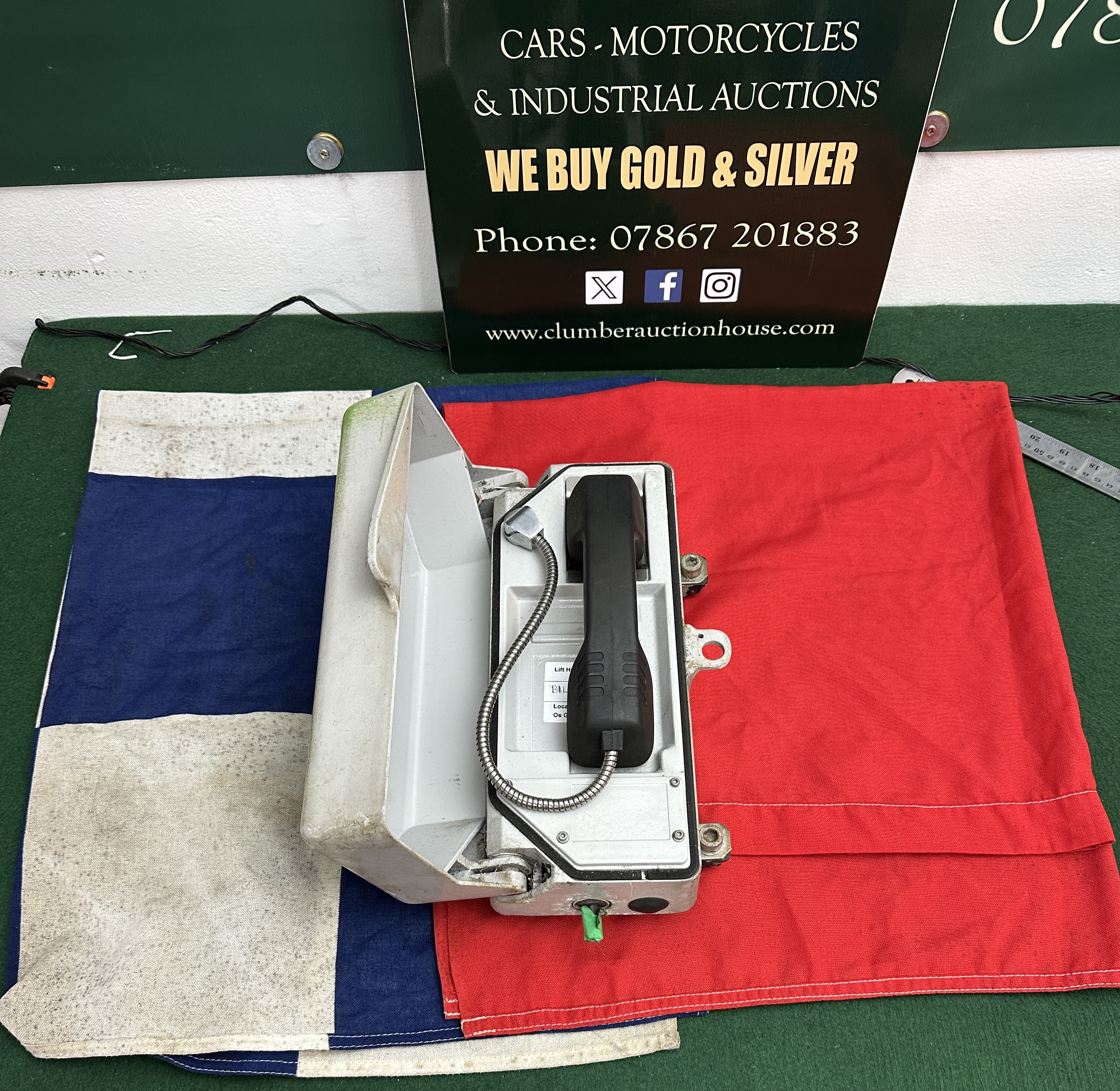 A collection of three items centred around a rugged industrial or emergency telephone unit, identified through web intelligence as being associated with DAC Limited, a known supplier for infrastructure such as Network Rail. The unit features a heavy-duty, light grey/white cast metal or composite housing with a hinged lid, designed for wall mounting. The interior houses the components and a black plastic handset connected by a coiled metal cable. Visible internal labels bear fragmented text including TFL, Lift Handset, and Location ID Ref., indicating use within a public utility or transport environment. The unit is presented resting upon two large textile pieces: one solid red fabric banner and one large flag composed of blue and white checkered quadrants, resembling an international maritime signal flag. The telephone unit includes mounting brackets visible on the back panel.