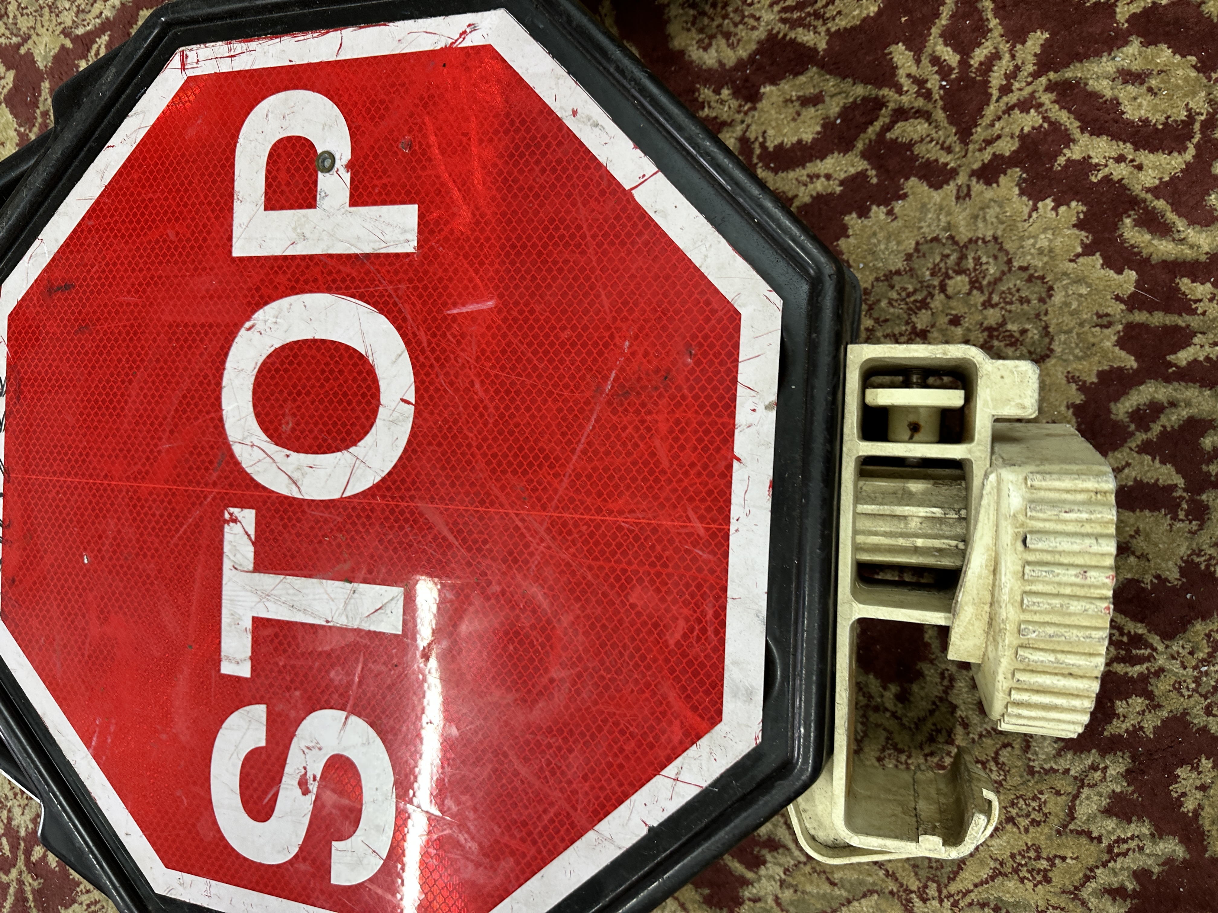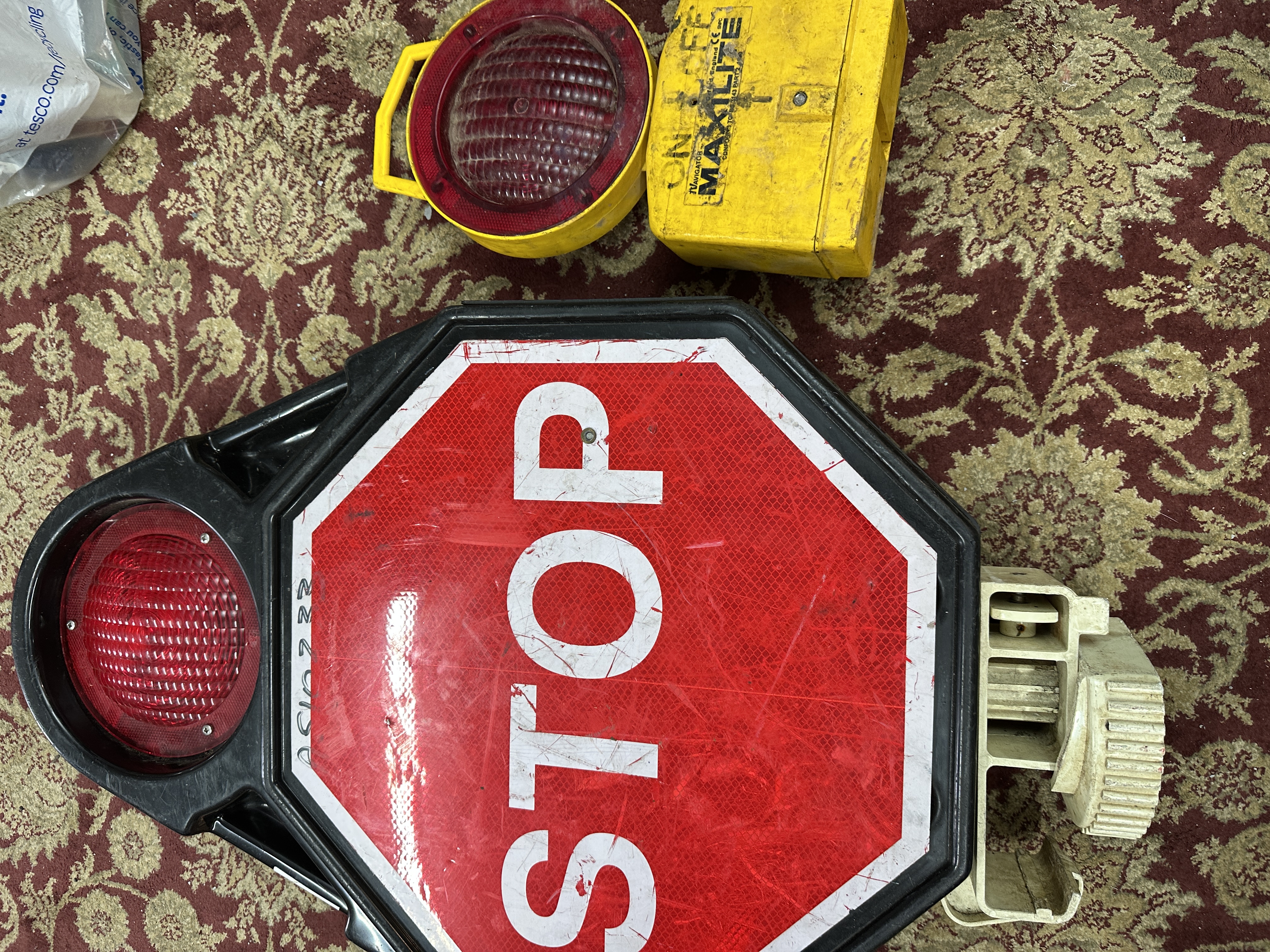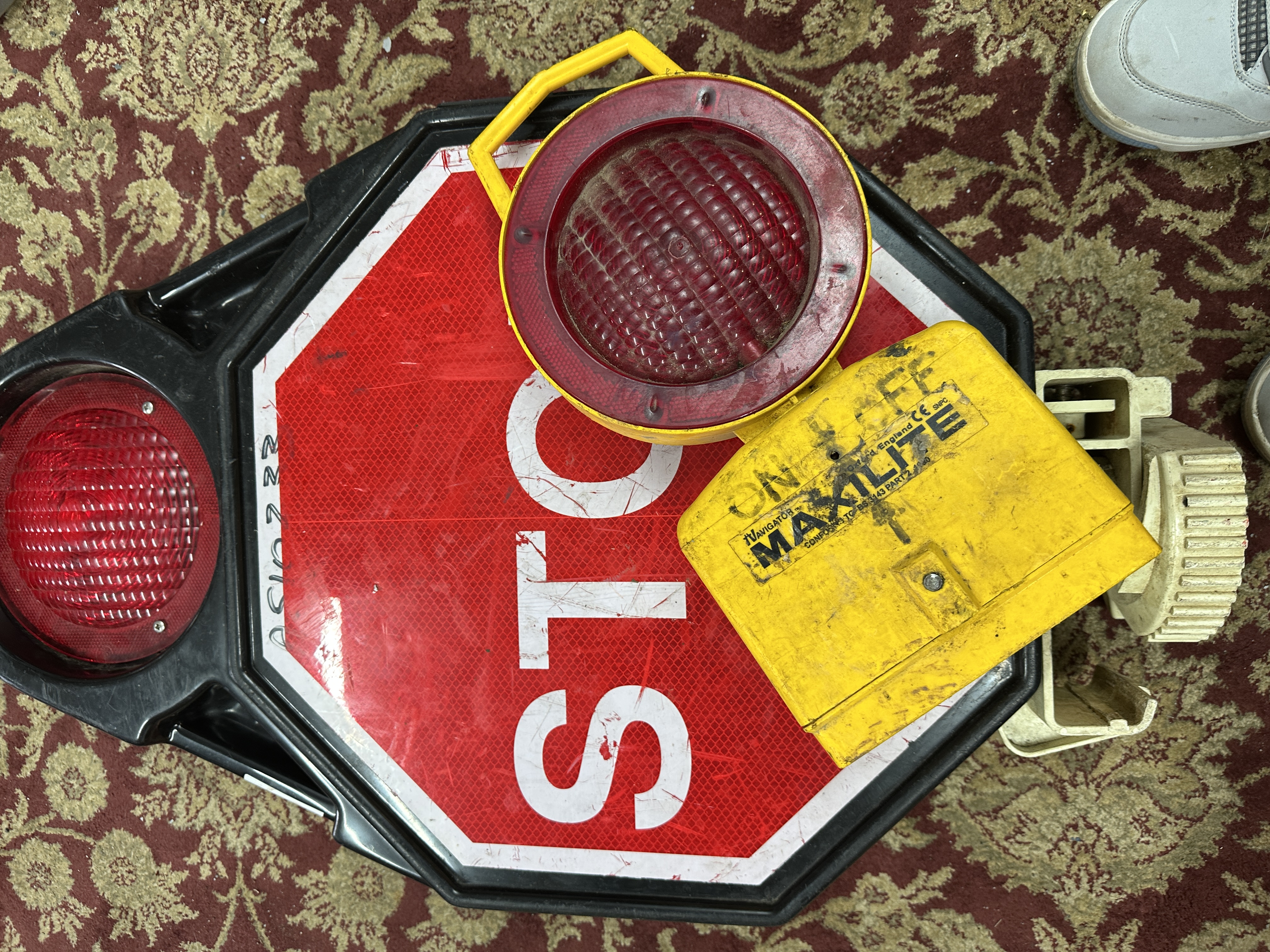 A collection of four utilitarian plastic safety and traffic control components, identified through research as elements of a school bus powered stop arm system or general construction safety equipment. The primary item is a large octagonal traffic control sign assembly featuring reflective red sheeting with white ‘STOP’ text, mounted in a black plastic frame. An integrated red lens warning light is present on the left side. The sign face bears a handwritten inscription, “AS67222”. The collection also includes three accessory components: a circular red lens warning light housed in a yellow plastic casing with a handle; a rectangular yellow plastic housing marked “ON SAFE MAXILITE”; and a detached beige/off-white ribbed plastic component, likely a mounting bracket or battery case. All components are constructed primarily of plastic.