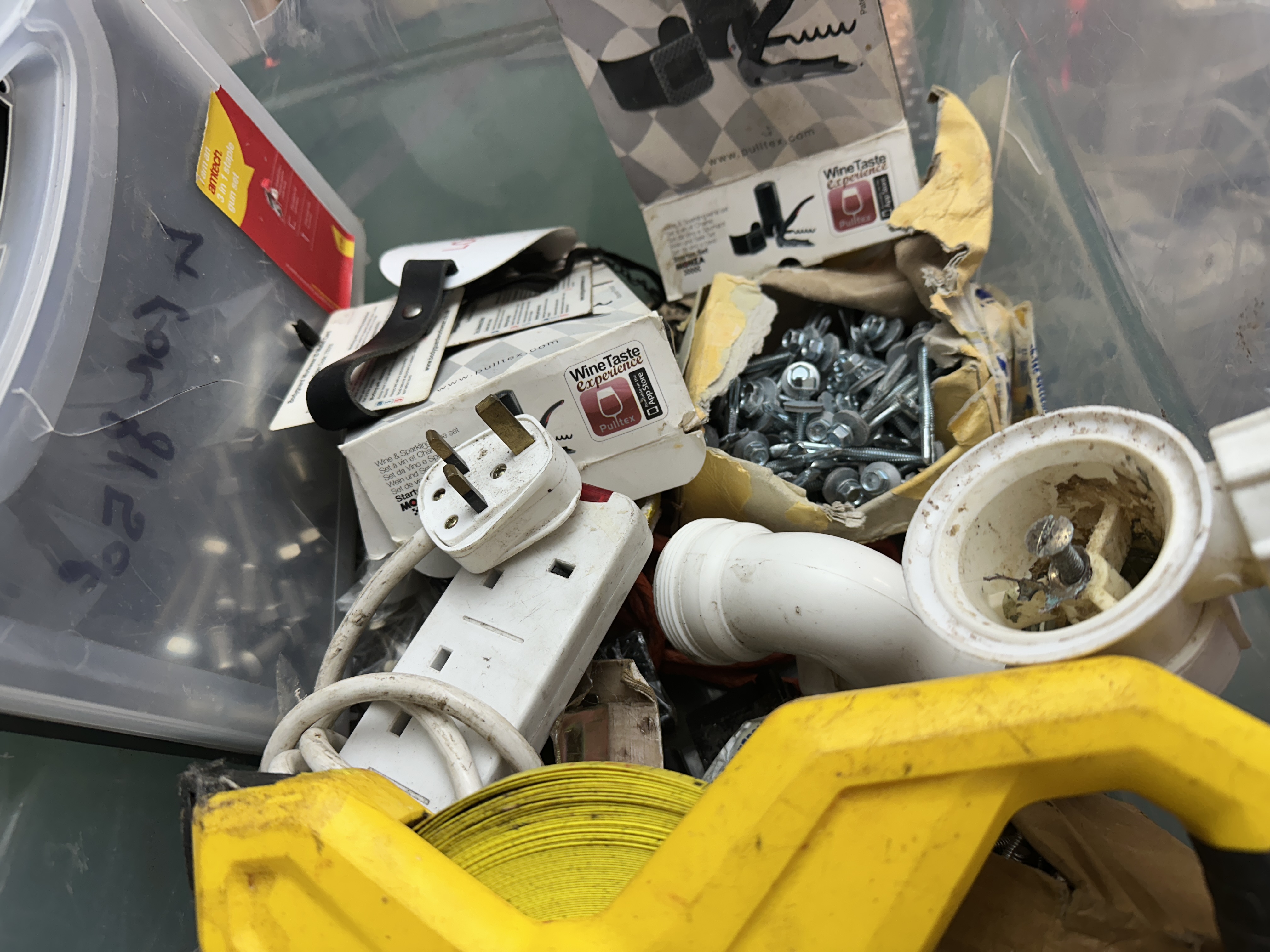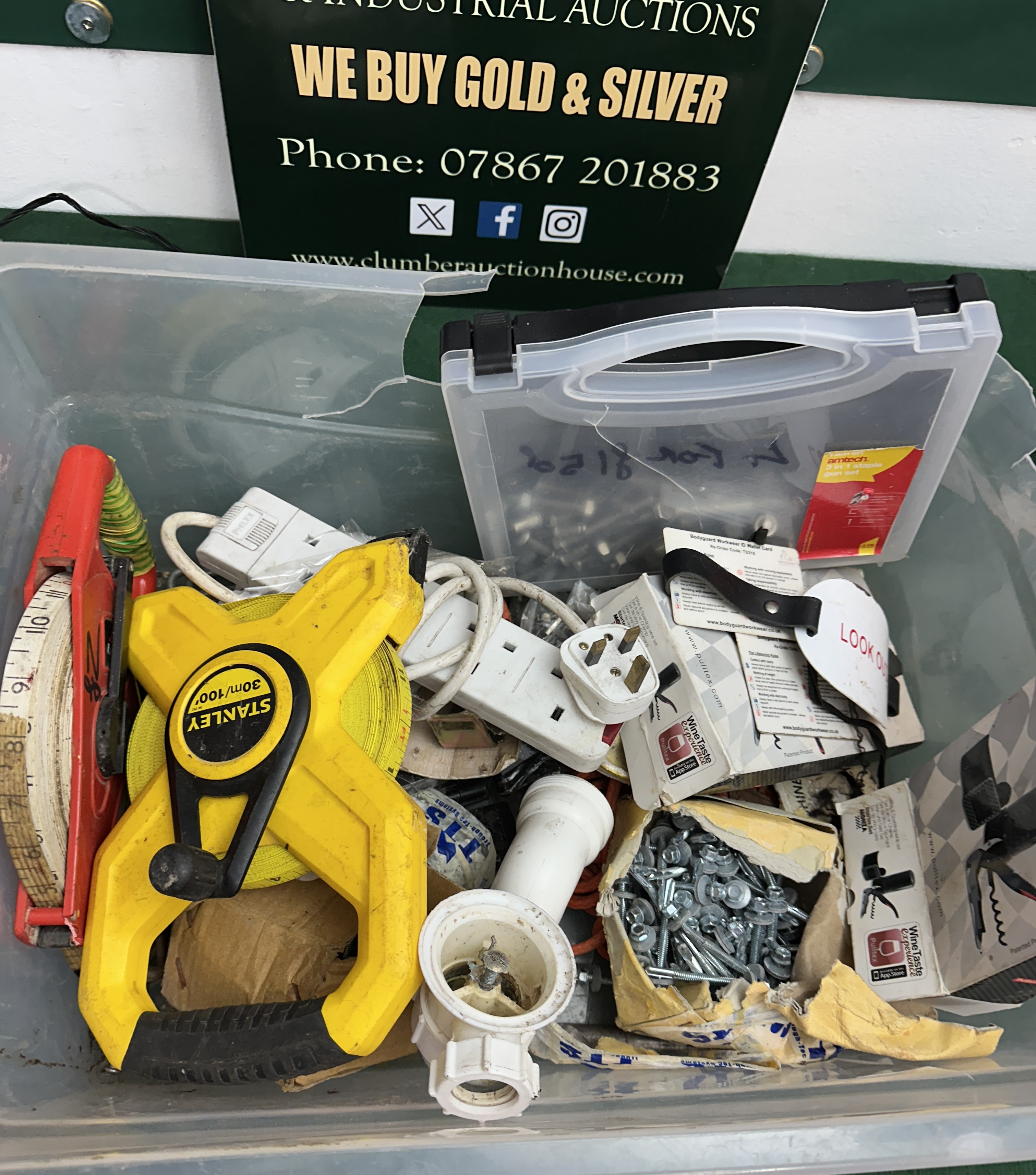 The lot comprises a collection of miscellaneous modern hardware, tools, and electrical components stored within a large clear plastic storage bin. The collection includes a prominent yellow STANLEY Open Reel Fibreglass Long Tape Measure, marked 30M/100ft, consistent with types identified in the web context. Also present is a smaller red and white fabric surveying tape measure (closed reel type). The bin contains various white plastic UK-style electrical plugs, adapters, and extension leads, along with several white plastic PVC pipe fittings. A significant quantity of loose silver-tone metal hardware, including screws, nuts, bolts, and washers, is present, some spilling from torn cardboard packaging. A separate smaller, clear plastic organiser box containing additional small hardware is also visible within the bin, alongside various small boxes and packaging.