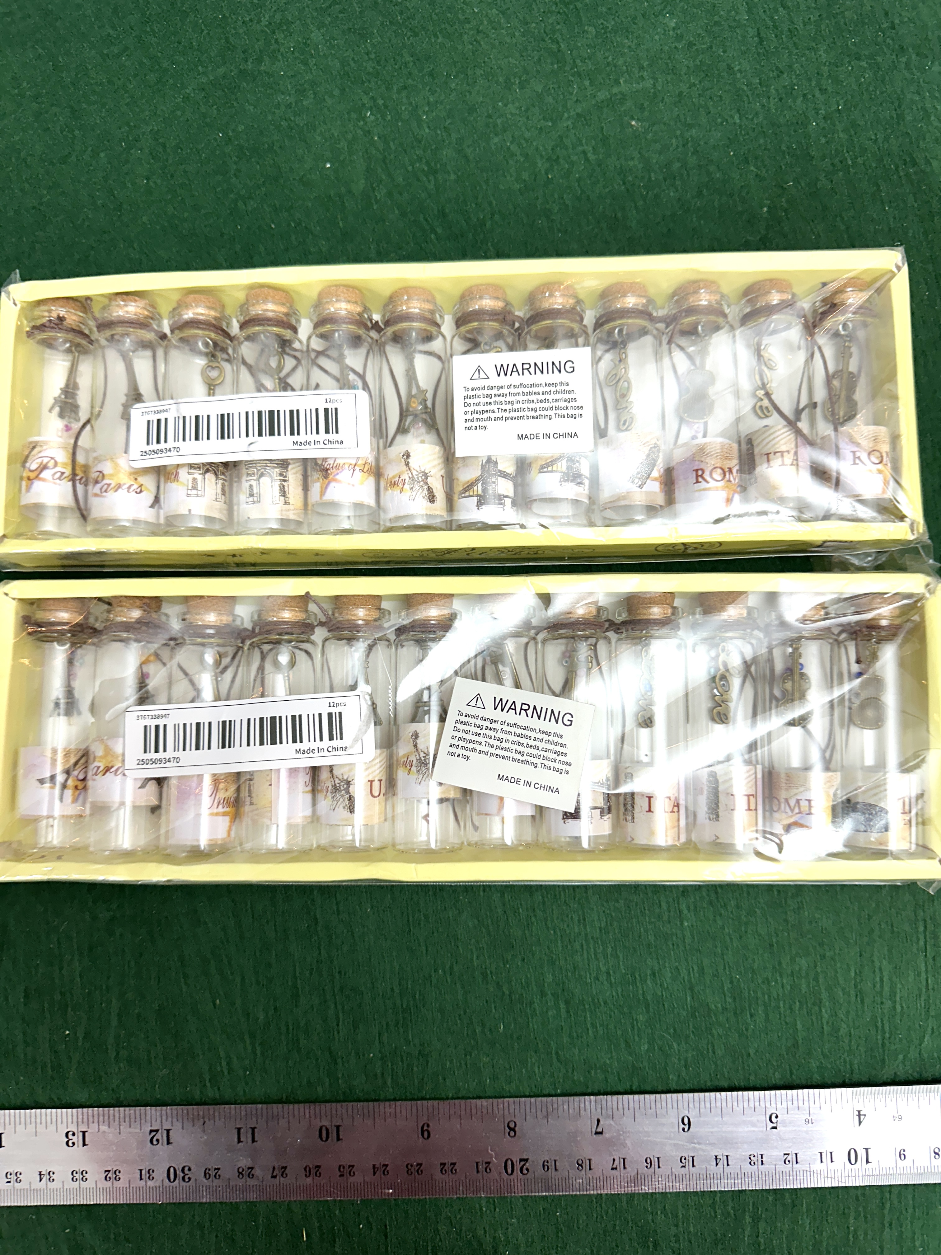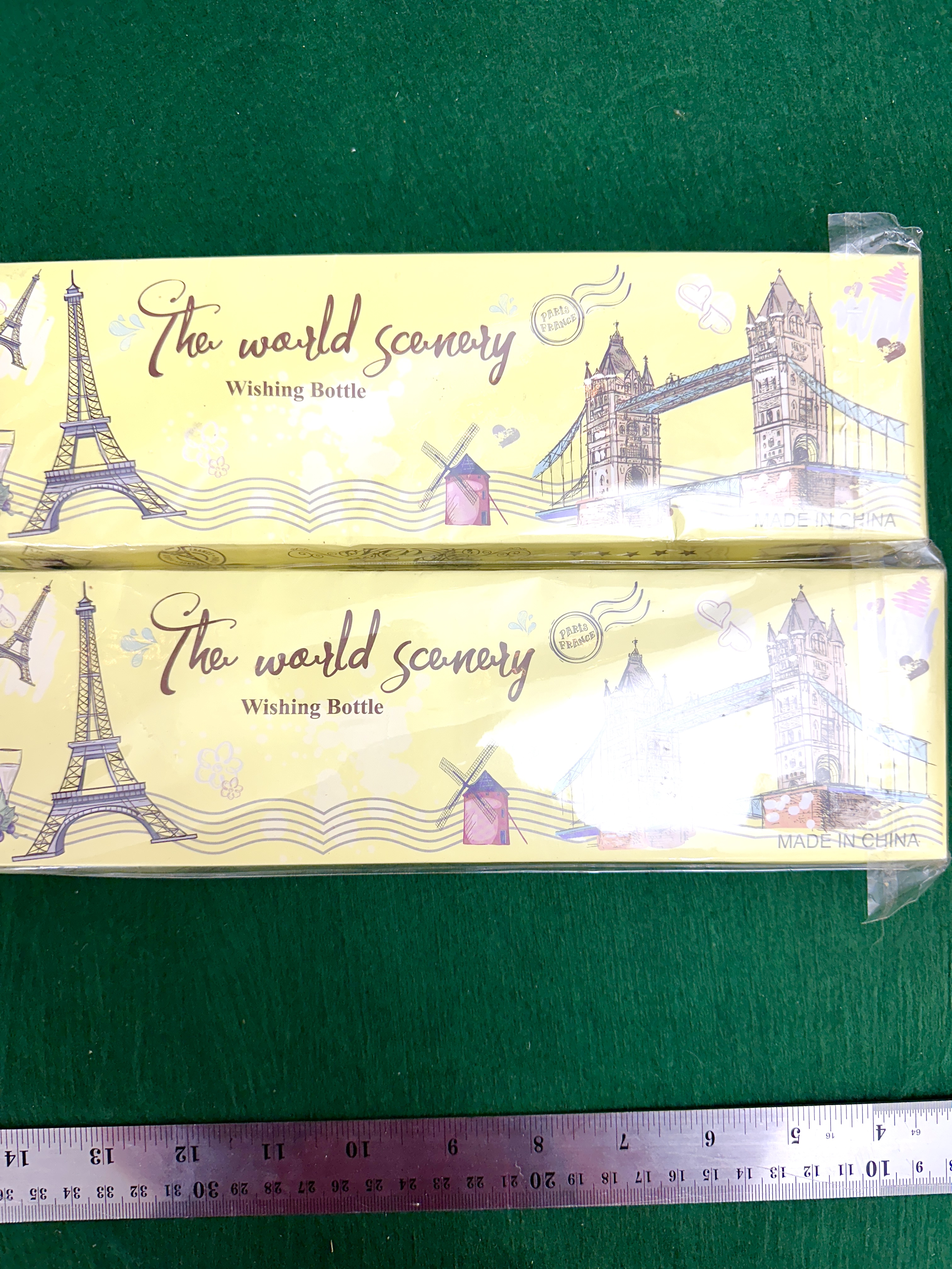 A collection of 24 contemporary novelty items, presented as two identical, factory-packaged sets of miniature ‘Wishing Bottles’. Each set is contained within a rectangular yellow cardboard box labelled “The world scenery Wishing Bottle,” featuring graphic sketches of international landmarks including the Eiffel Tower and Tower Bridge. Each box contains 12 individual clear glass vials, sealed with cork stoppers. Each vial contains a miniature paper scroll printed with travel-themed locations such as ‘Paris’ and ‘Rome’, and features a small attached metal charm. The internal packaging includes product barcodes and a suffocation warning label printed in English. The items are marked “MADE IN CHINA.”