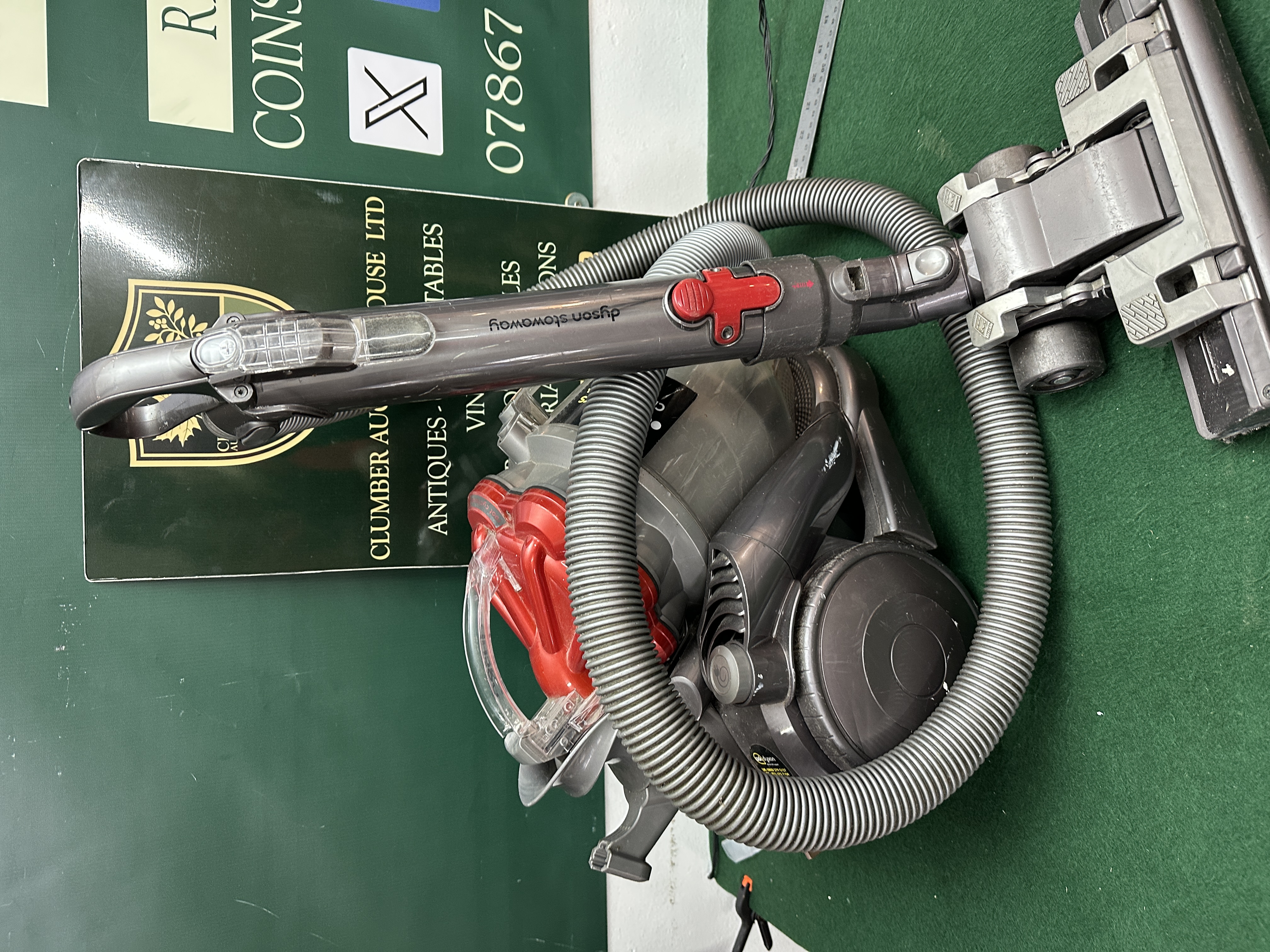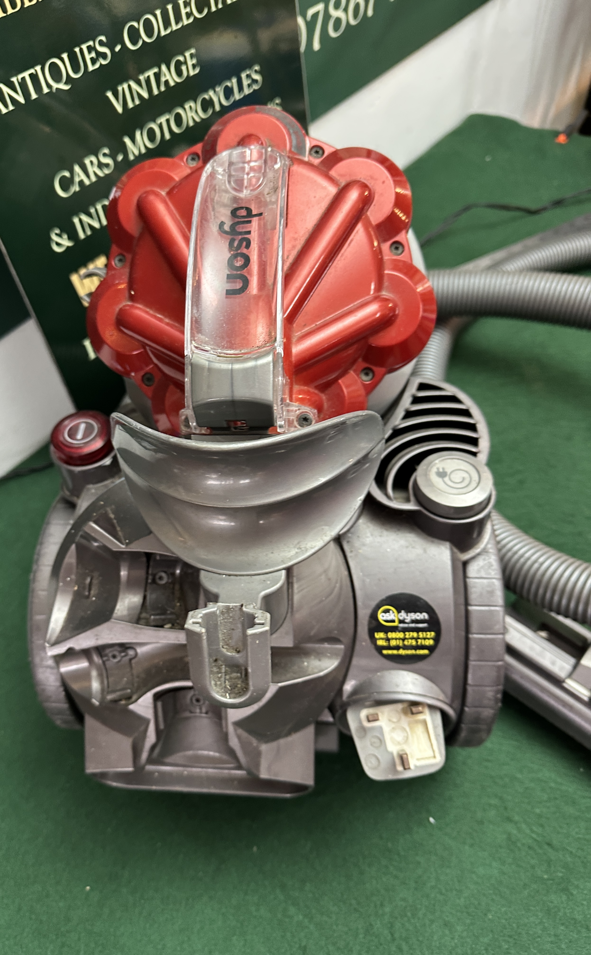 A single Dyson Big Ball Multi Floor Canister Vacuum Cleaner. The unit is constructed predominantly from molded grey and red plastic, featuring the characteristic ‘Big Ball’ design for stability and manoeuvrability. It includes a flexible grey hose, an extension wand marked ‘dyson slimway’, and a dust collection container with a prominent red top section. Branding ‘dyson’ is visible on the clear plastic release latch and on the yellow information sticker affixed to the main body. The unit is fitted with a UK-standard 3-pin plug.