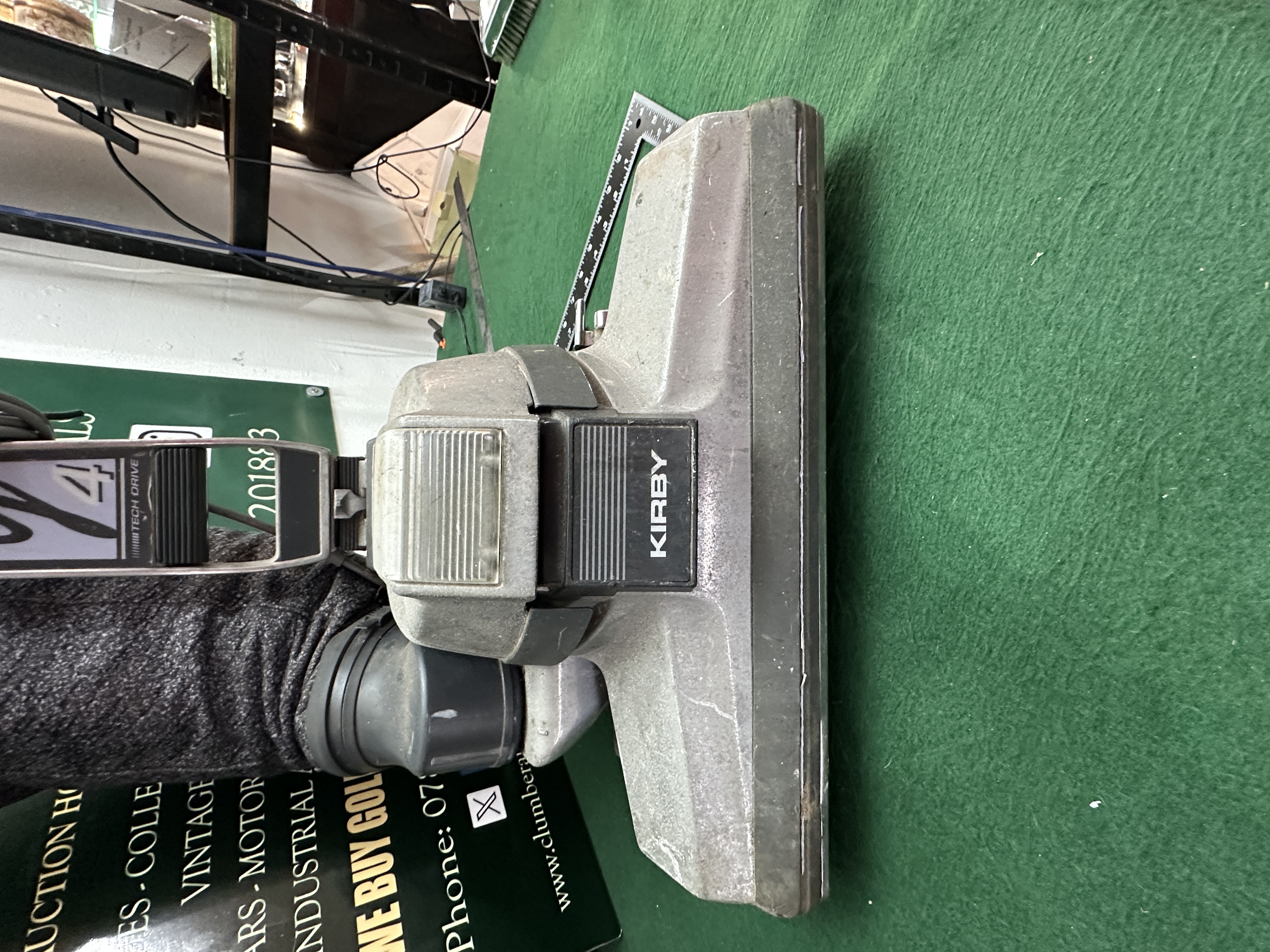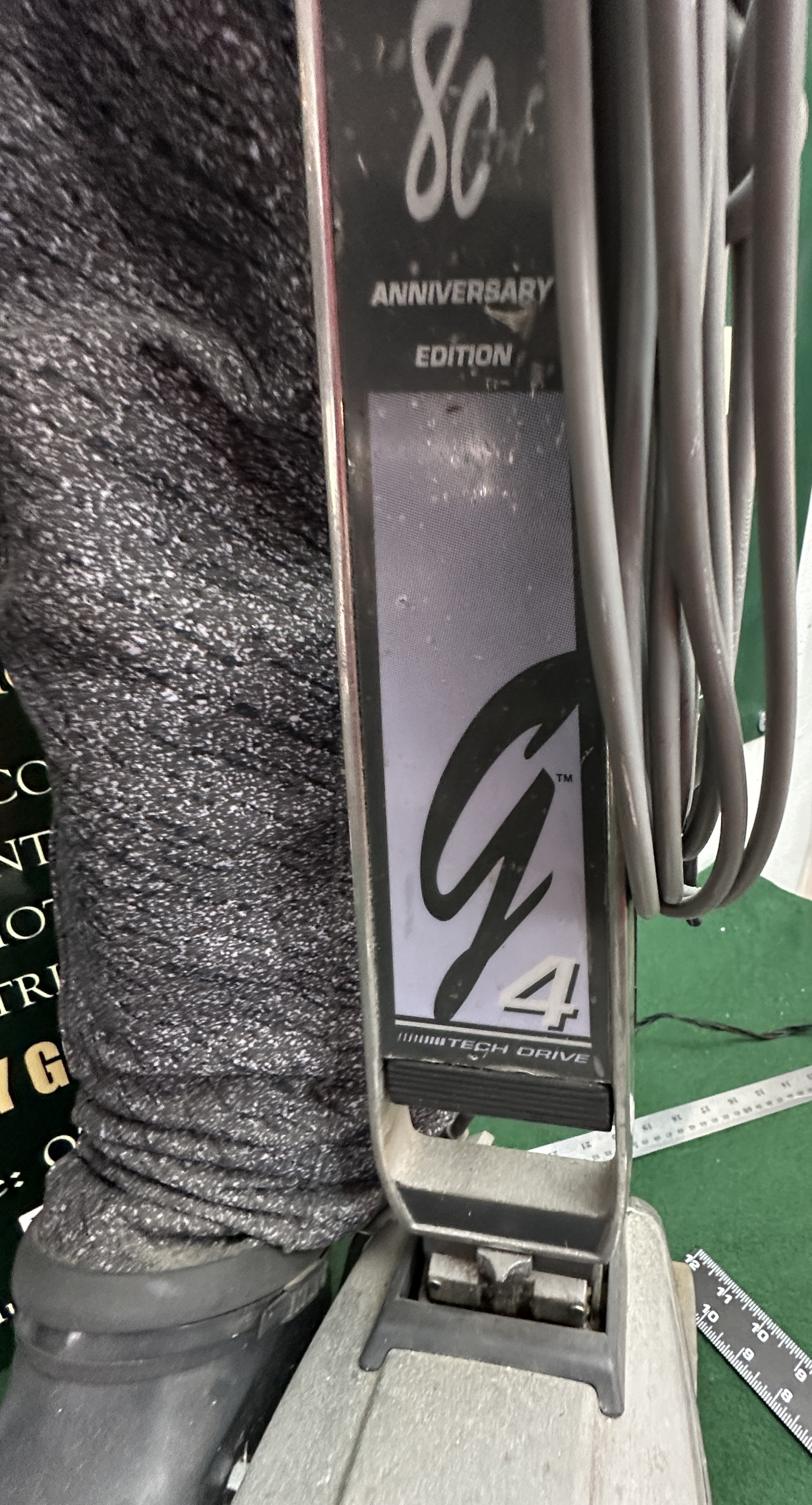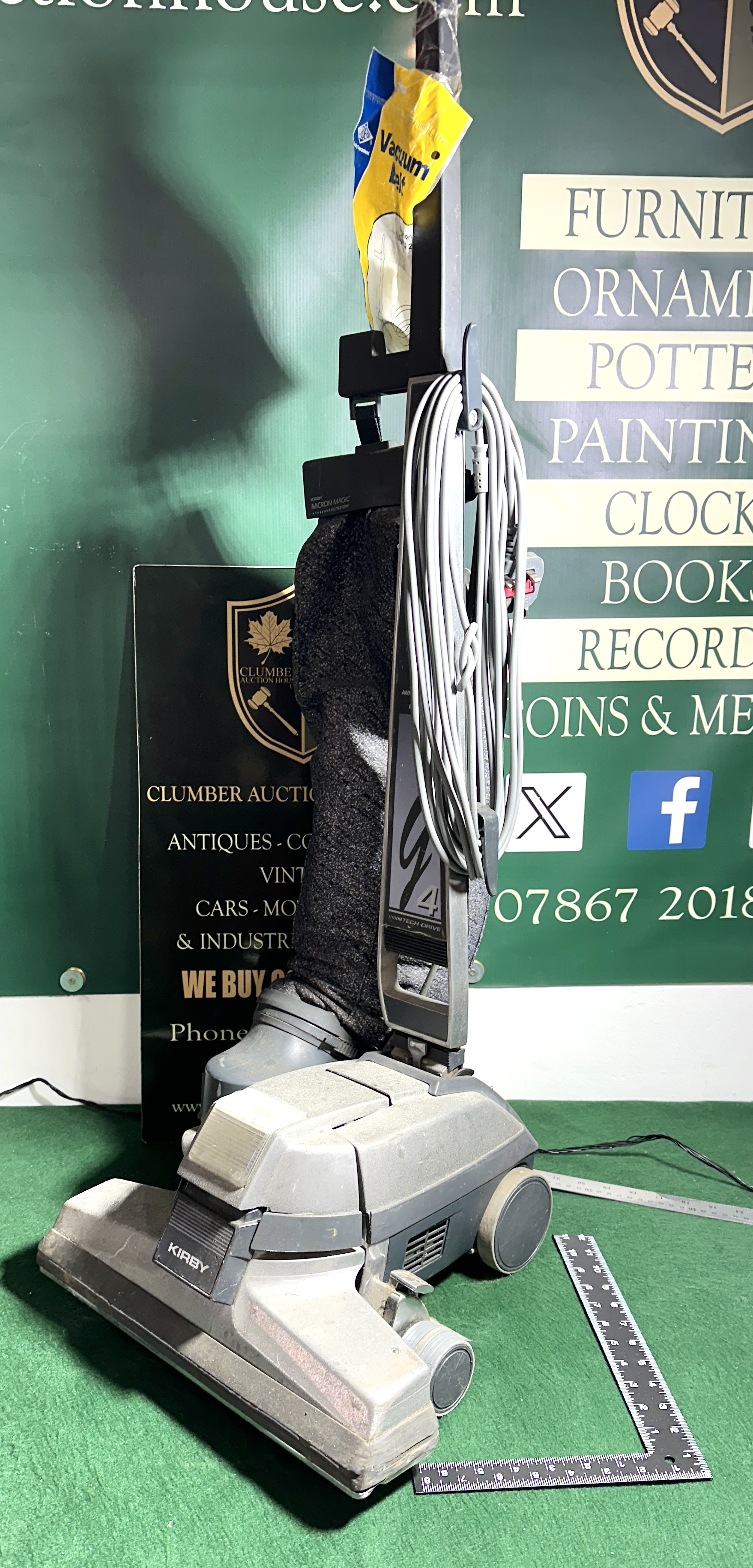 A Kirby G4 upright vacuum cleaner, identified by visible markings as the 80th Anniversary Edition. The unit is constructed with a light grey plastic and metal housing base supporting a dark grey textured cloth filter bag, often referred to as a body sock, which covers the handle assembly. Identifying text printed vertically on the main housing column includes 80th ANNIVERSARY EDITION, G4, and MICRON TECH DRIVE. The base unit features the embossed text KIRBY. A thick grey power cord is coiled around integrated storage hooks on the handle. A small yellow plastic bag labelled Vacuum Bags is secured near the handle. The unit is sold untested.