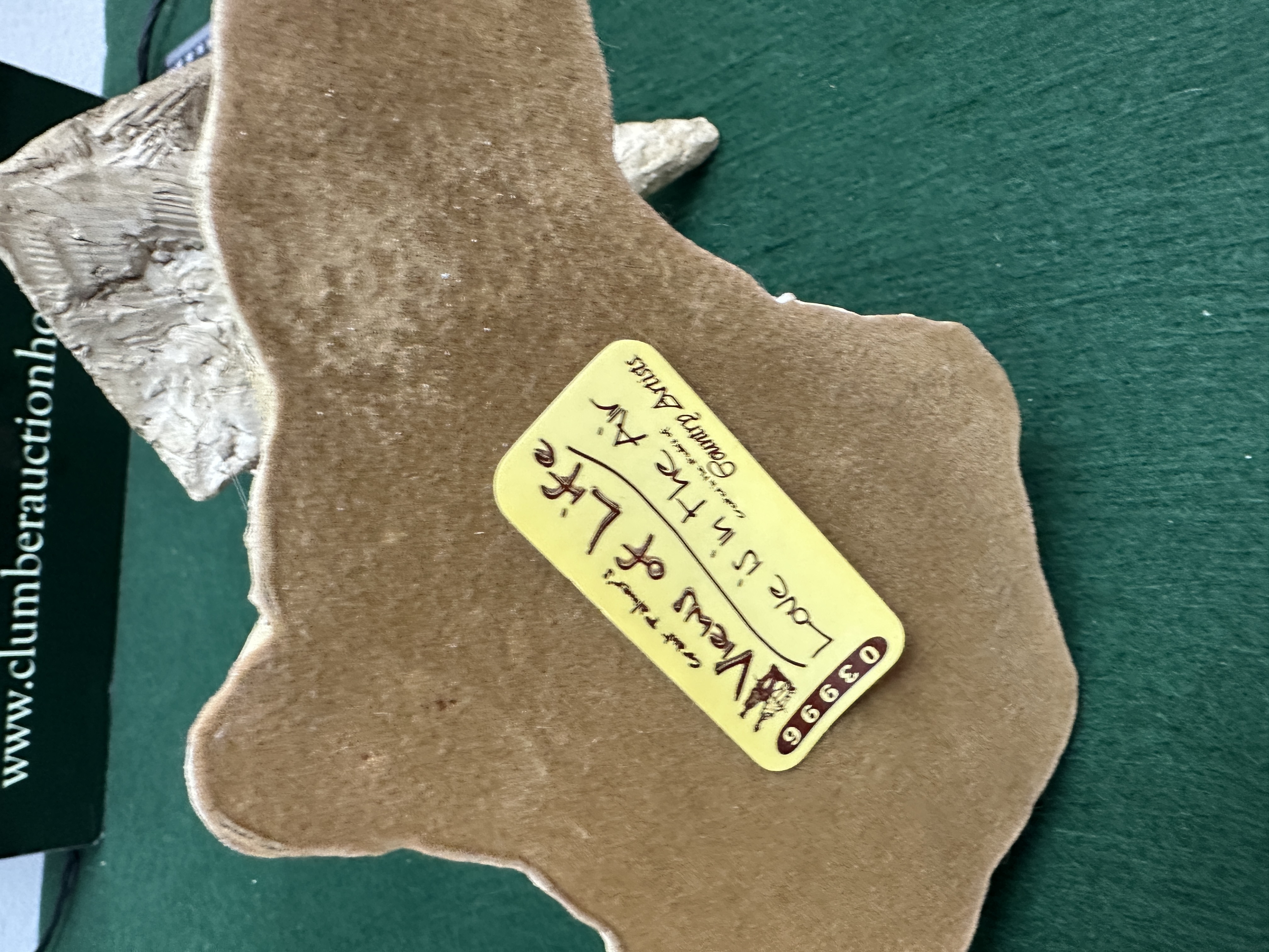 A single contemporary figural sculpture attributed to Country Artists, titled ‘Love Is In The Air’ from the ‘Views of Life’ collection. The piece is likely cast in painted resin, depicting a highly stylized female figure with exaggerated, elongated proportions. The figure is modelled wearing a textured reddish-pink suit jacket, a pearl necklace, and holds a patterned handbag. She stands upon an irregular, earthy-toned base. The underside of the base is covered in brown felt and bears a yellow identification sticker marked ‘Views of Life’, ‘Love Is In The Air’, ‘Country Artists’, and the item number 03996.