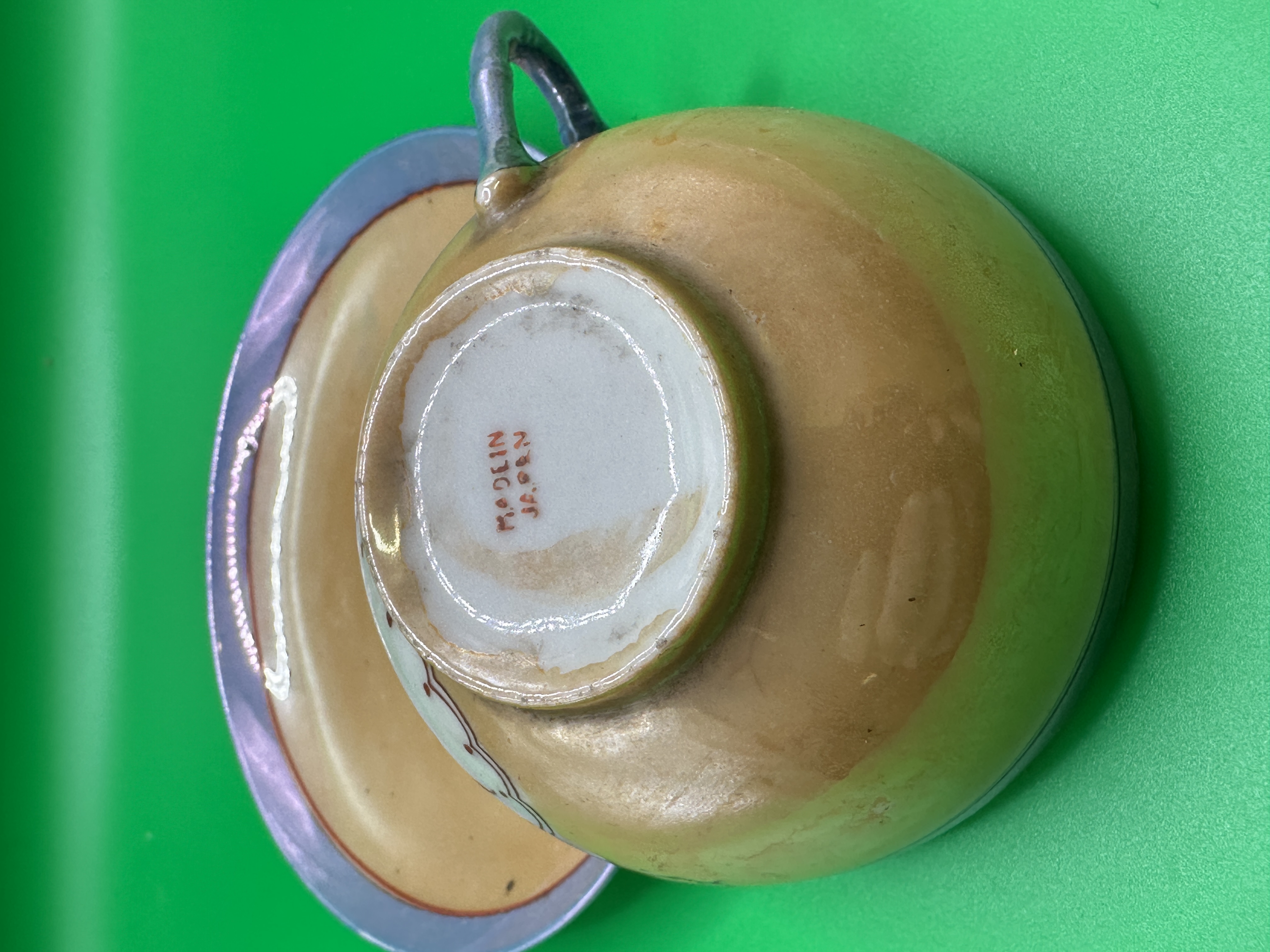 A pair of vintage Japanese porcelain lusterware tea cup and saucer set, likely dating to the early-to-mid 20th century. The set is constructed from thin porcelain. Both pieces feature polychrome enamel decoration depicting a blue bird and stylized floral and foliage motifs, outlined in black, set against a primary ground of pale yellow and pale green panels. The pieces are finished with a heavy application of silver luster to the rims and the cup handle, providing an iridescent quality typical of Japanese lusterware. The underside of the teacup bears a red, hand-painted mark reading “MADE IN JAPAN.”