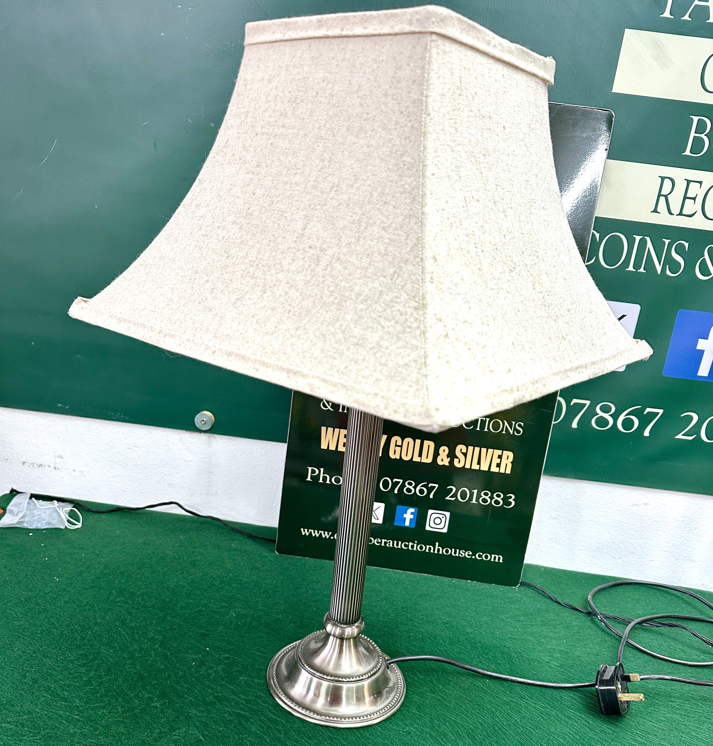 A single table lamp executed in a Classical or revival style, likely dating to the 20th century or later. The lamp features a tapered, square shade constructed from a light beige or cream textured fabric material. The base and stem are made of silver-toned metal. The cylindrical stem is detailed with vertical fluting or reeding, rising from a stepped, circular foot. The foot is further embellished with tiered moulding and a beaded rim detail. The lamp is fitted with a black electrical cord terminating in a UK-style three-pin plug.