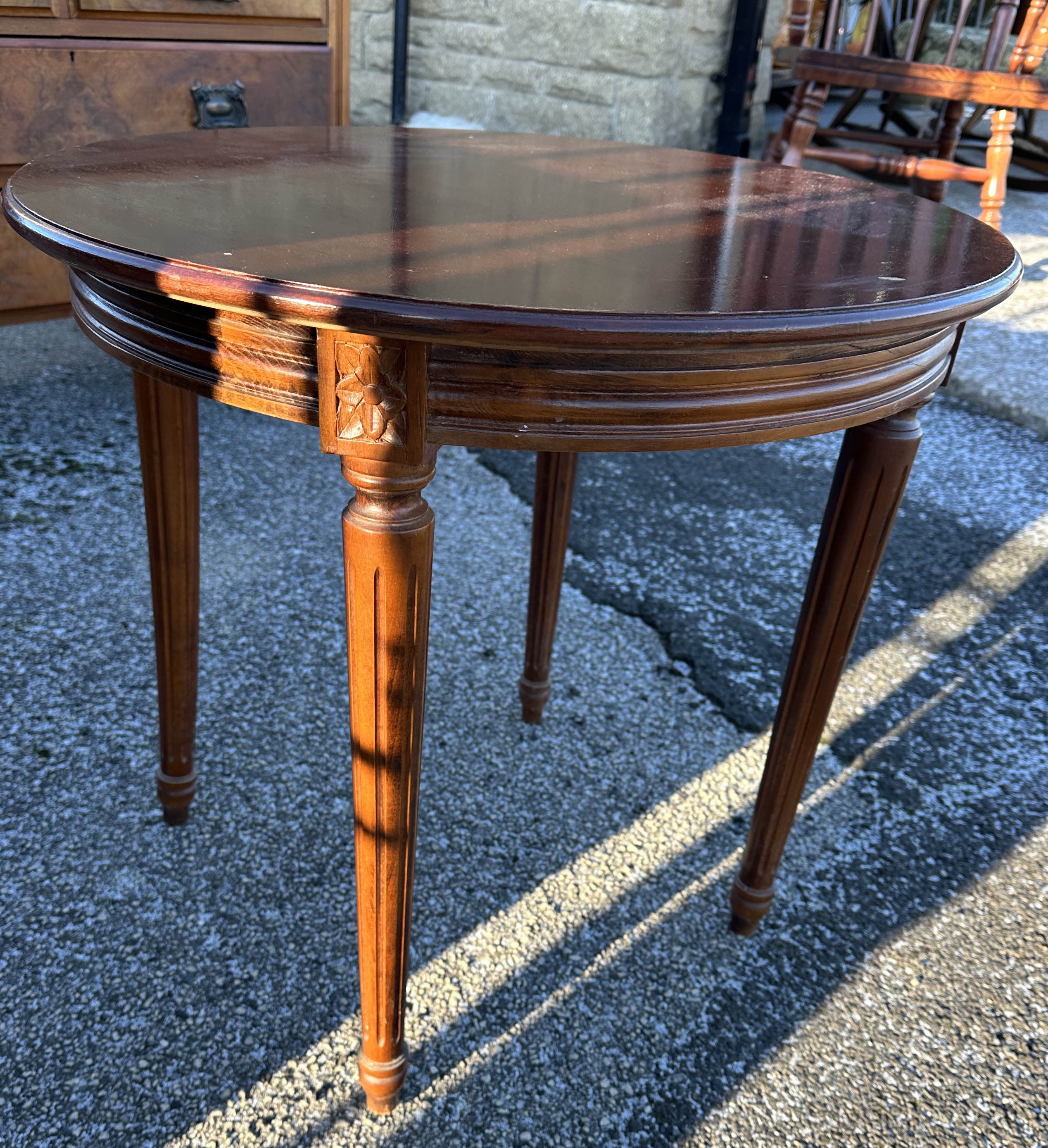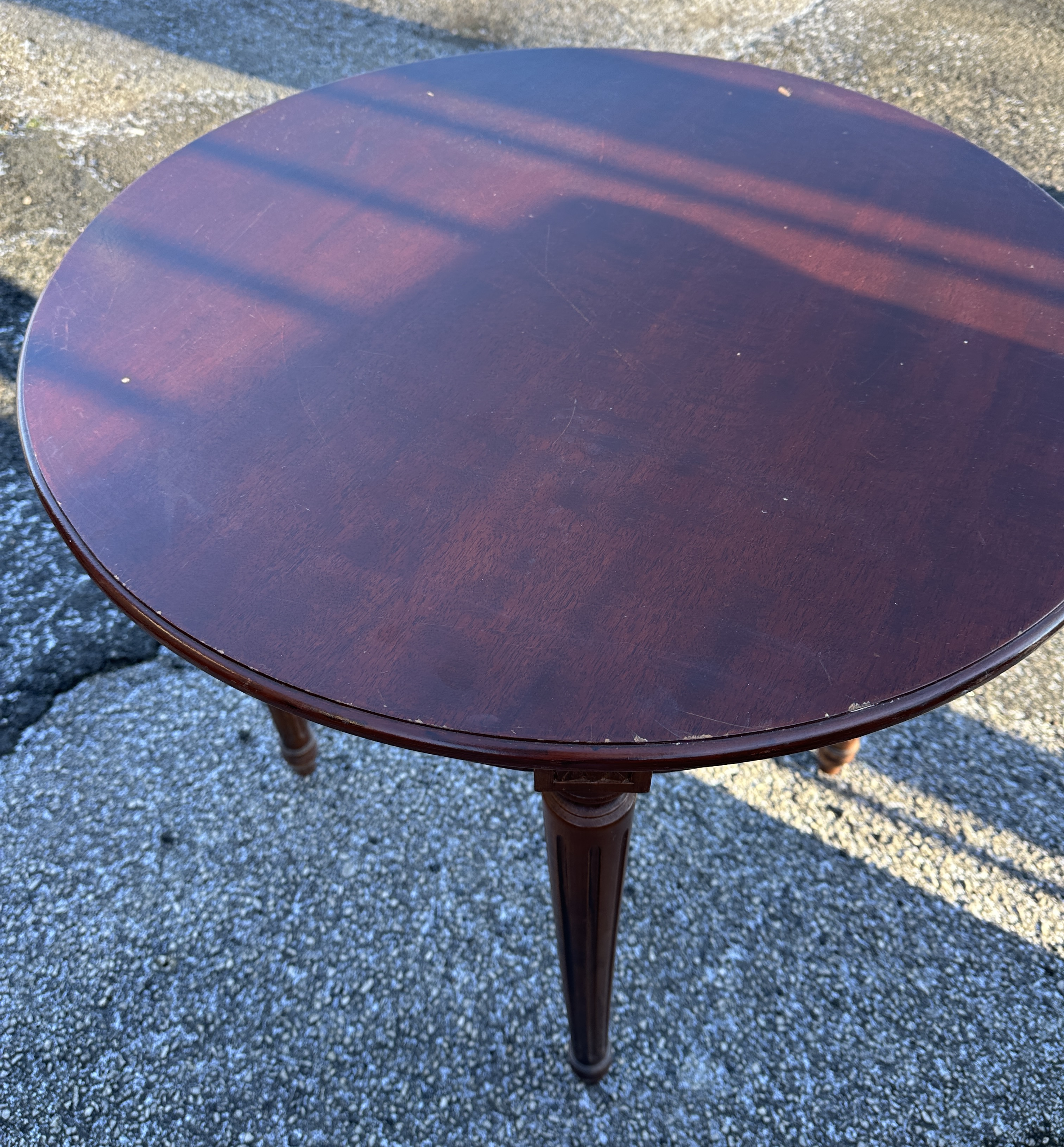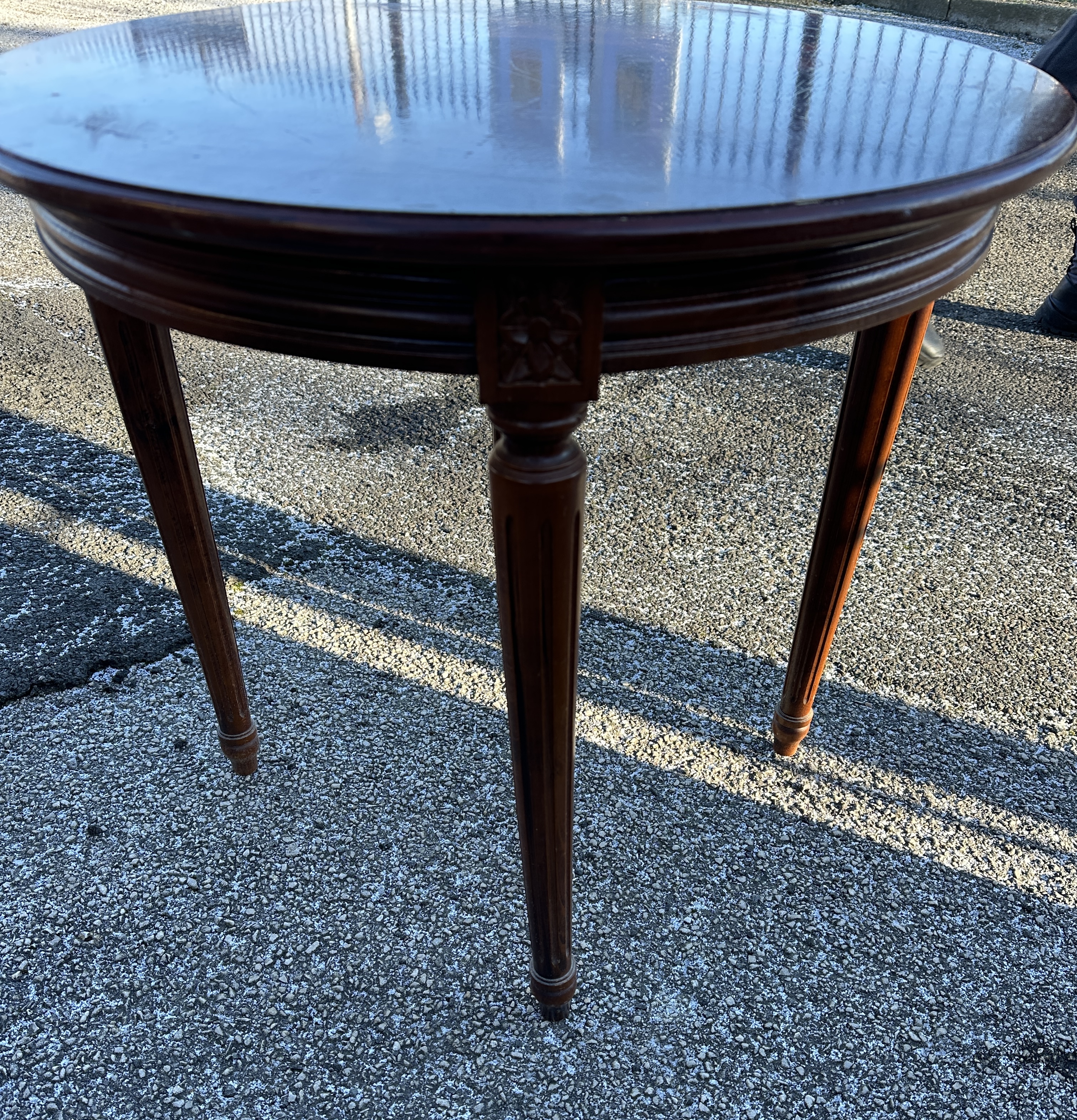 A single occasional table executed in the French Louis XVI style. Constructed of wood, finished in a dark reddish-brown mahogany stain with a high-gloss lacquer. The circular top sits above a deep frieze featuring multiple horizontal mouldings. The table is supported by four tapered, fluted legs, each junction adorned with a small carved block featuring a stylized classical or foliate motif. The legs are tapered and fluted, terminating in simple feet. While many comparable market examples of this style feature marble tops and bronze mounts, this piece retains its finished wood top. No visible manufacturer markings or inscriptions are present.